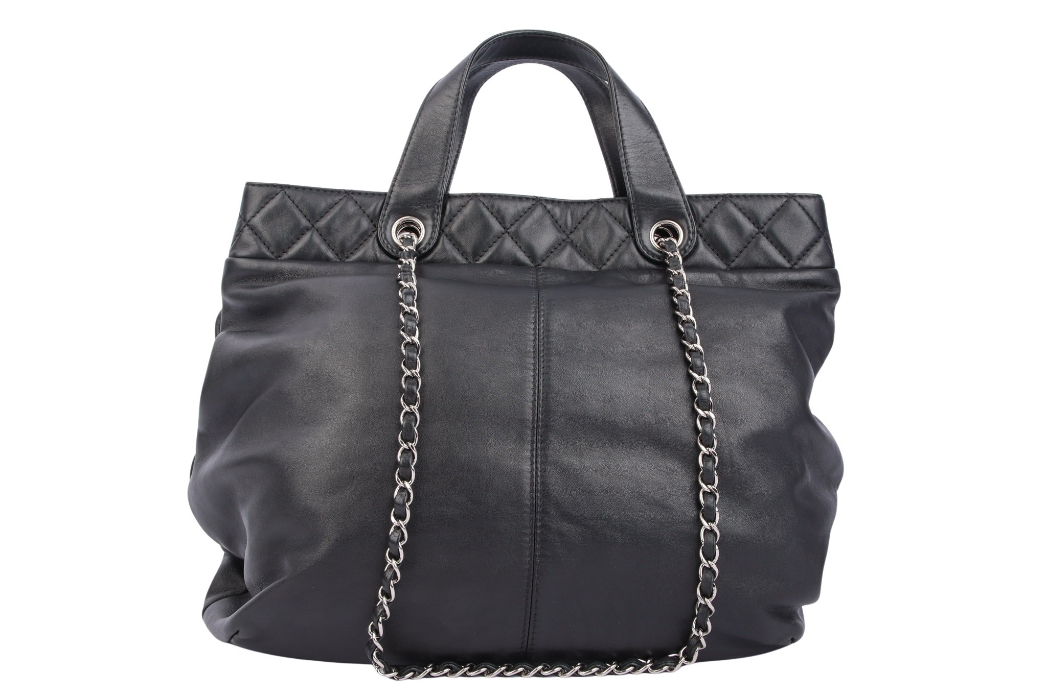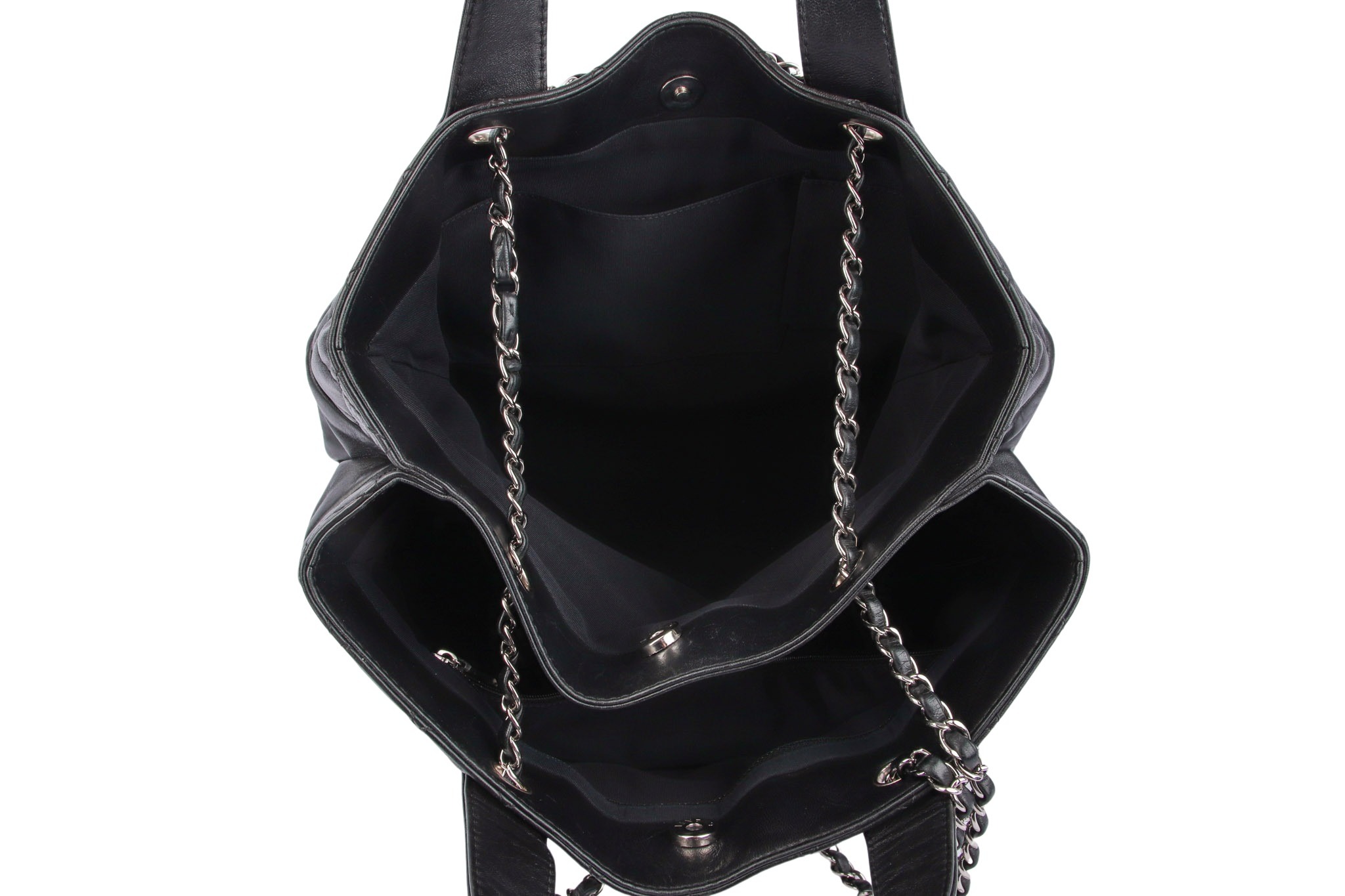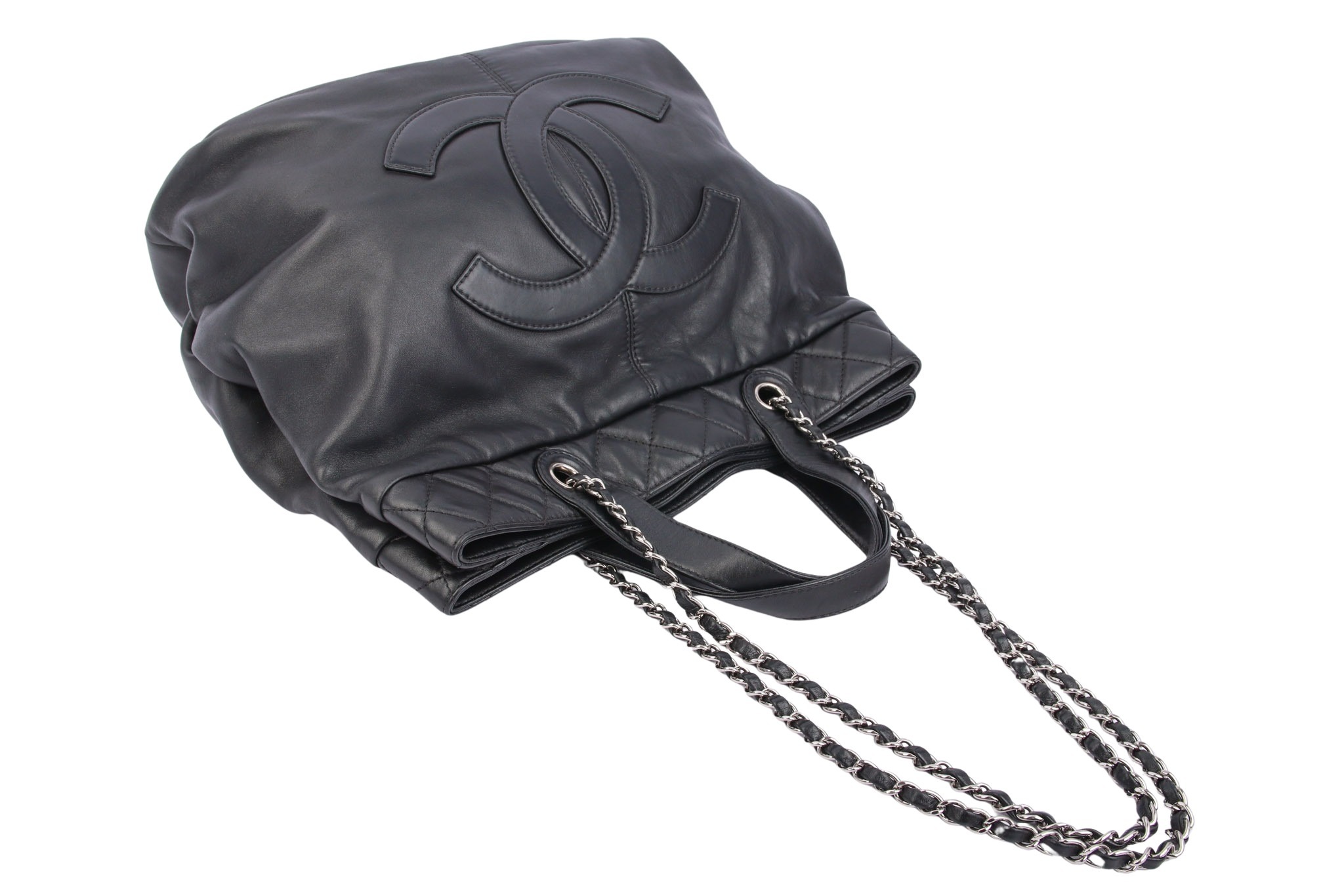 Der Chanel Shopper aus edlem schwarzem Leder verkörpert zeitlose Eleganz und luxuriöse Alltagstauglichkeit. Gefertigt aus hochwertigem, fein genarbtem Kalbsleder, besticht diese Tasche durch ihre klare Linienführung und das unverwechselbare CC-Logo auf der Vorderseite – ein Symbol für Pariser Stil und Raffinesse.