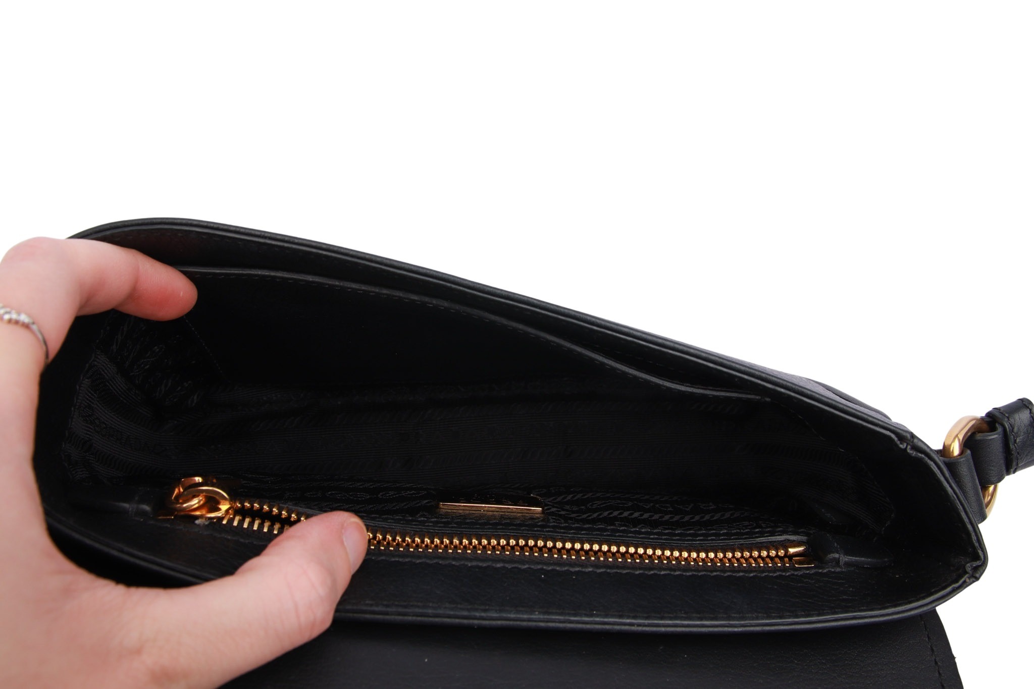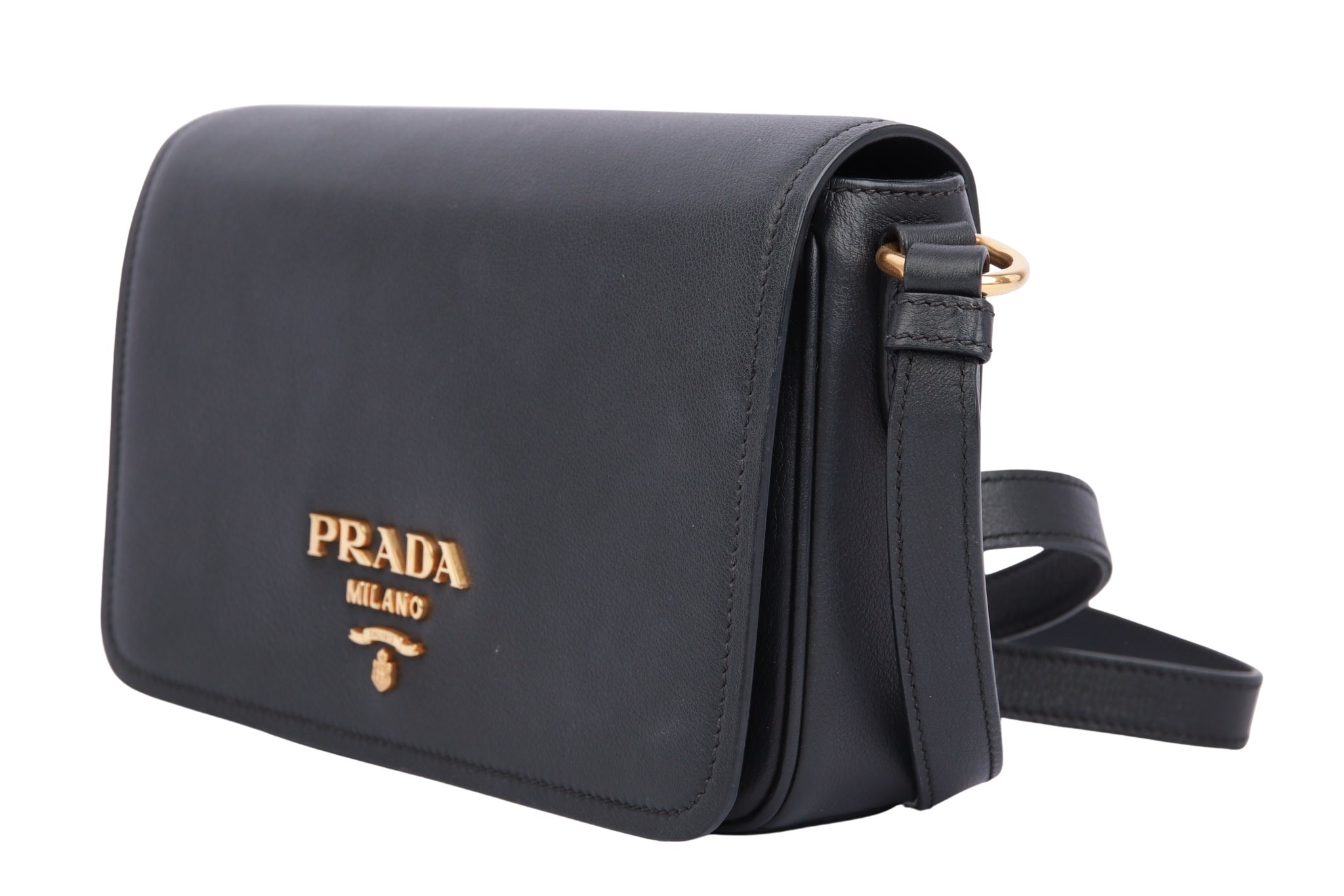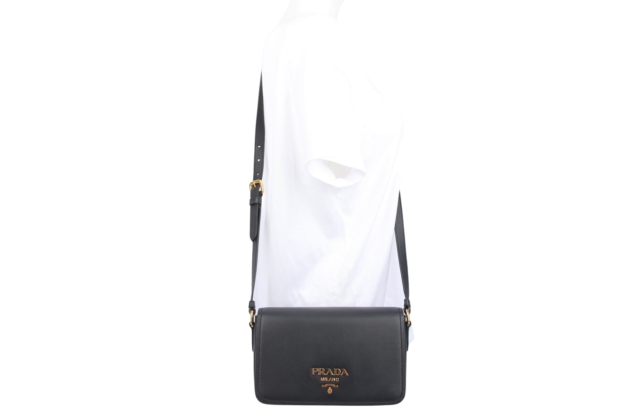 Prada Vitello Flap Schwarz. Elegante, kompakte Handtasche aus schwarzem Vitello-Leder. Überschlag mit Verschluss, innen mehrere Fächer für Essentials.