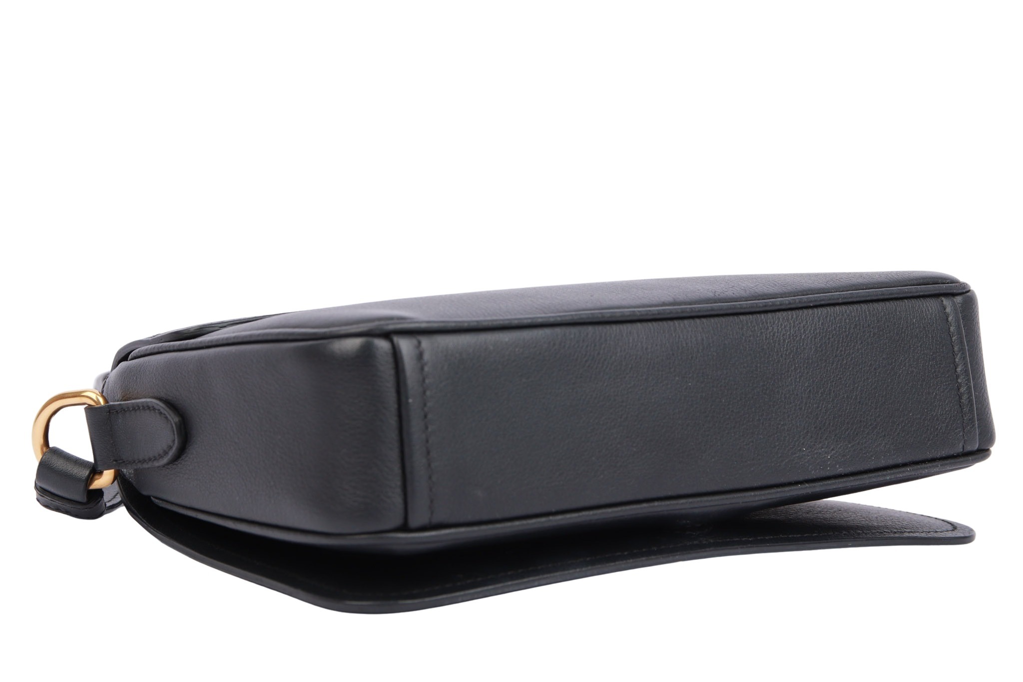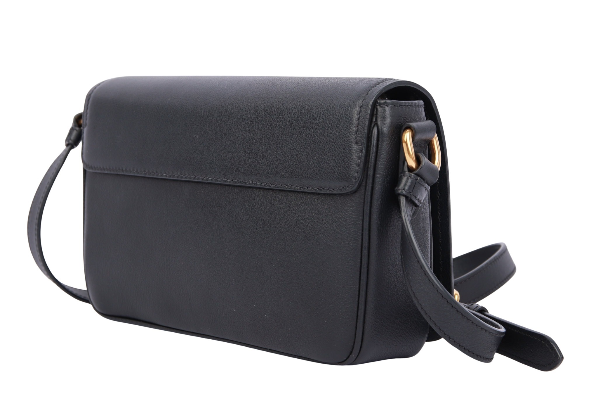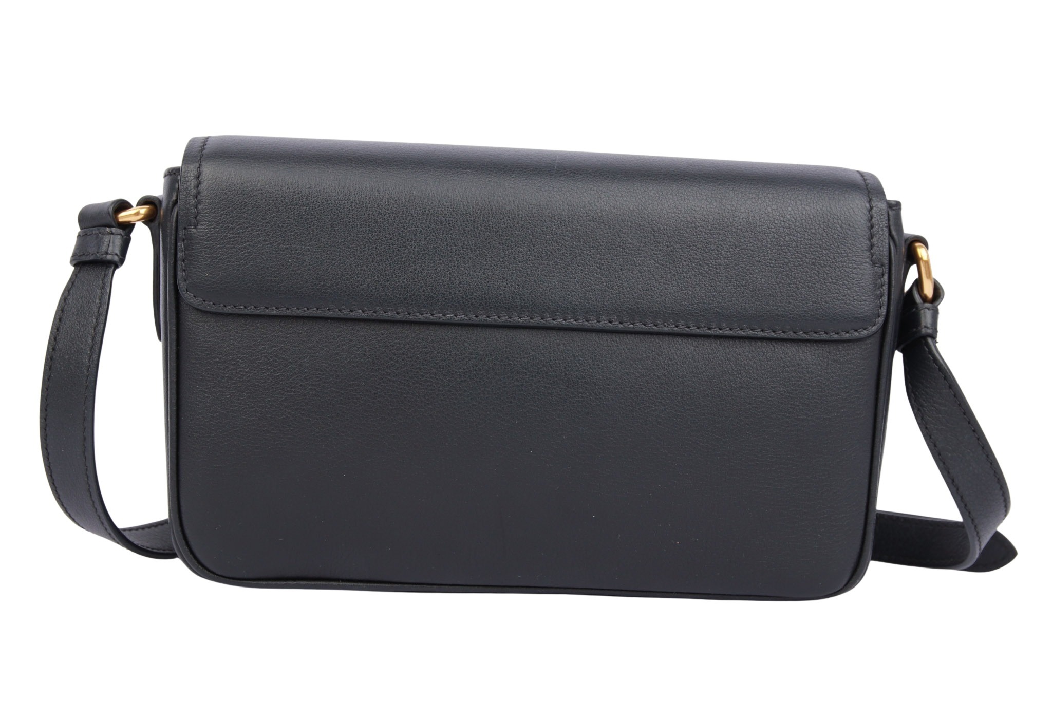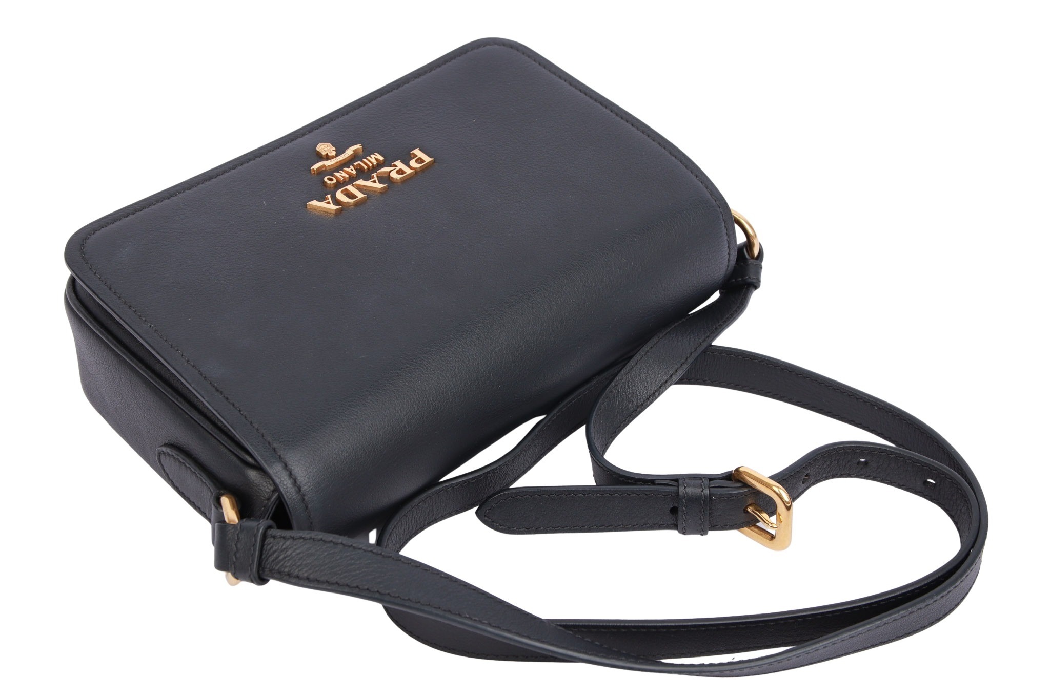 Prada Vitello Flap Schwarz. Elegante, kompakte Handtasche aus schwarzem Vitello-Leder. Überschlag mit Verschluss, innen mehrere Fächer für Essentials.