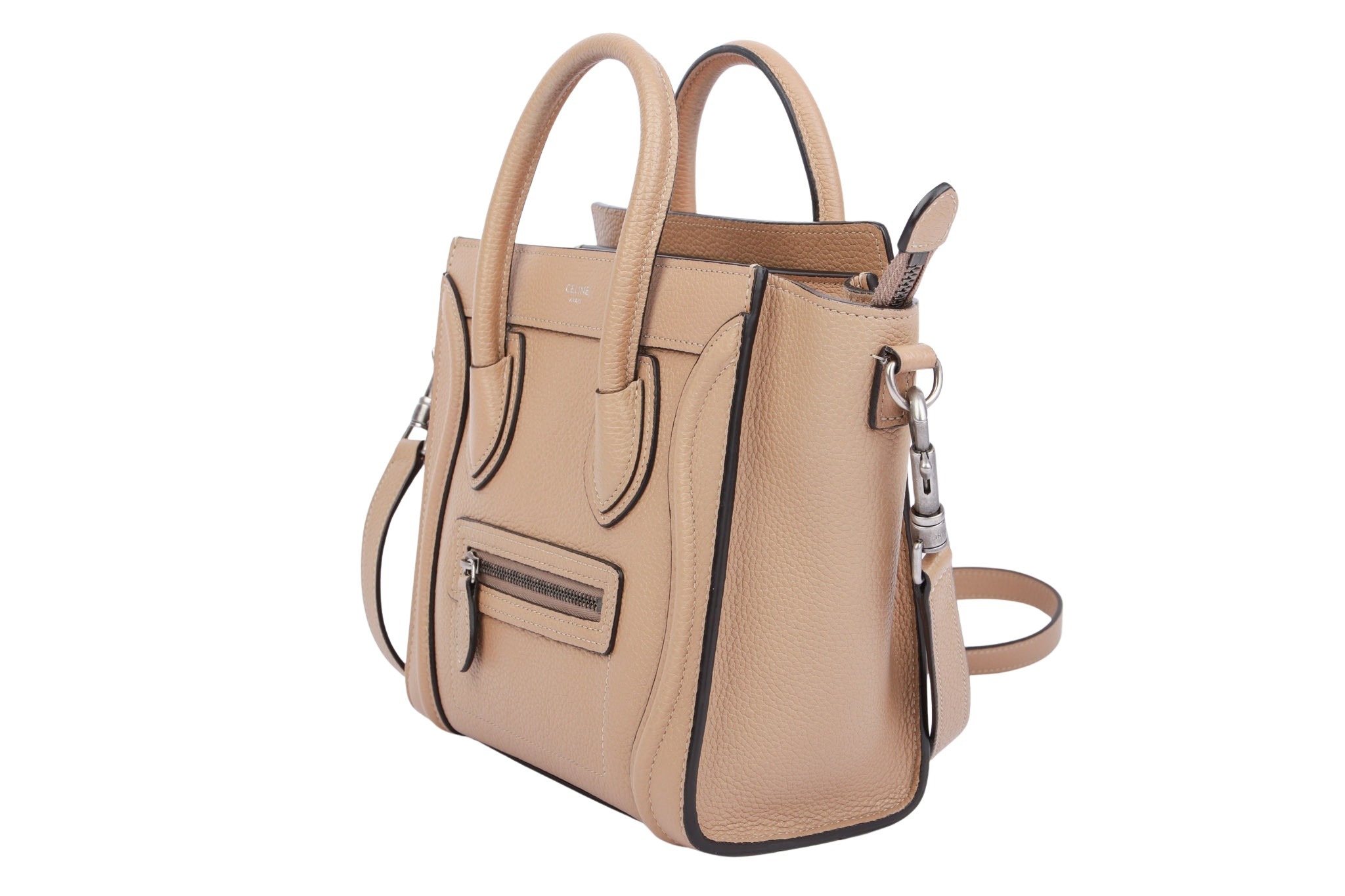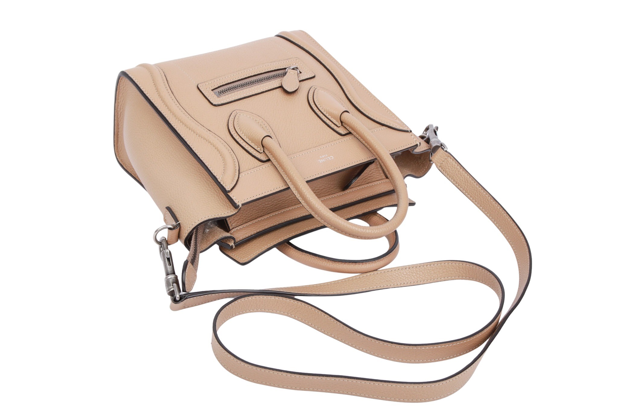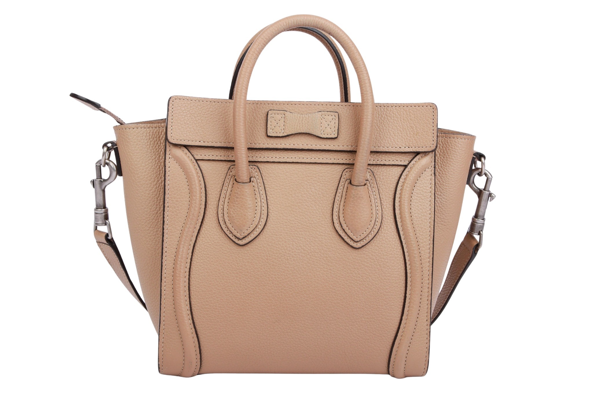 Die Céline Luggage ist eine elegante, kompakte Handtasche aus hochwertigem Leder in einem weichen Beigeton. Mit ihrem ikonischen Design, das die charakteristische "smiley" Frontpartie umfasst, ist sie sowohl praktisch als auch stilvoll. Die Tasche bietet Platz für essentielle Gegenstände und kann mit den oberen Griffen getragen werden. Ein klassisches Accessoire für jeden Tag, das aufgrund seiner Neutralität vielseitig kombinierbar ist.