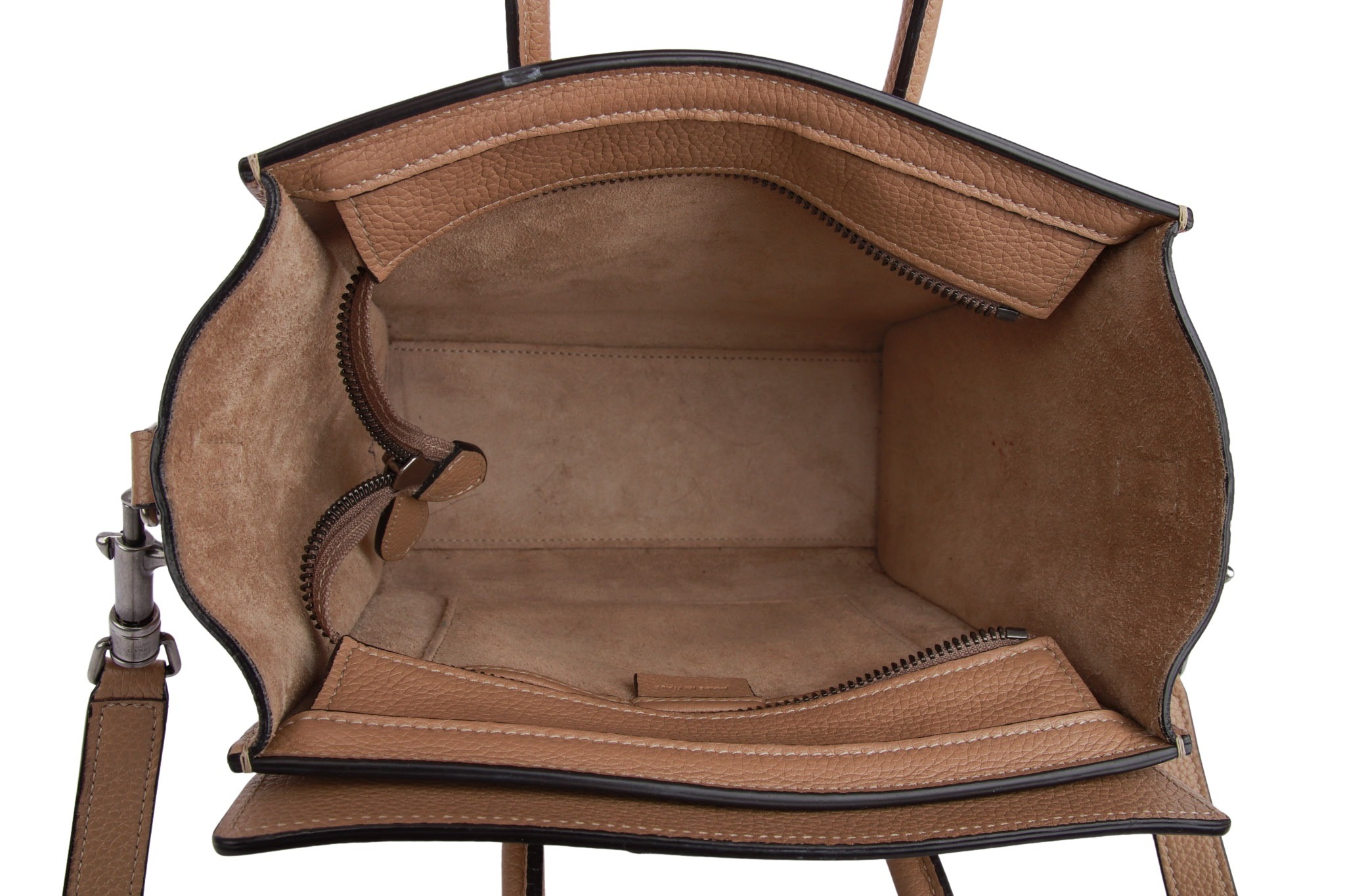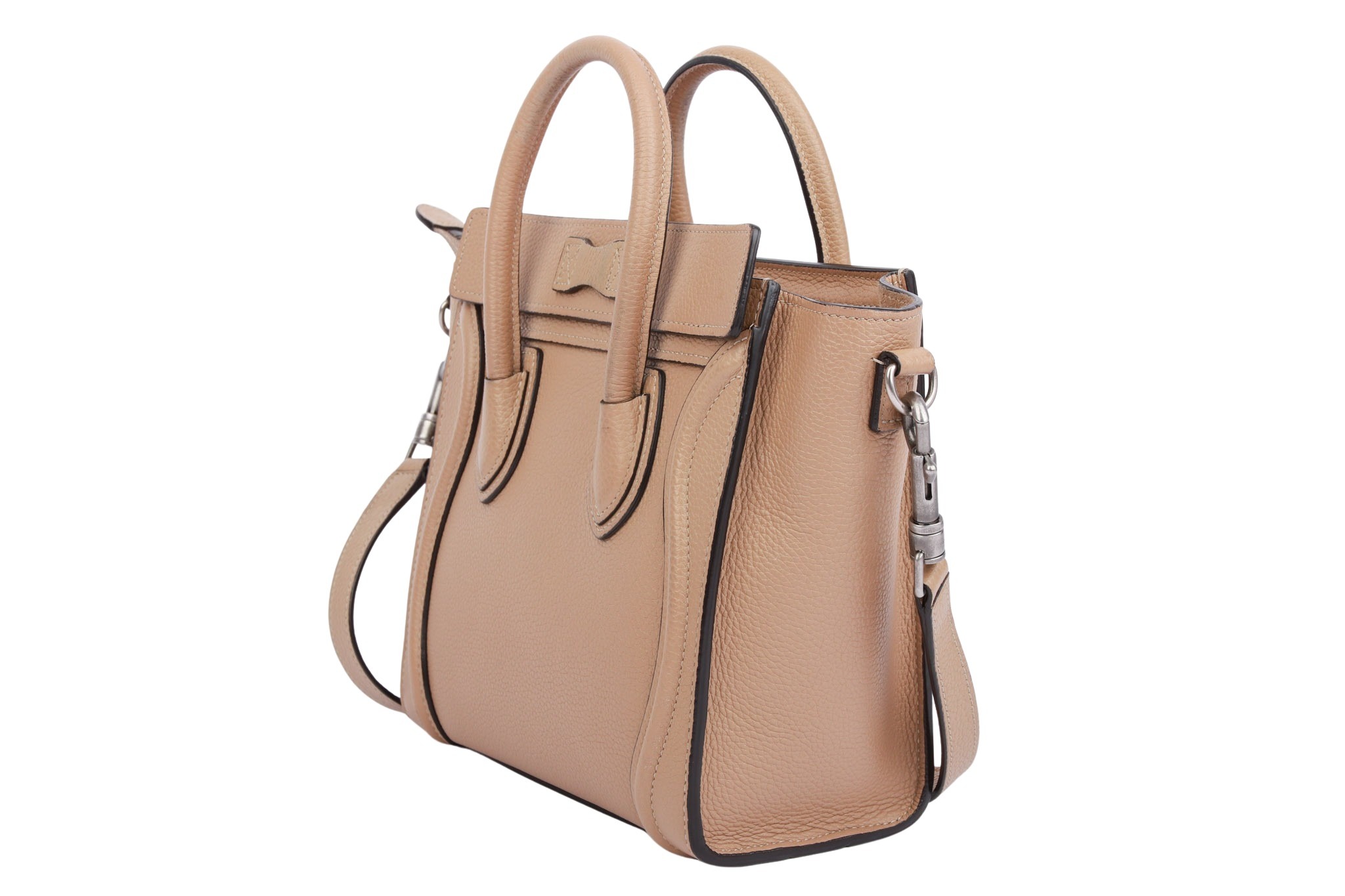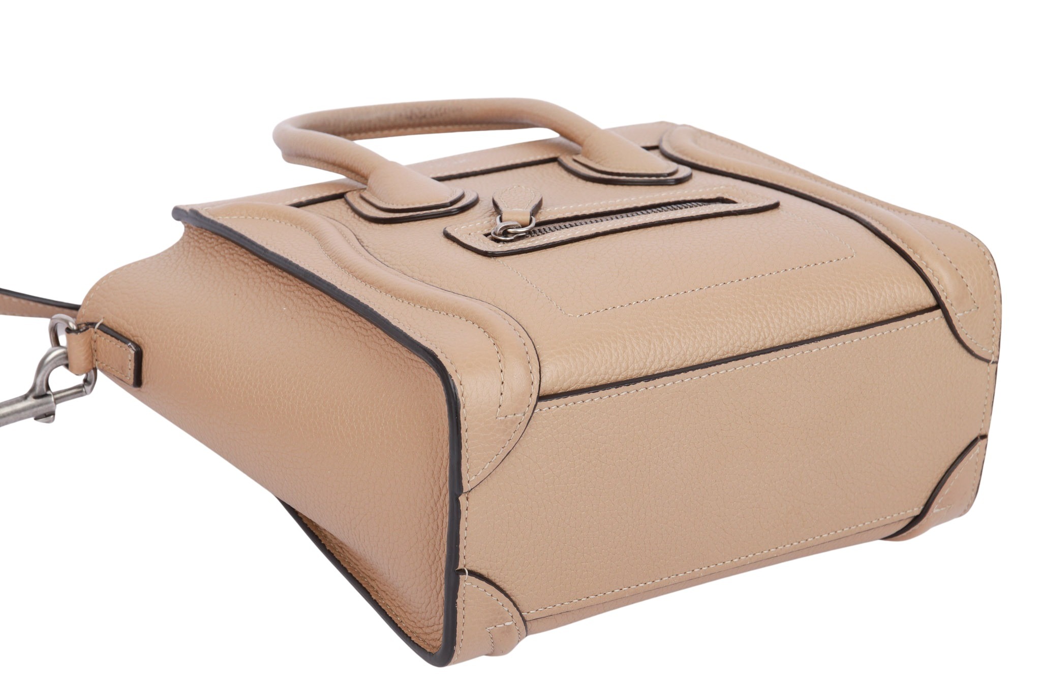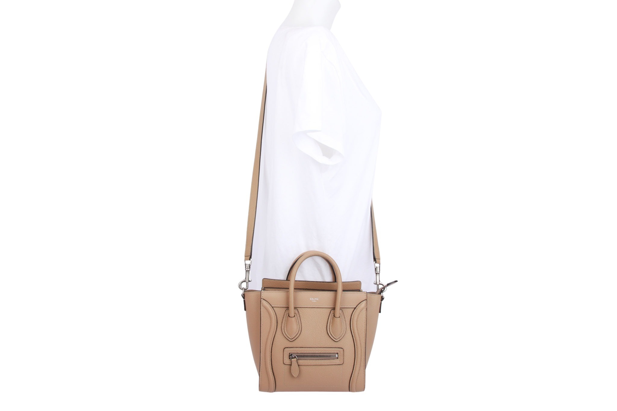 Die Céline Luggage ist eine elegante, kompakte Handtasche aus hochwertigem Leder in einem weichen Beigeton. Mit ihrem ikonischen Design, das die charakteristische "smiley" Frontpartie umfasst, ist sie sowohl praktisch als auch stilvoll. Die Tasche bietet Platz für essentielle Gegenstände und kann mit den oberen Griffen getragen werden. Ein klassisches Accessoire für jeden Tag, das aufgrund seiner Neutralität vielseitig kombinierbar ist.