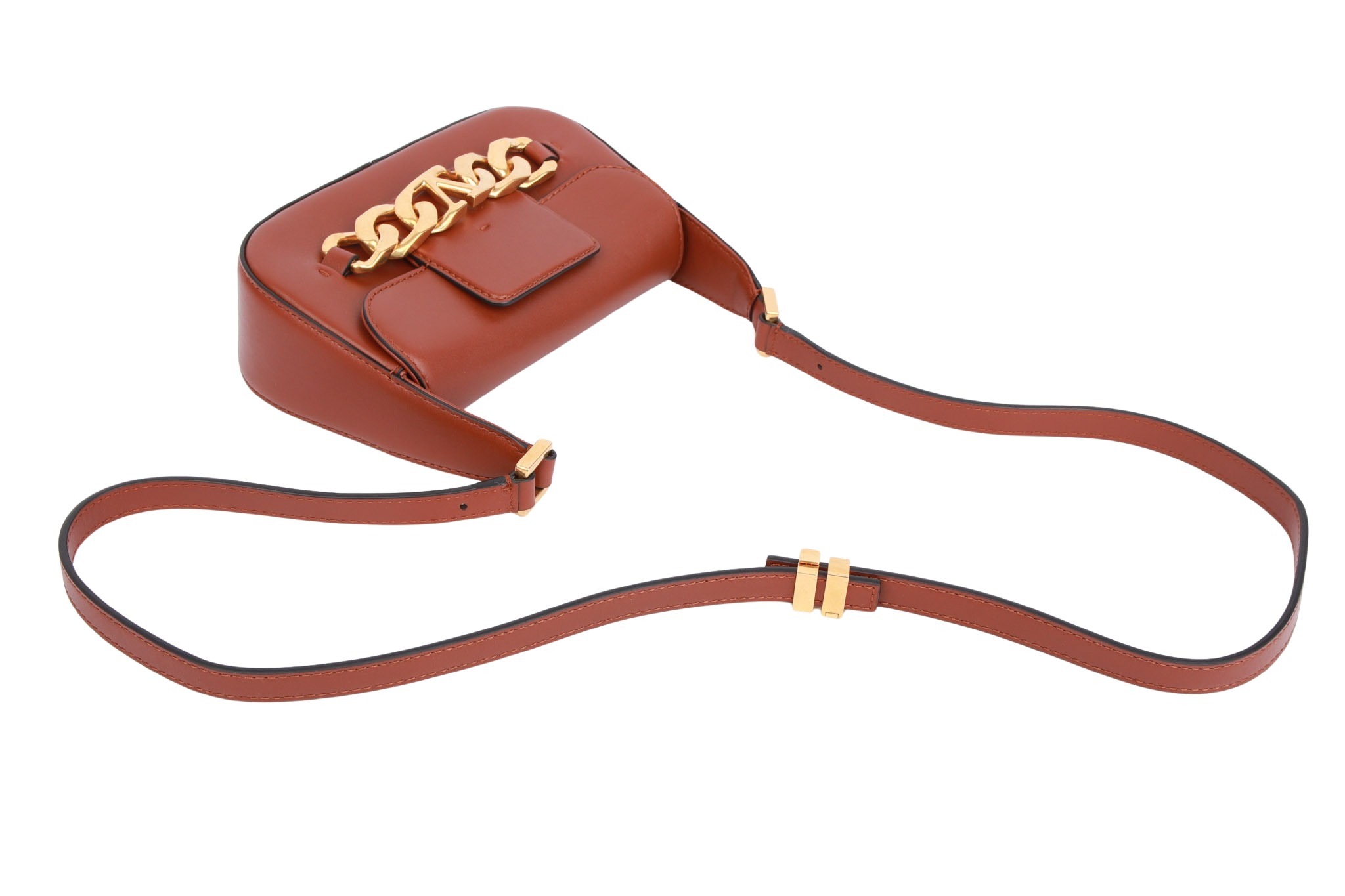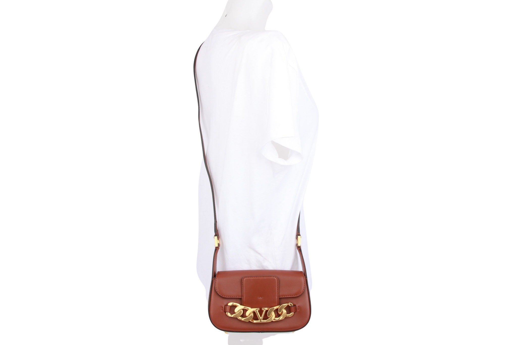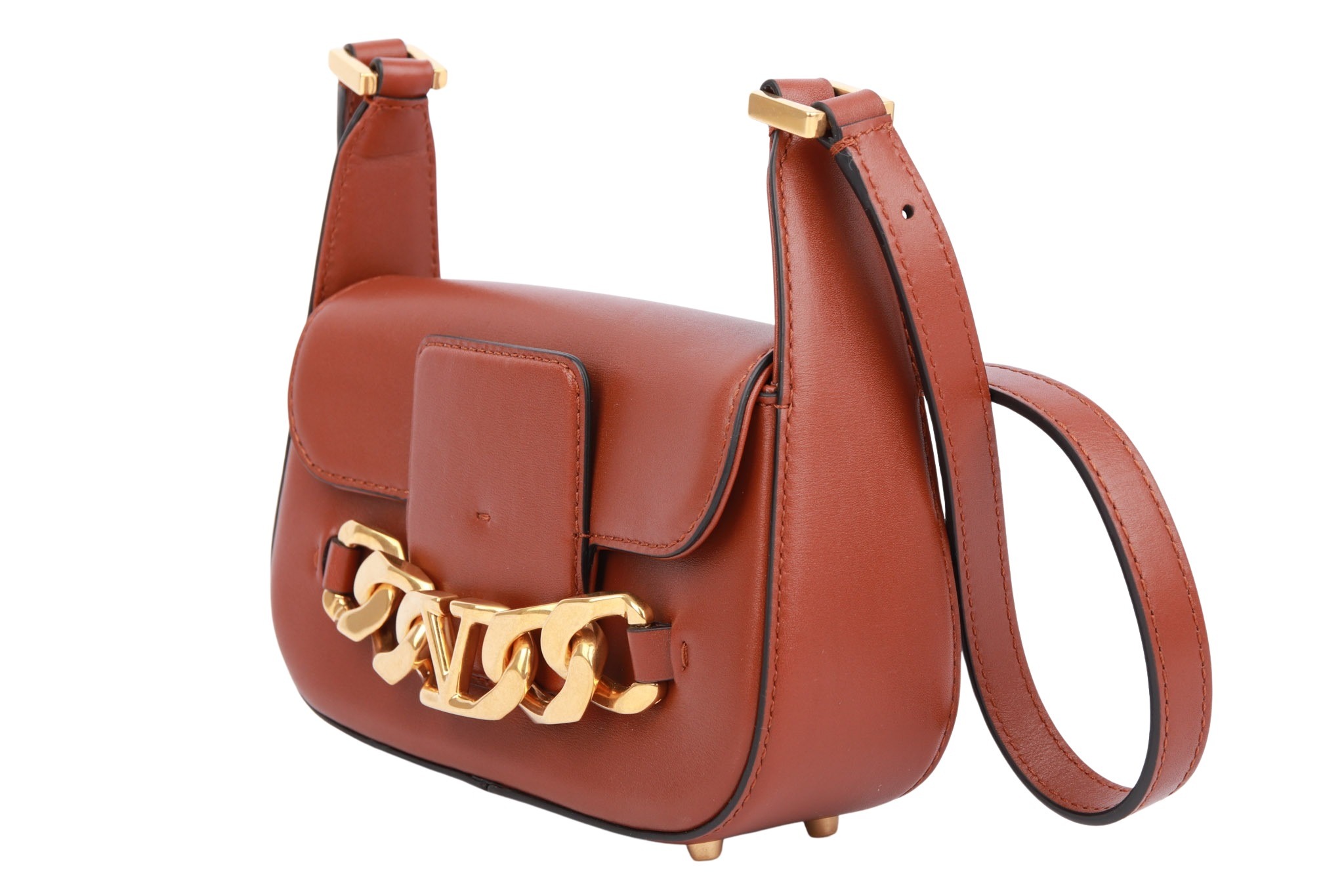Elegante Leder-Schultertasche mit markantem V‑Logo, kompakter Form und verstellbarem Riemen – luxuriös und zeitlos.