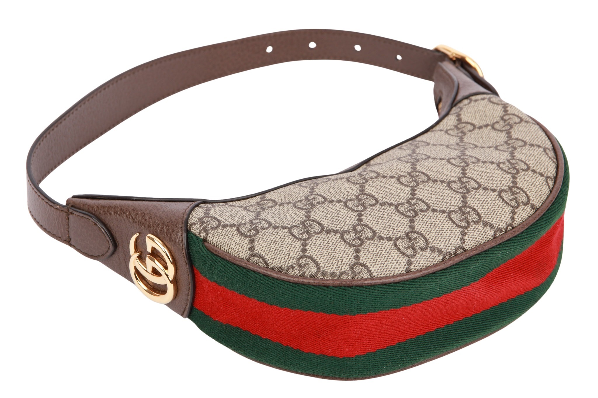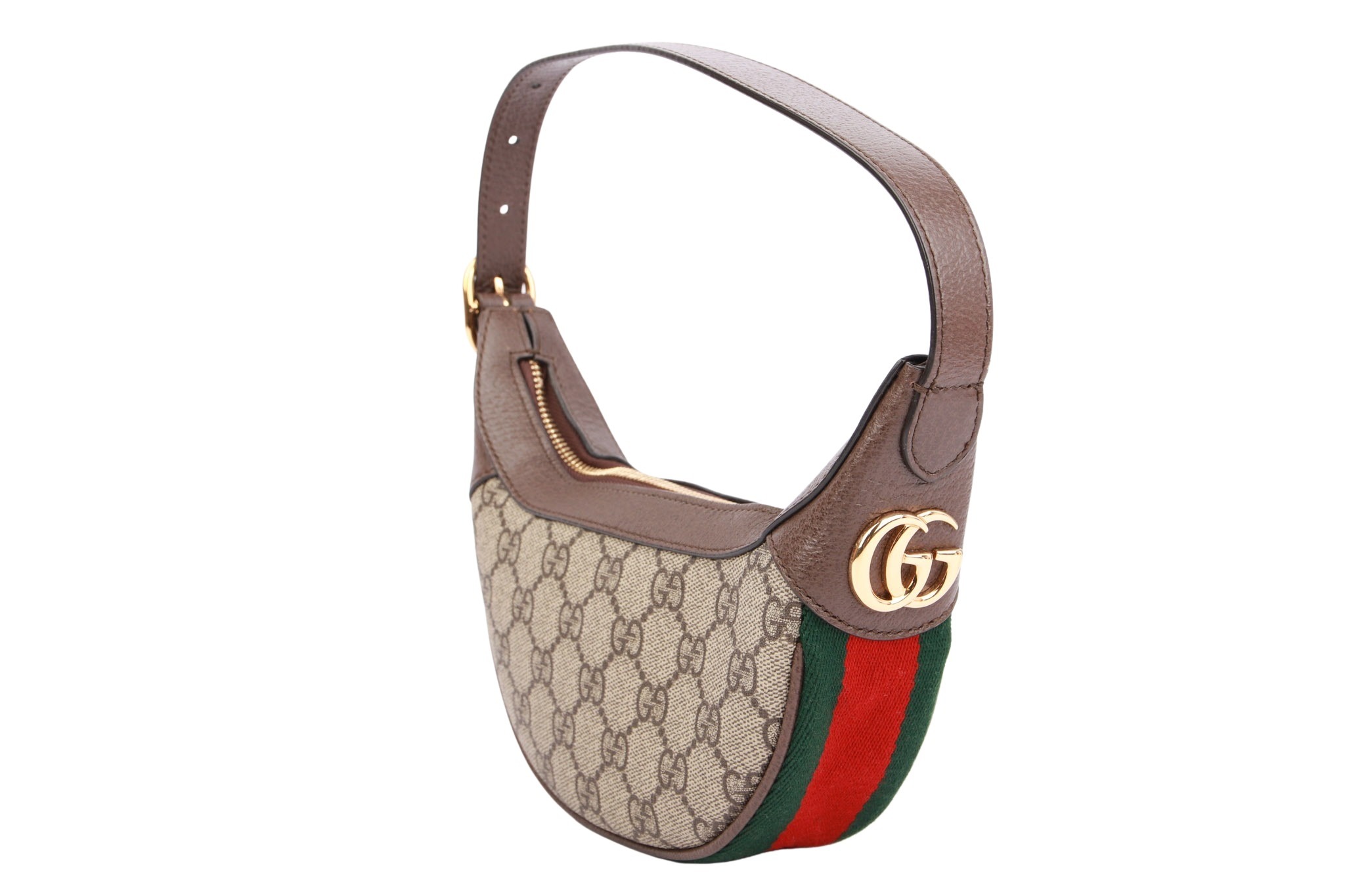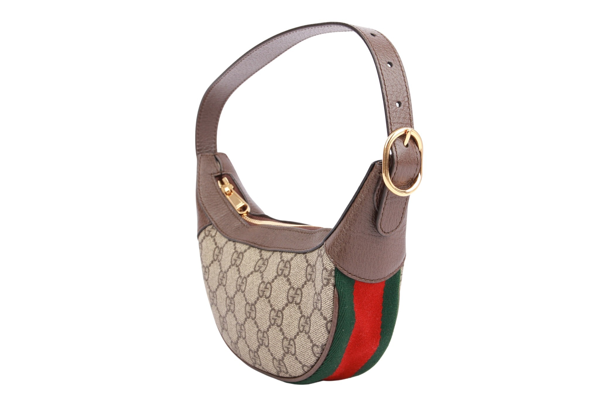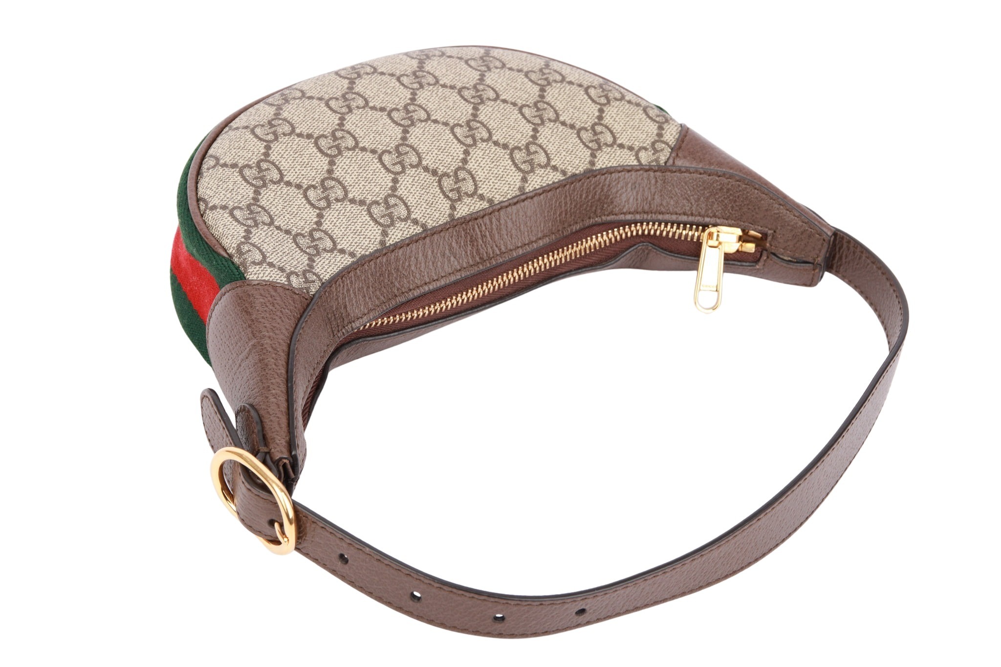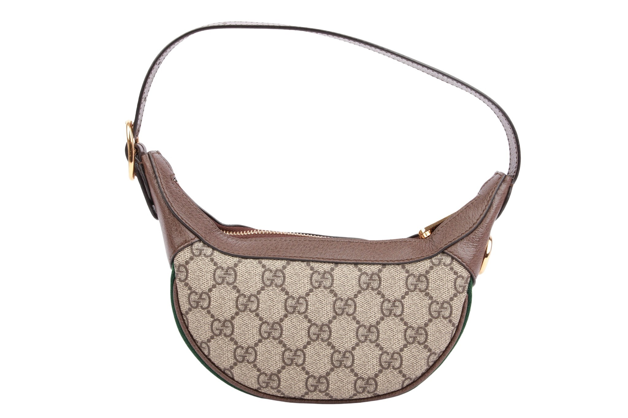 Die kleine Gucci Ophidia Schultertasche in Beige Canvas kombiniert klassisches GG-Supreme-Material mit eleganten Lederdetails. Ihr kompaktes Design und die goldfarbenen Akzente verleihen ihr einen zeitlosen, luxuriösen Look.