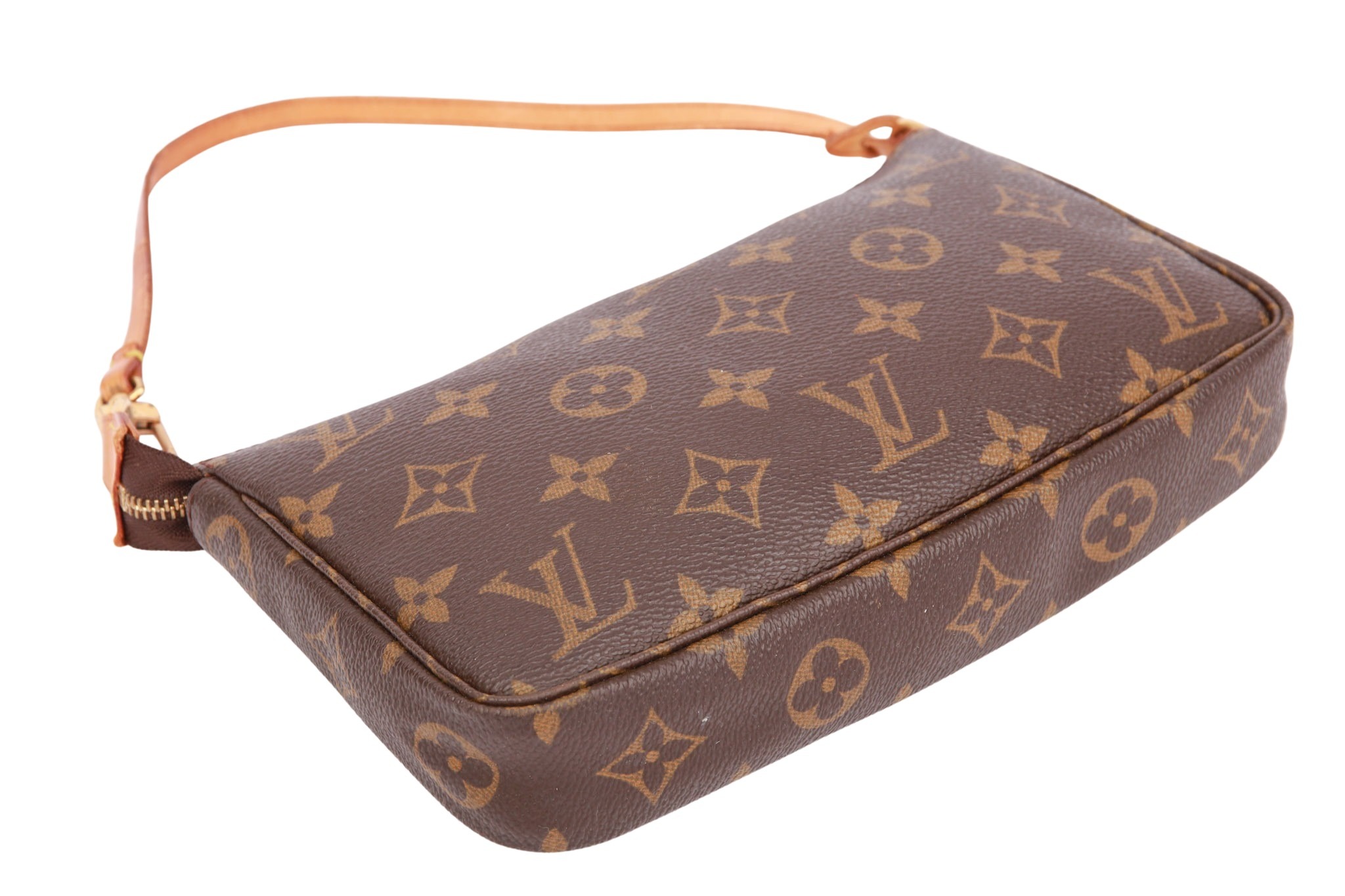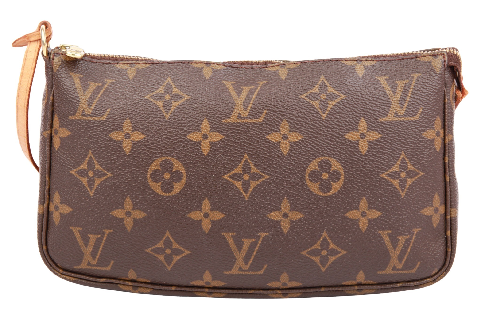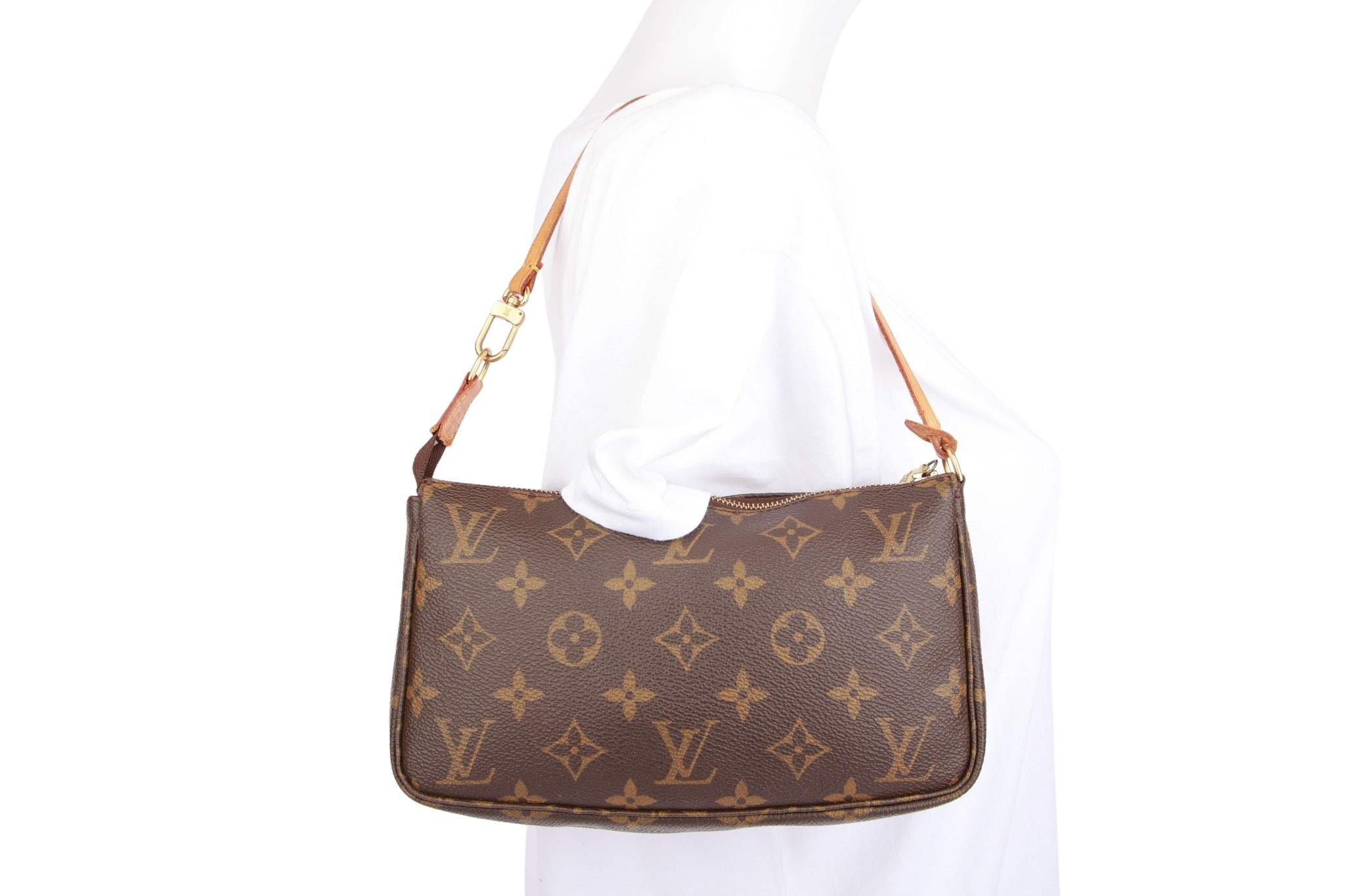 Die Louis Vuitton Pochette Monogram Canvas ist eine kompakte und vielseitige Tasche, die sich ideal für den Alltag oder den Abend eignet. Gefertigt aus dem ikonischen Monogram Canvas mit natürlichen Lederdetails, kombiniert sie zeitlosen Stil mit praktischer Funktion. Trotz ihrer handlichen Größe bietet sie Platz für das Wesentliche – wie Handy, Schlüssel und Kosmetik. Die Pochette kann als Clutch getragen, am Handgelenk geführt oder dank des abnehmbaren Riemens auch an größeren Taschen befestigt werden. Ein echtes Must-have, das sowohl einzeln als auch als Ergänzung zu anderen Louis Vuitton Taschen.