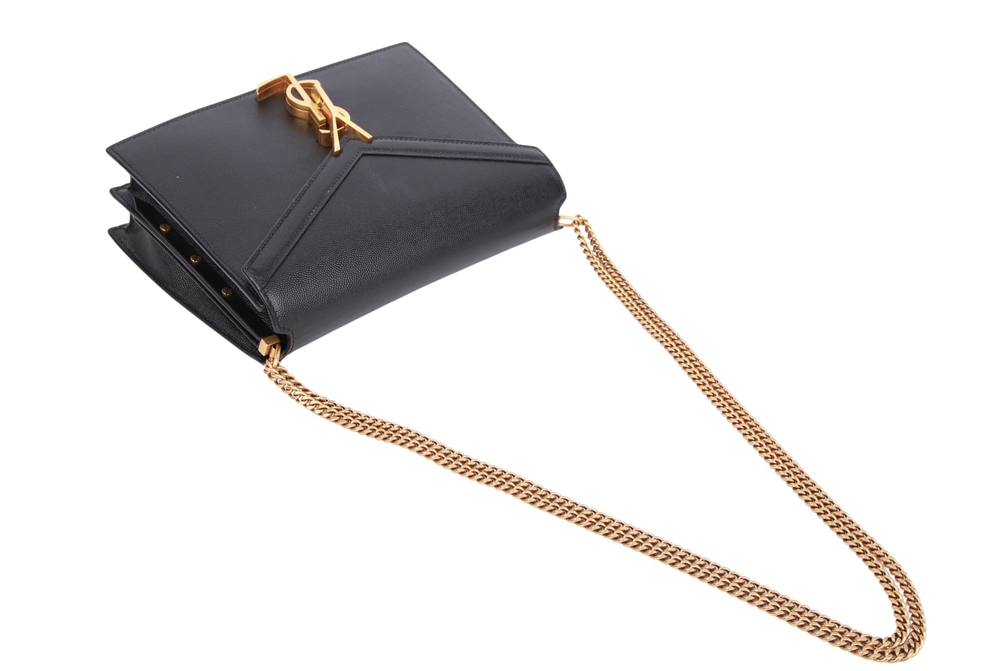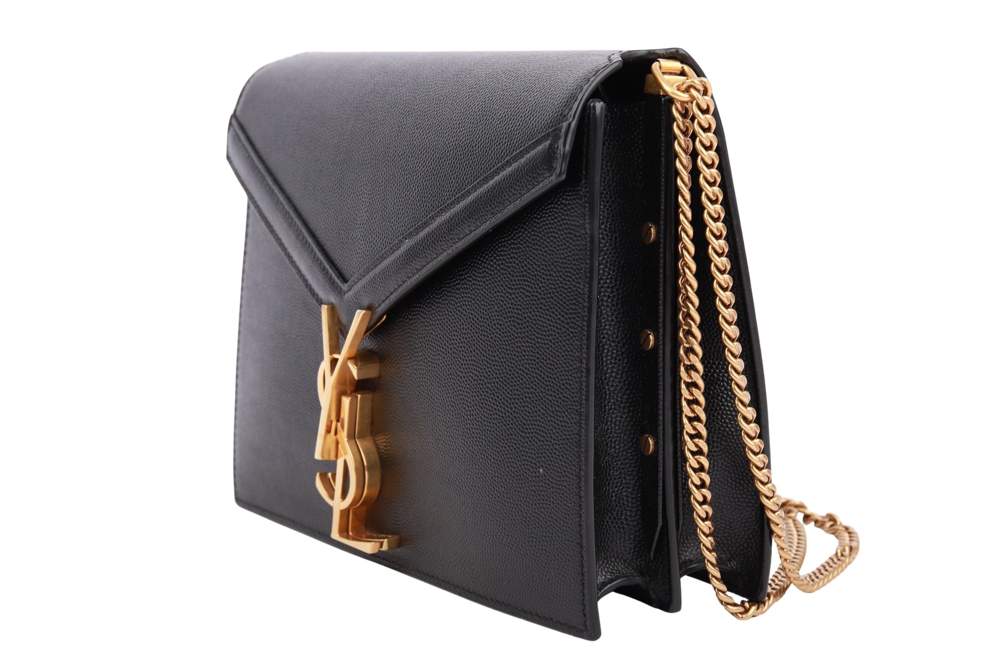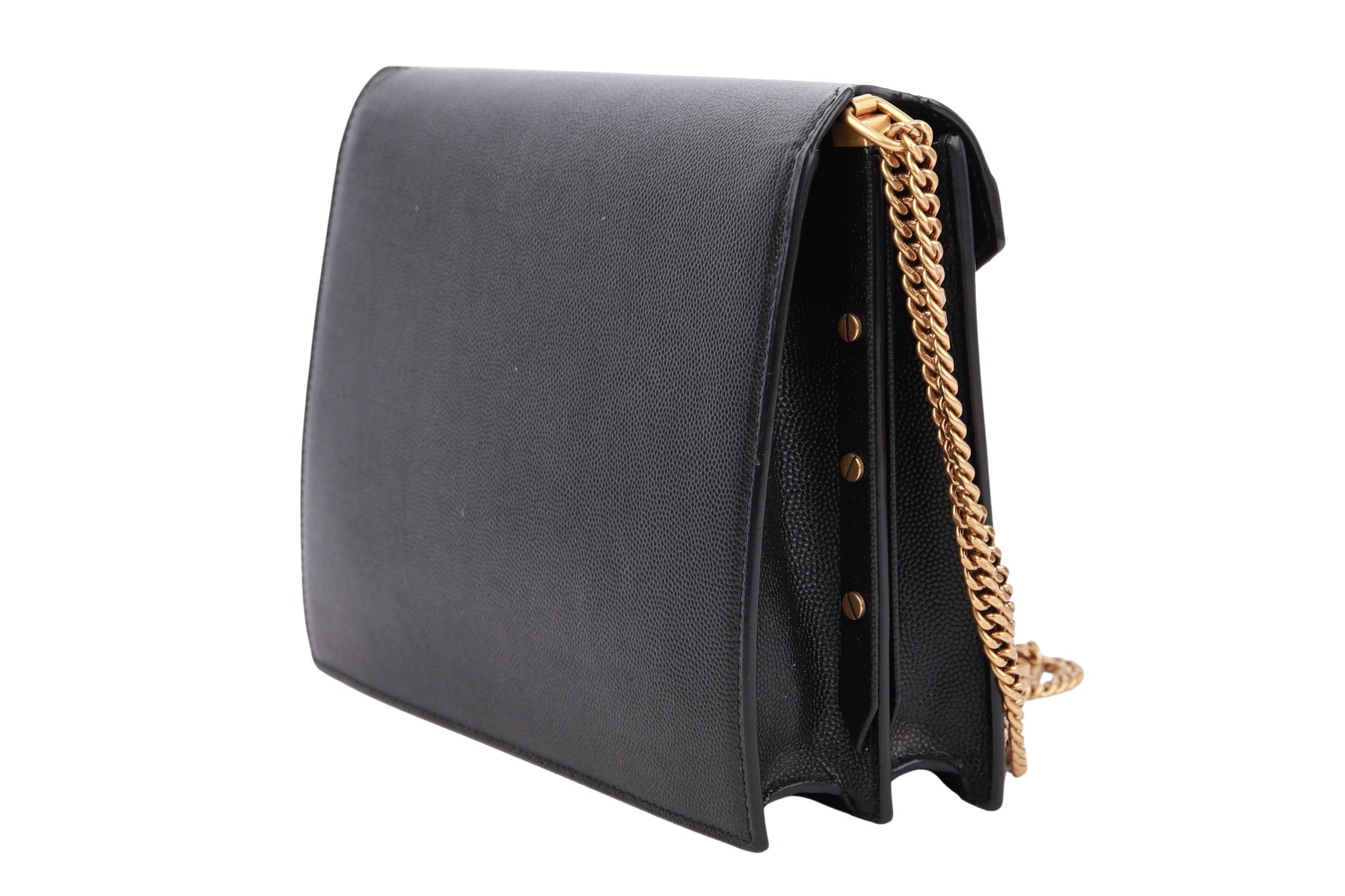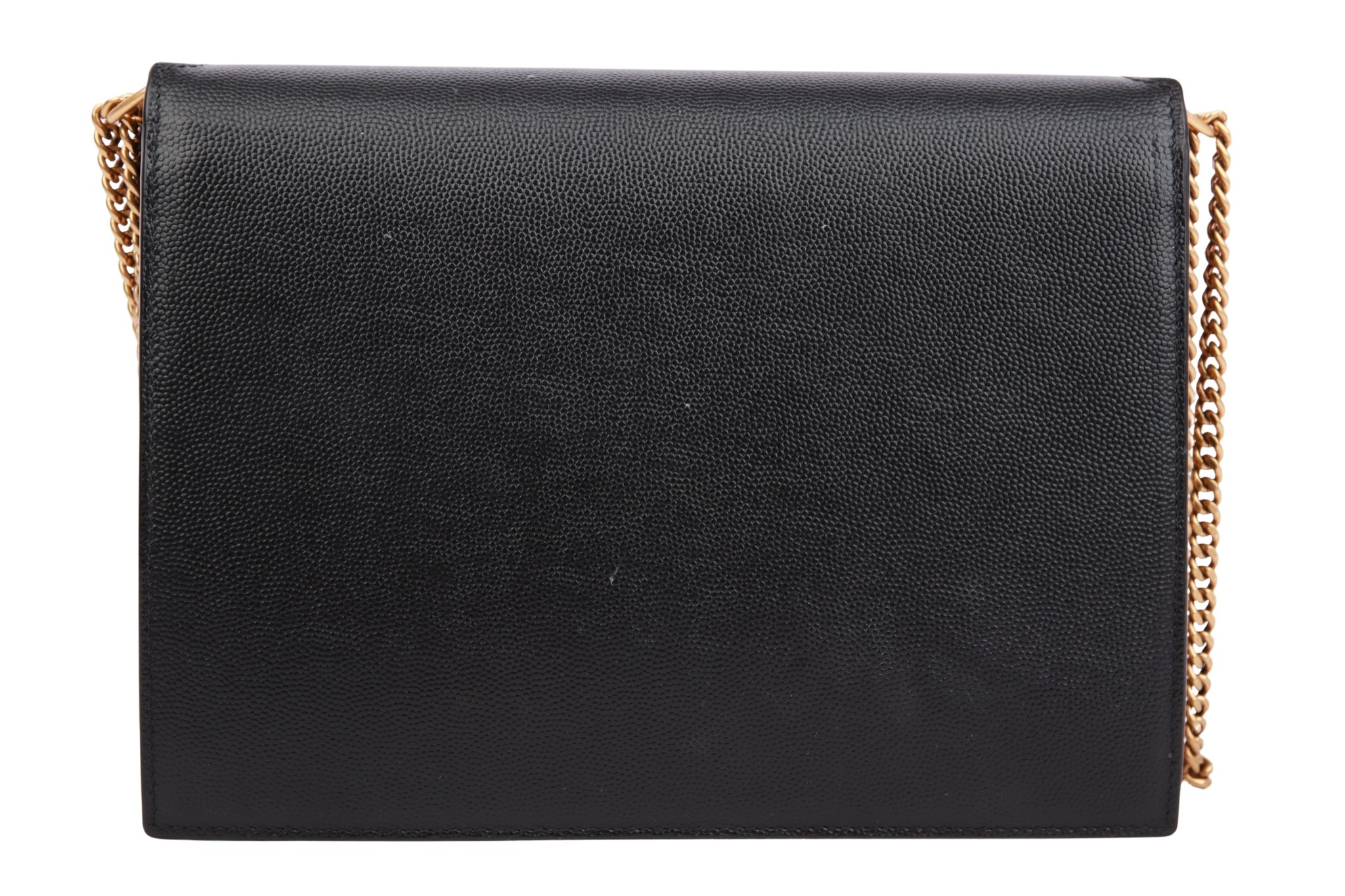 Eine klassische, edle Mini-Bag von Saint Laurent in tiefem Schwarz. Das weiche, hochwertige Leder trifft auf das ikonische Envelope-Design mit charakteristischer Umschlagklappe und subtilem YSL-Logo aus Metall. Dank ihrer kompakten Größe und cleanen Linien ist sie ein zeitloser Begleiter für elegante Looks – ob tagsüber in der Stadt oder abends beim Ausgehen.
