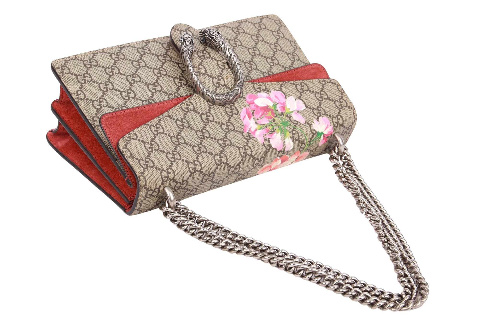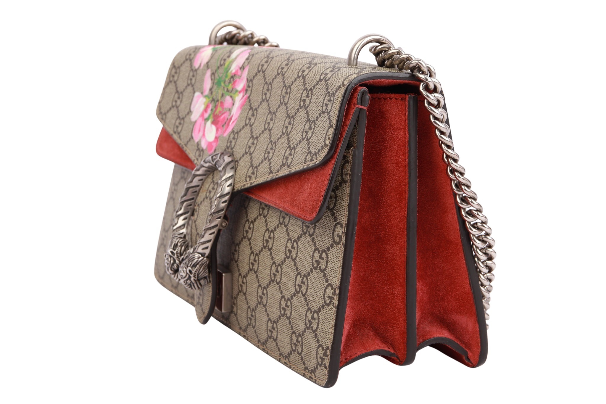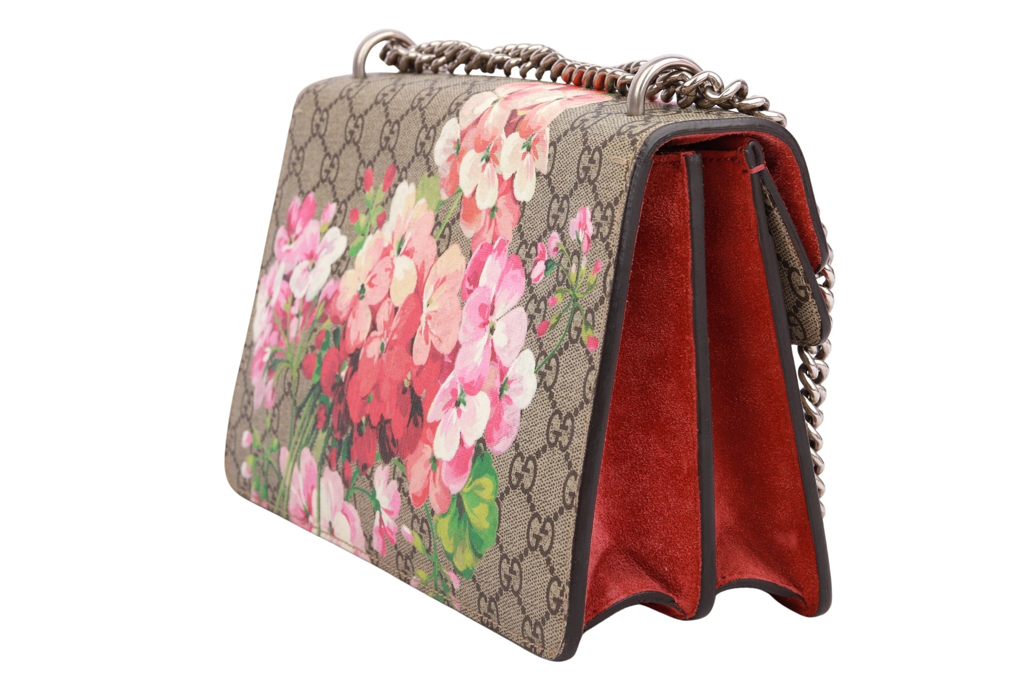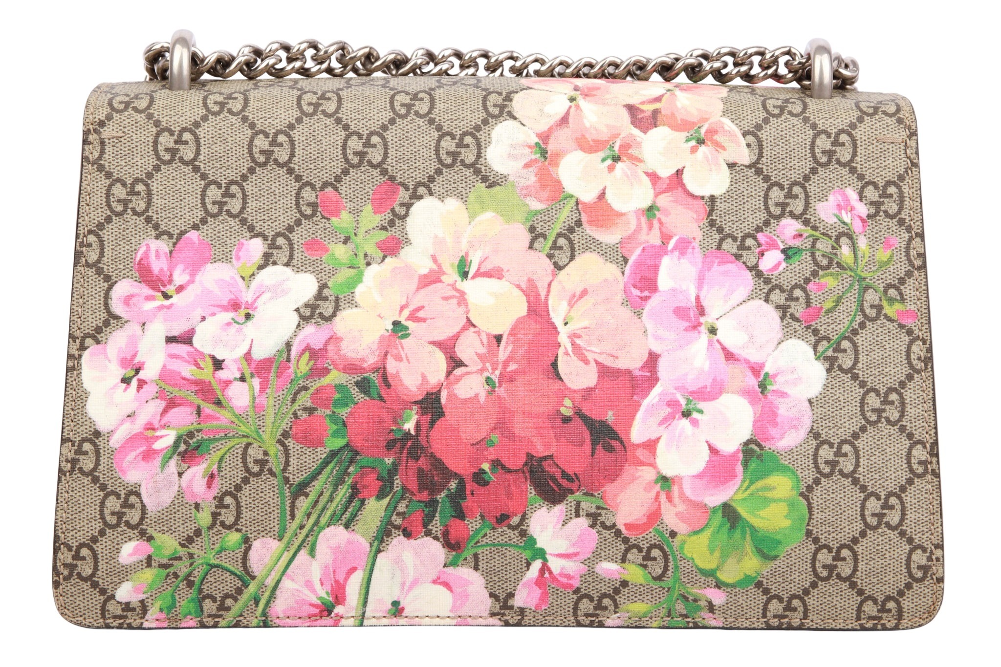 Die elegante Gucci Dionysus Blooms GG Supreme Canvas Tasche vereint das ikonische GG-Monogram mit einem romantischen floralen Blooms-Print und ist ein echter Blickfang für jeden Anlass. Das beschichtete GG Supreme Canvas wird durch zarte rosa Blüten ergänzt und mit hochwertigen Lederdetails sowie silberfarbener Hardware veredelt.