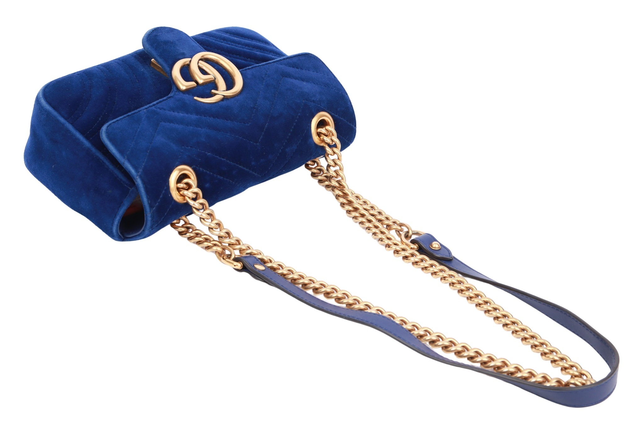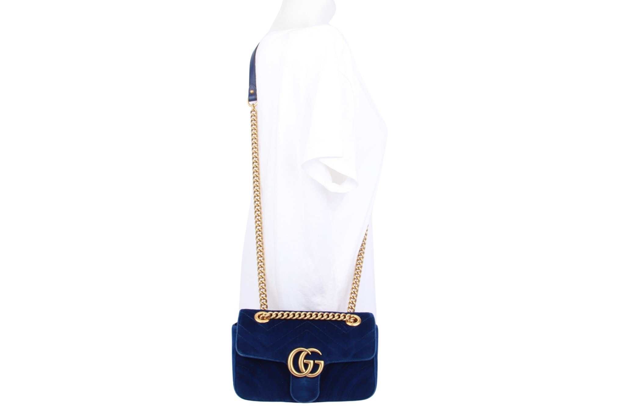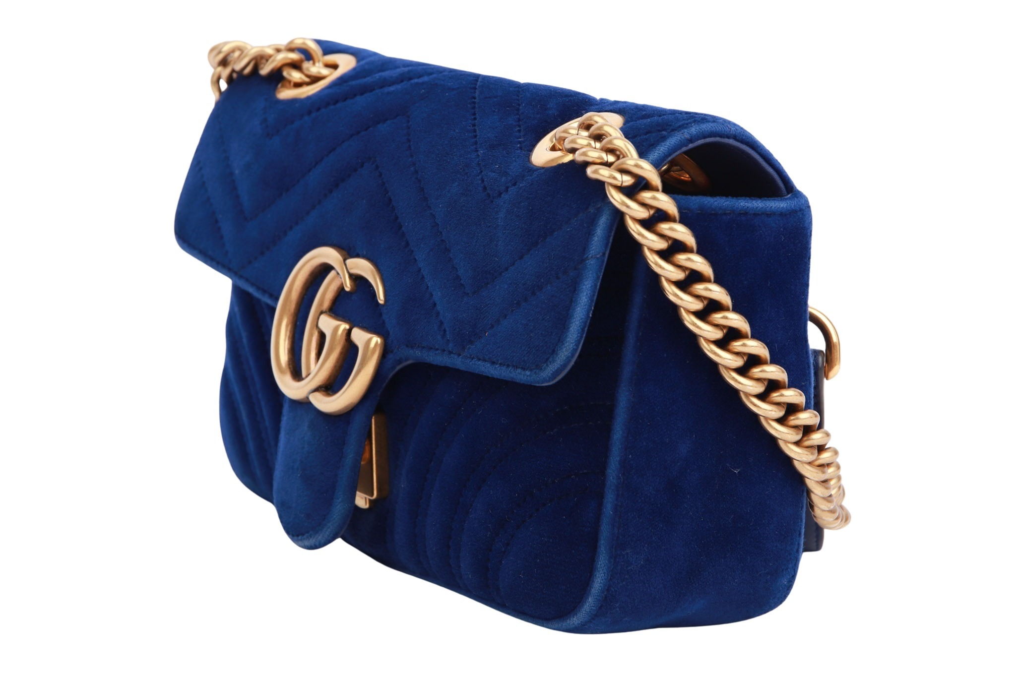 Die Gucci GG Marmont in Samt ist eine luxuriöse Schultertasche mit auffälligem Vintage-Charme, verziert mit der ikonischen GG-Schnalle in Antikgold. Ihr weicher, gesteppter Samt in kräftigem blau verleiht der Tasche einen eleganten und zugleich modernen Look.