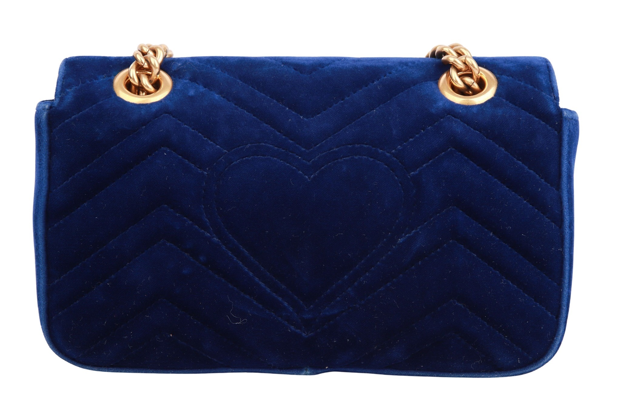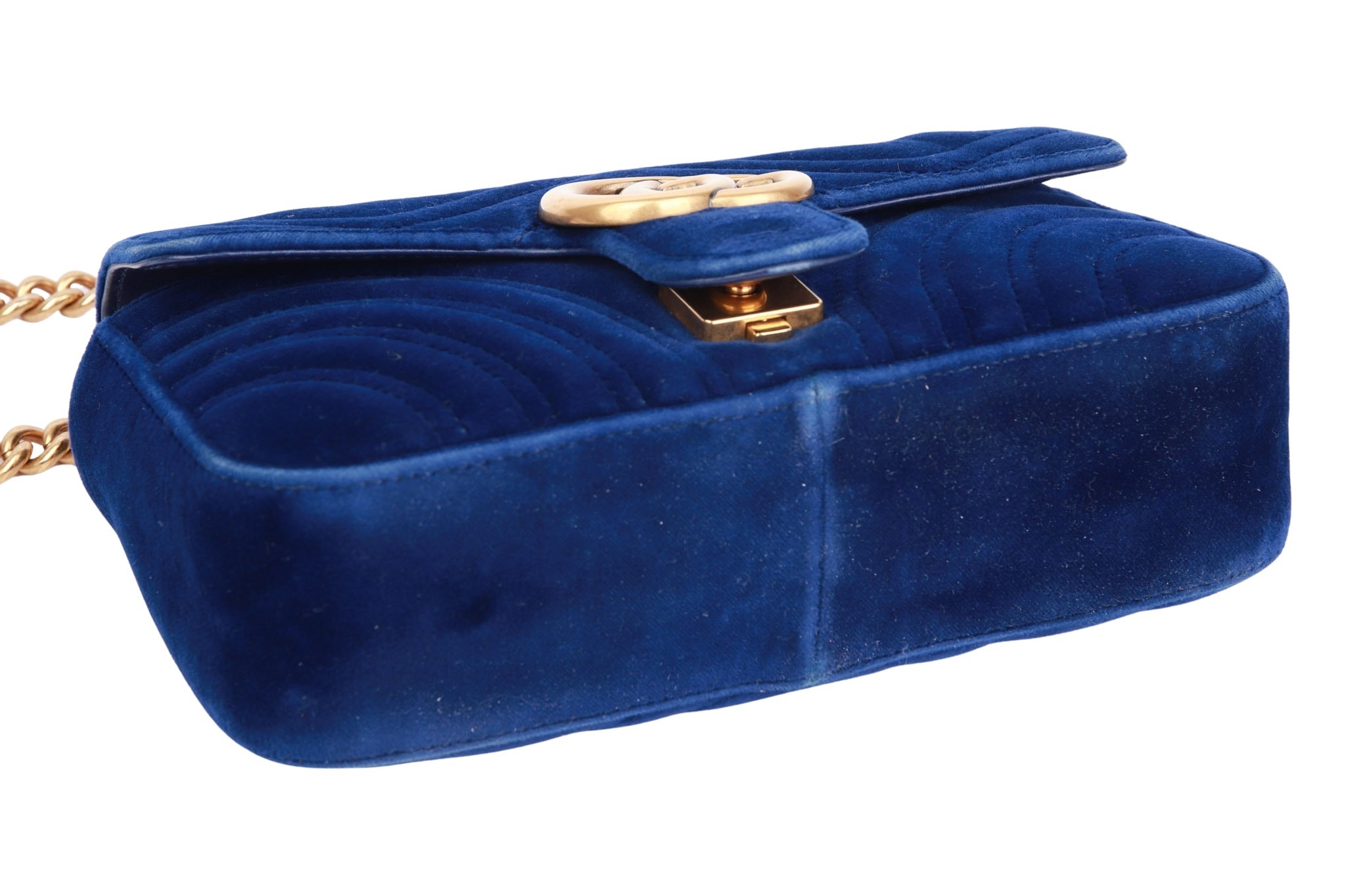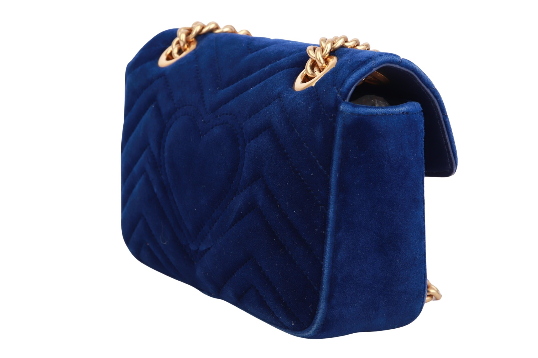 Die Gucci GG Marmont in Samt ist eine luxuriöse Schultertasche mit auffälligem Vintage-Charme, verziert mit der ikonischen GG-Schnalle in Antikgold. Ihr weicher, gesteppter Samt in kräftigem blau verleiht der Tasche einen eleganten und zugleich modernen Look.