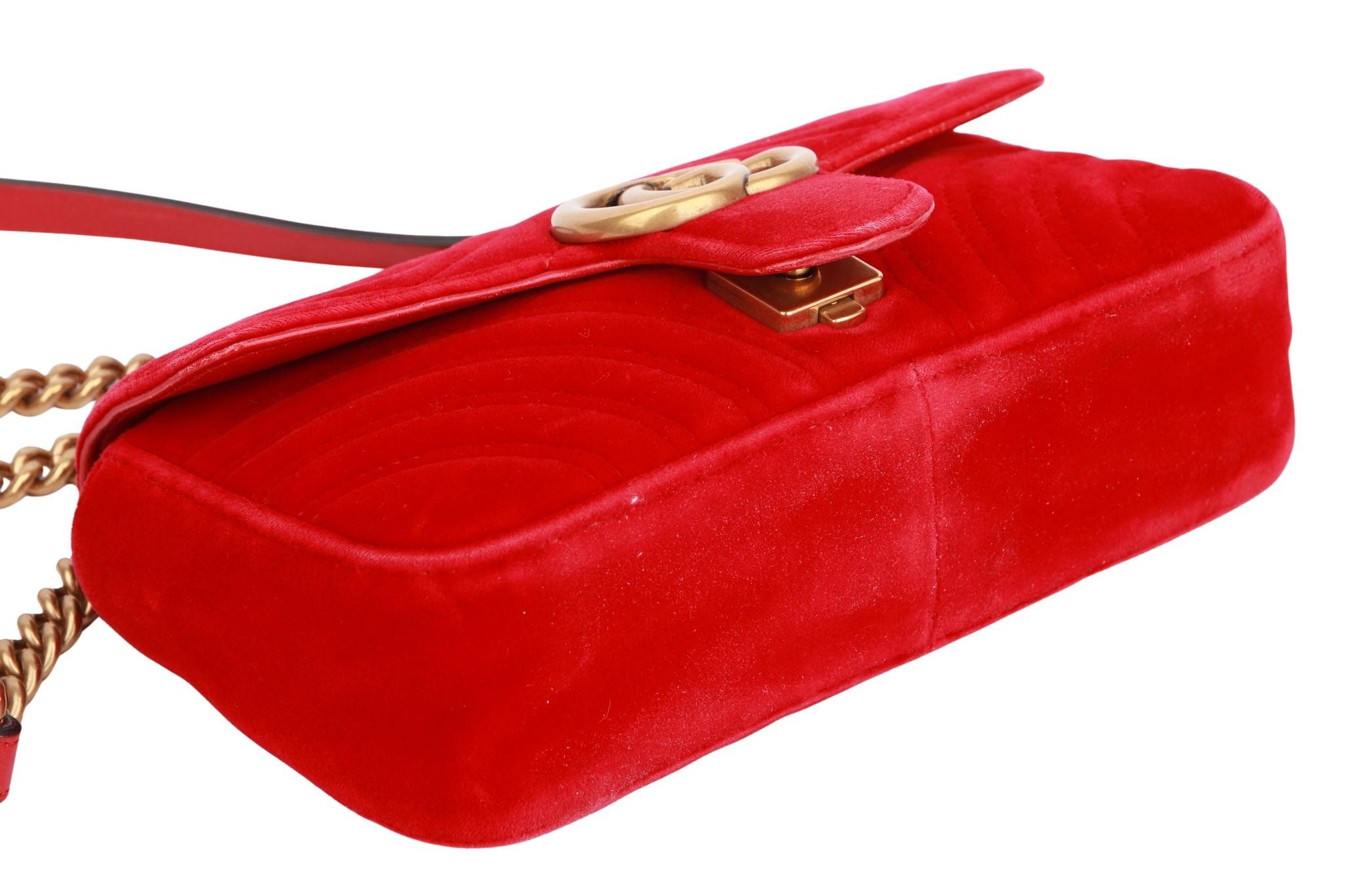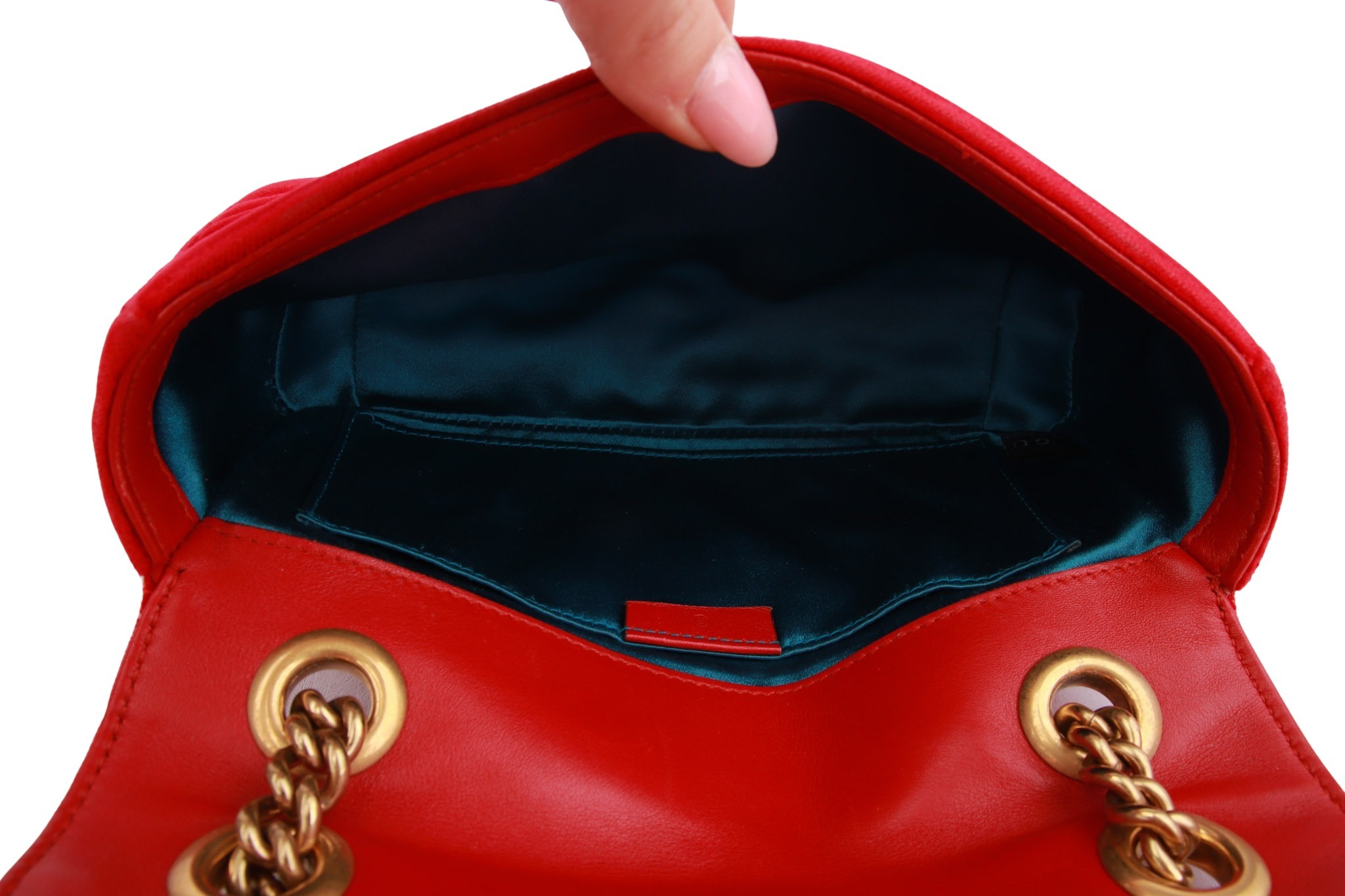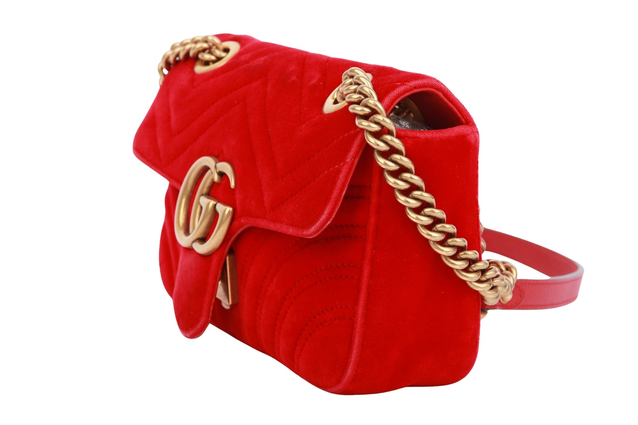 Die Gucci GG Marmont in Samt ist eine luxuriöse Schultertasche mit auffälligem Vintage-Charme, verziert mit der ikonischen GG-Schnalle in Antikgold. Ihr weicher, gesteppter Samt in kräftigem rot verleiht der Tasche einen eleganten und zugleich modernen Look.