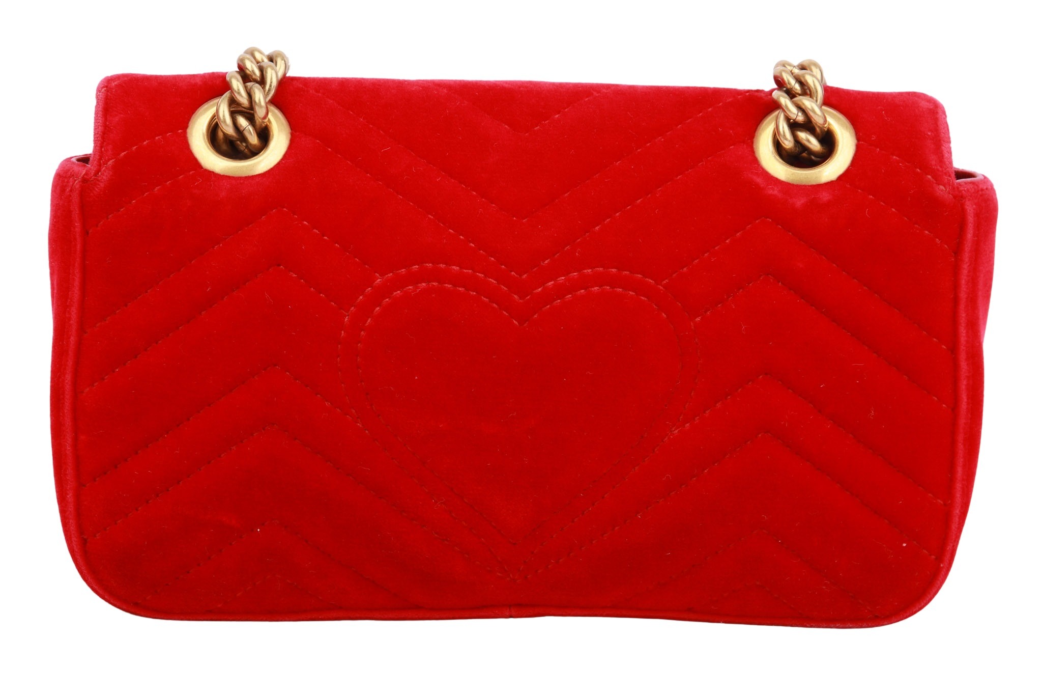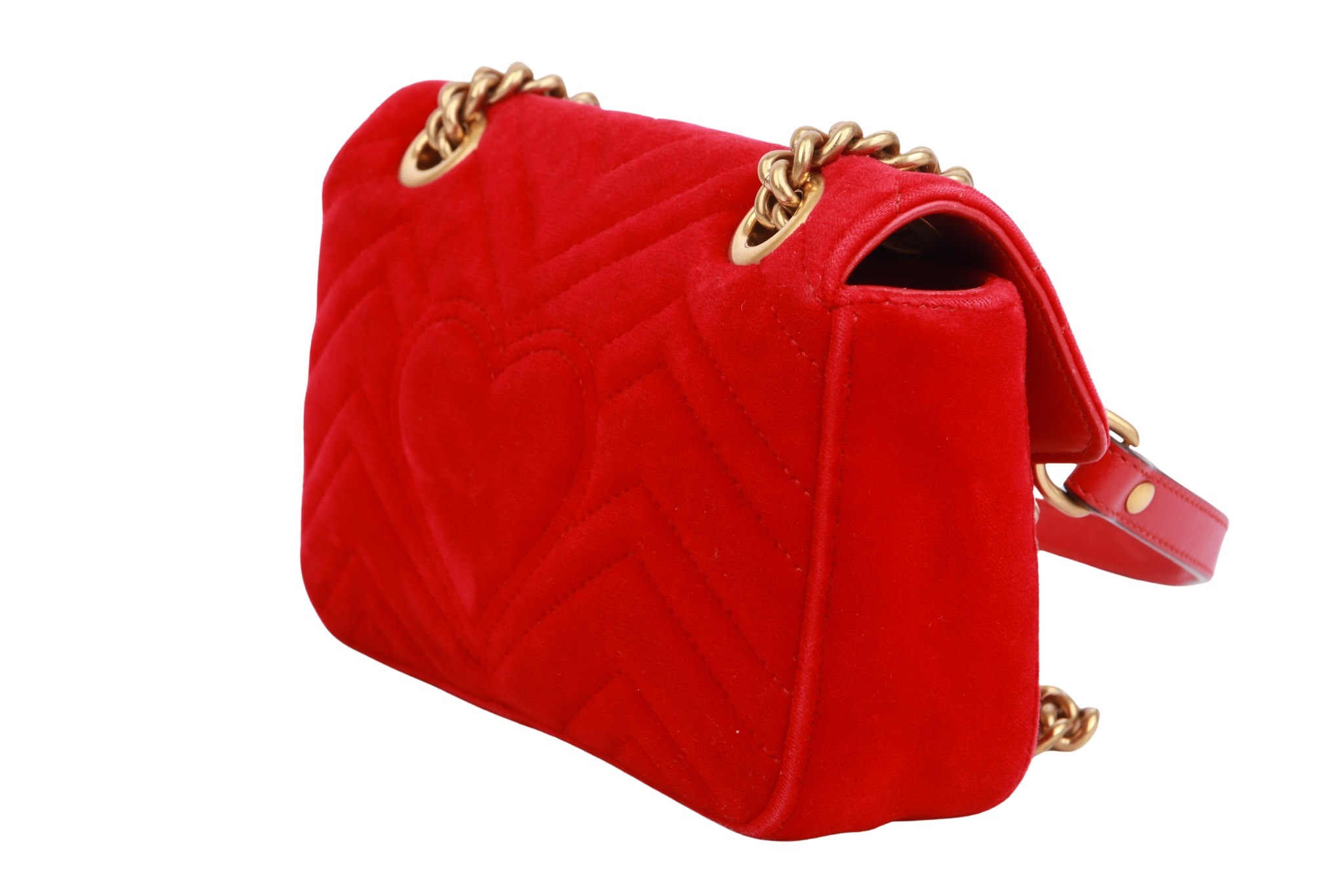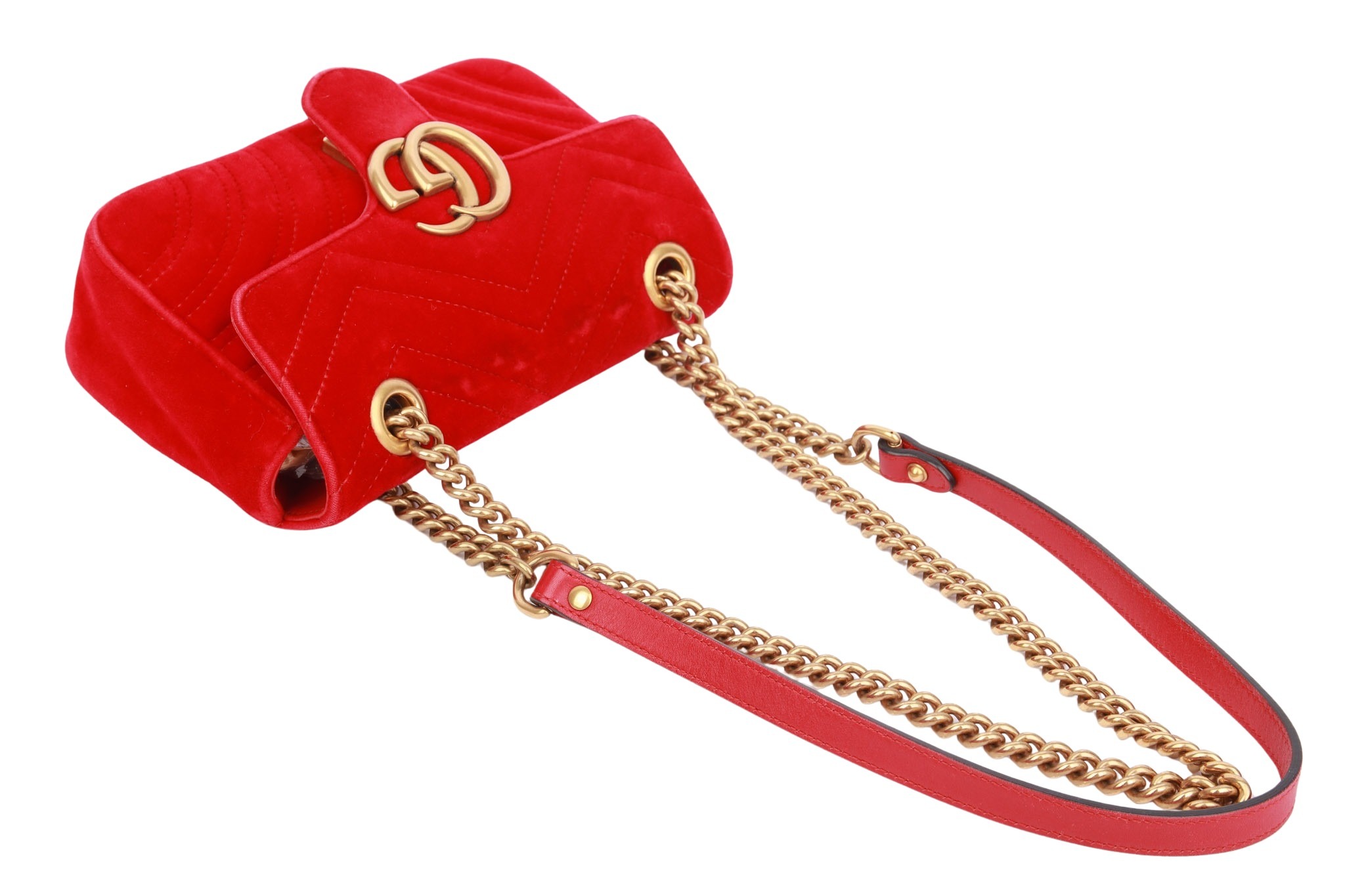 Die Gucci GG Marmont in Samt ist eine luxuriöse Schultertasche mit auffälligem Vintage-Charme, verziert mit der ikonischen GG-Schnalle in Antikgold. Ihr weicher, gesteppter Samt in kräftigem rot verleiht der Tasche einen eleganten und zugleich modernen Look.