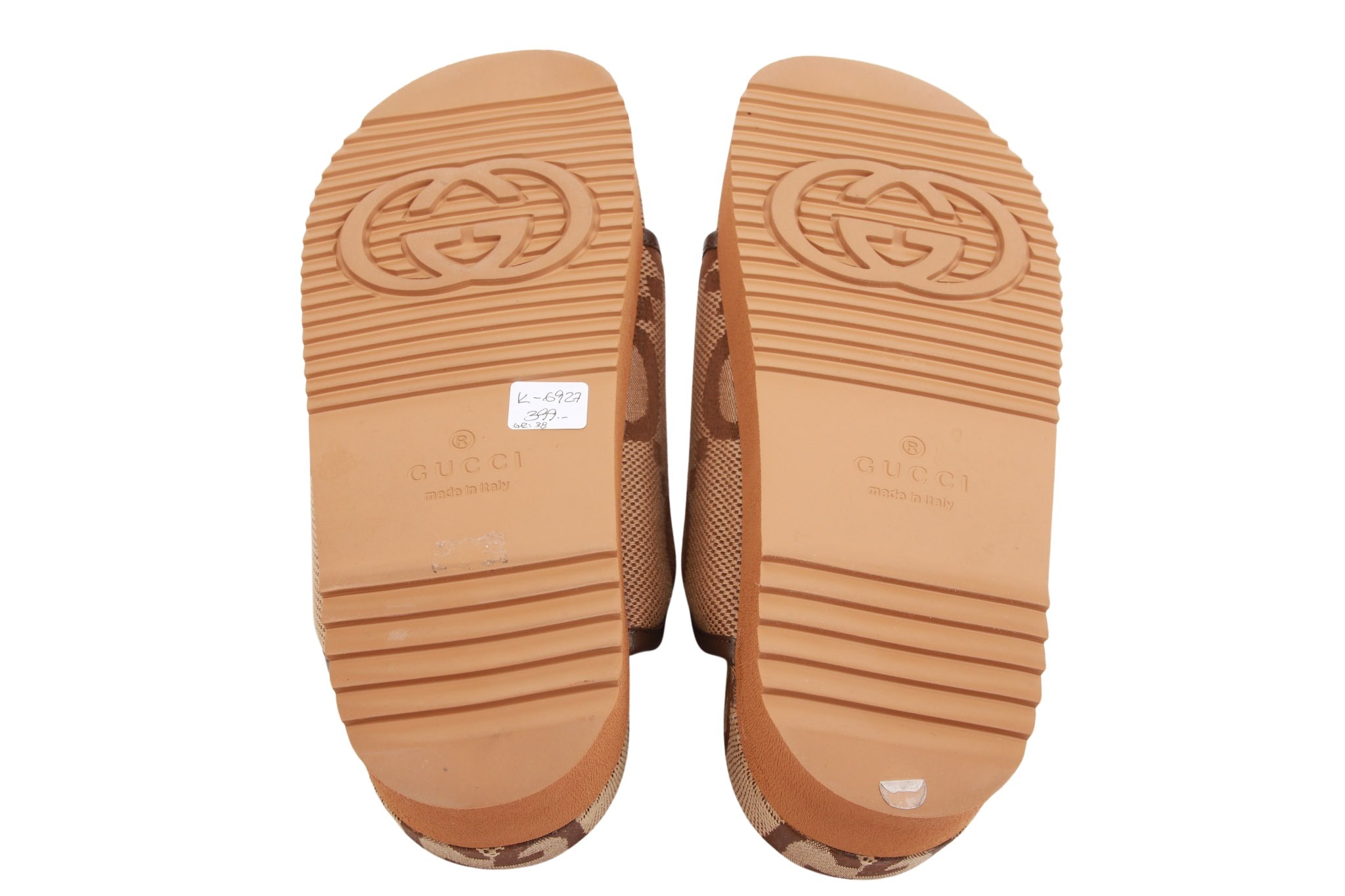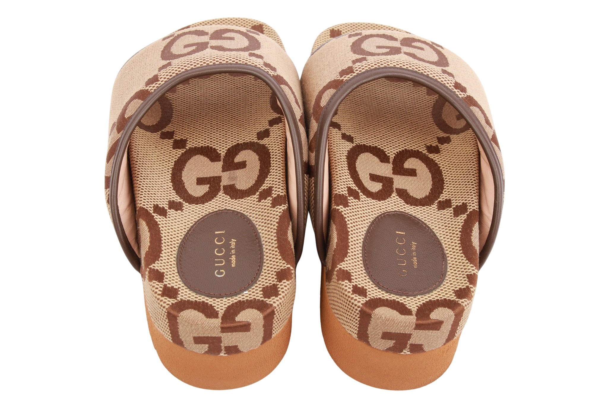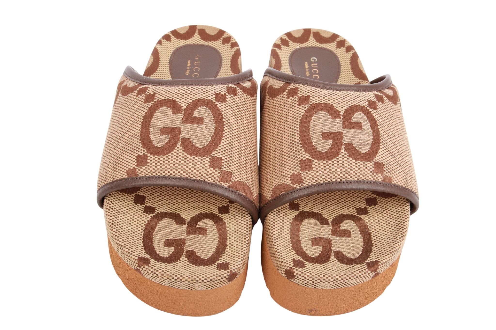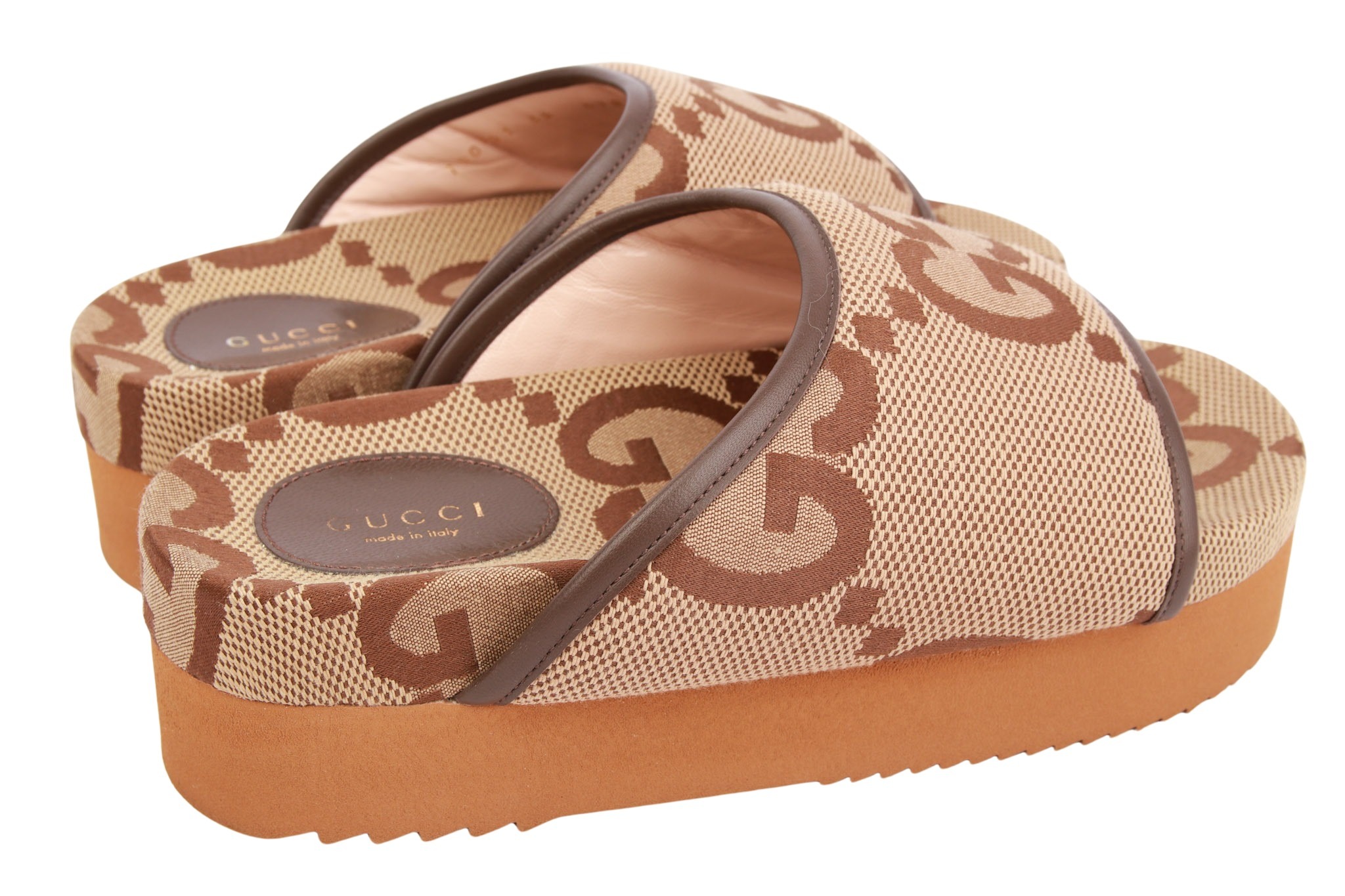 Die Gucci Jumbo GG Plateau Sandale ein Hingucker für den Sommer. Aus dem markentysischen Jumbo GG Canvas in der Farbkombination Camel und Ebenholz.