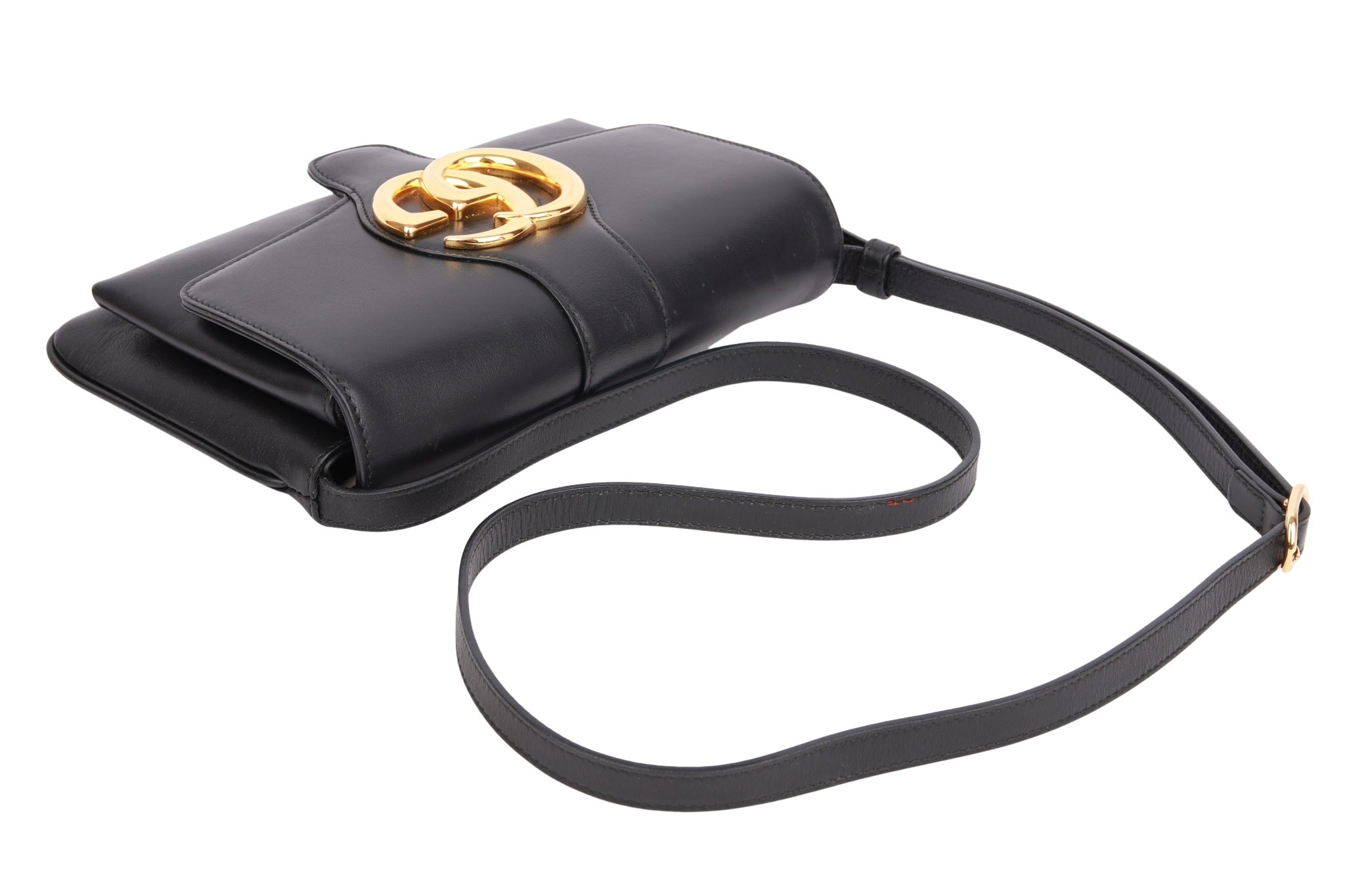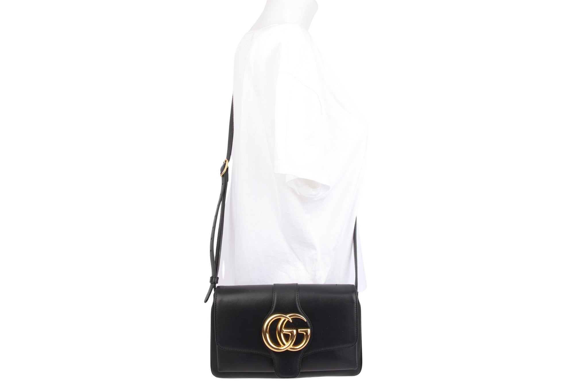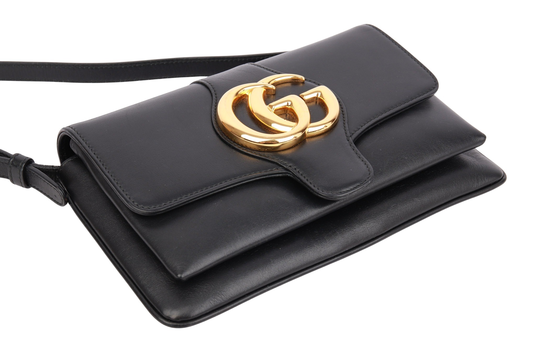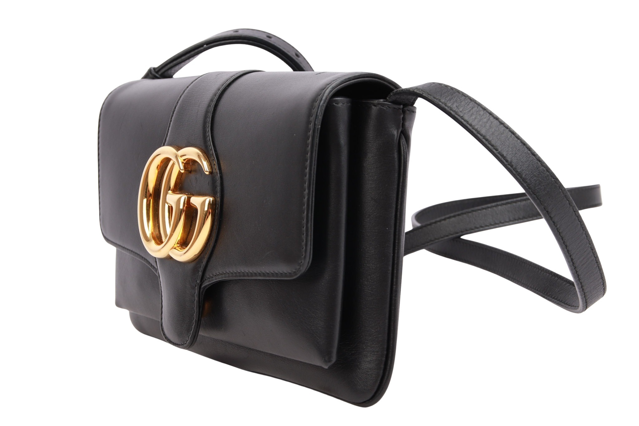 Die Gucci Arli besticht durch ihre minimalistische 70er-Jahre-Optik mit dem markanten, goldenen Doppel-G-Logo auf schwarzen Leder. Funktional bietet sie durch ihre fächerartige Struktur flexiblen Stauraum und lässt sich dank verstellbarer Riemen oder dem praktischem Reißverschlussfach vielseitig im Alltag einsetzen.