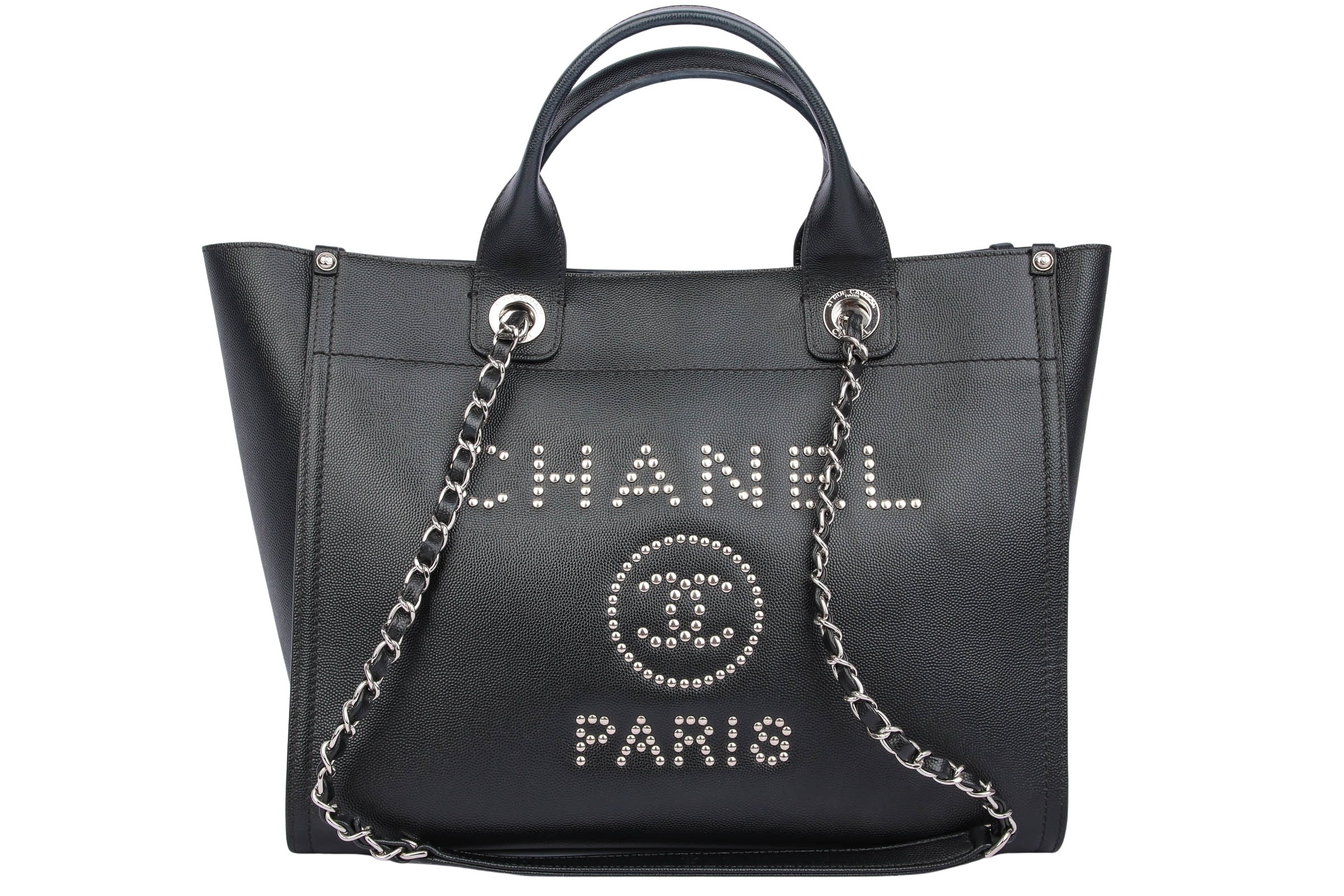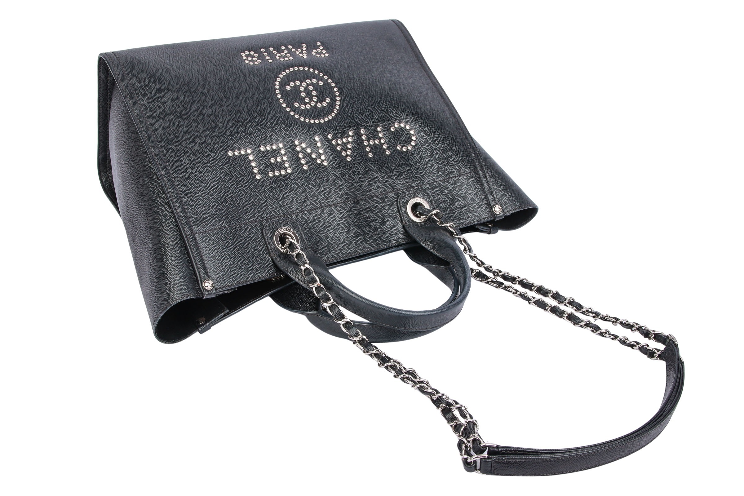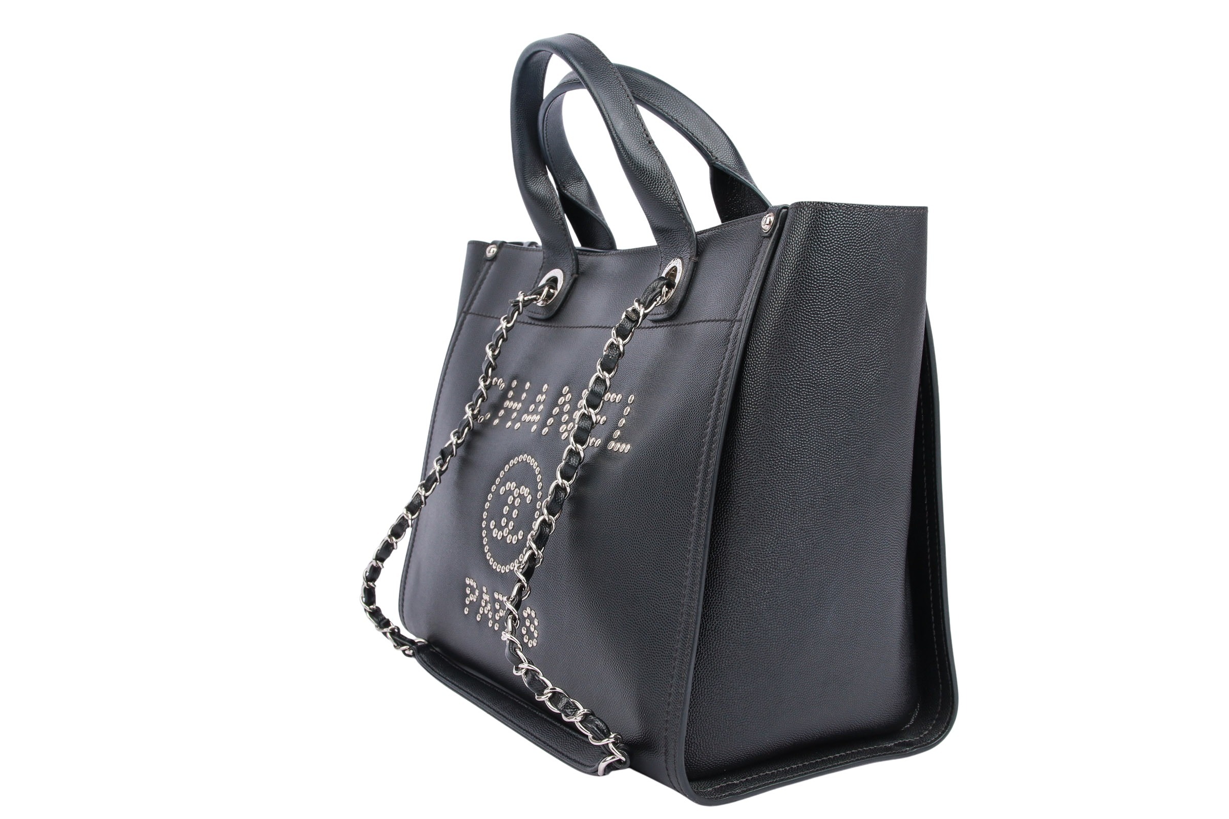 Entdecken Sie den Inbegriff von Stil und Funktionalität mit dem Chanel Deauville Shopper mit Nieten in Schwarz! Dieses luxuriöse Accessoire kombiniert die klassische Eleganz von Chanel mit einem modernen, auffälligen Design. Die dekorativen Nieten verleihen der Tasche einen Hauch von Rock-Chic, während das geräumige Innenleben genügend Platz für Ihre Essentials bietet. Perfekt für den Alltag oder besondere Anlässe.