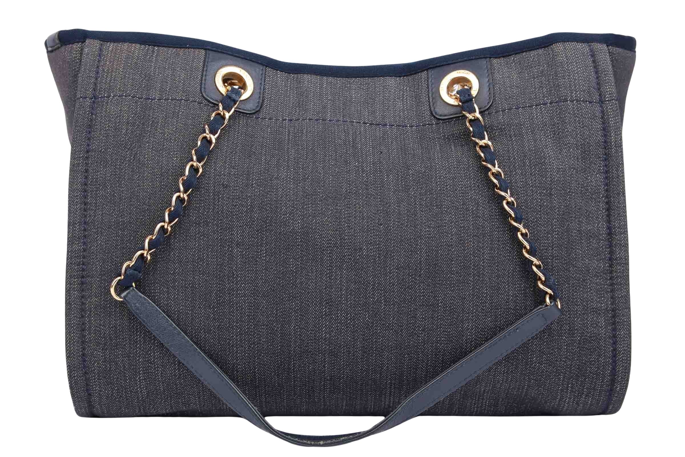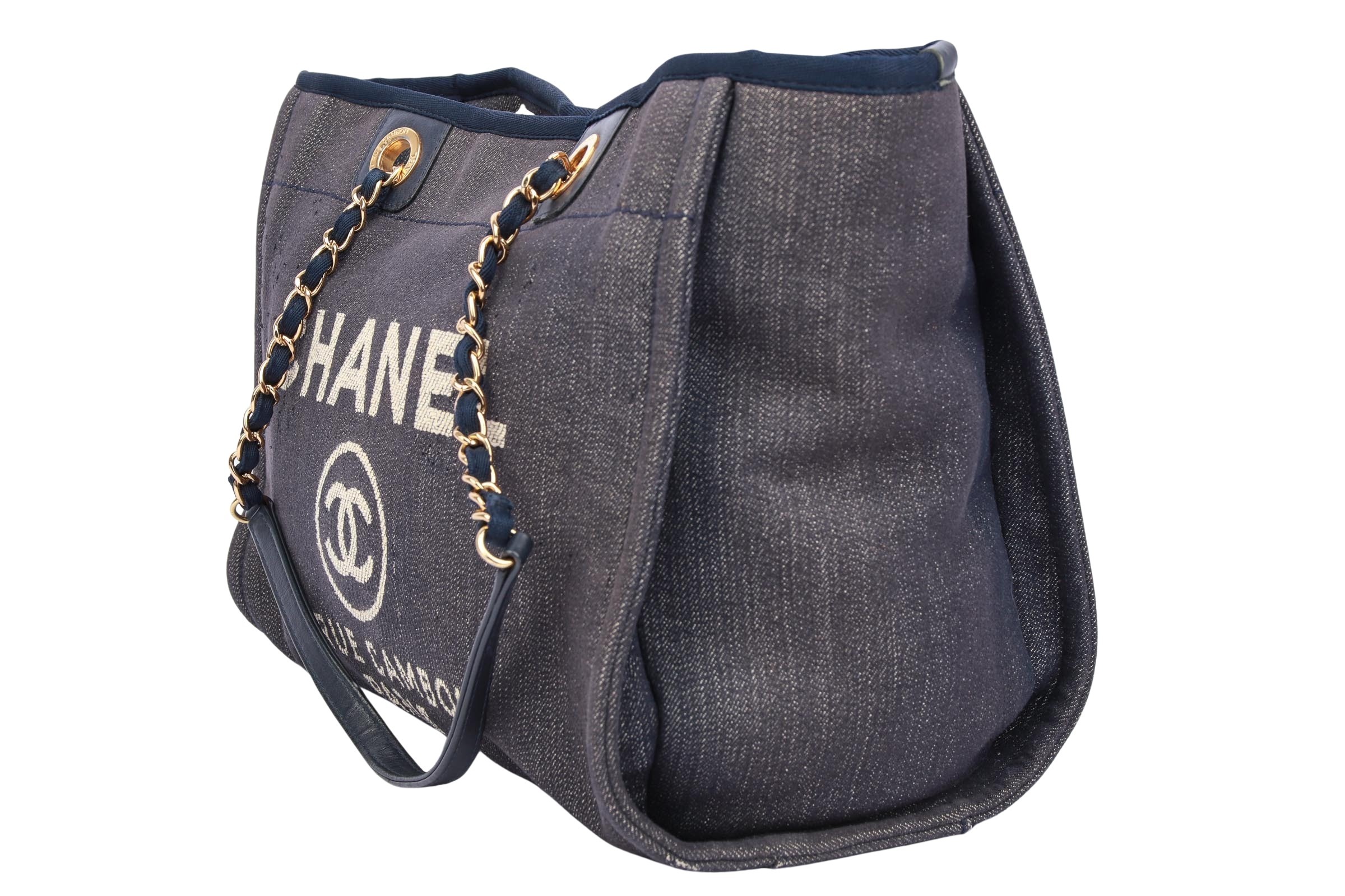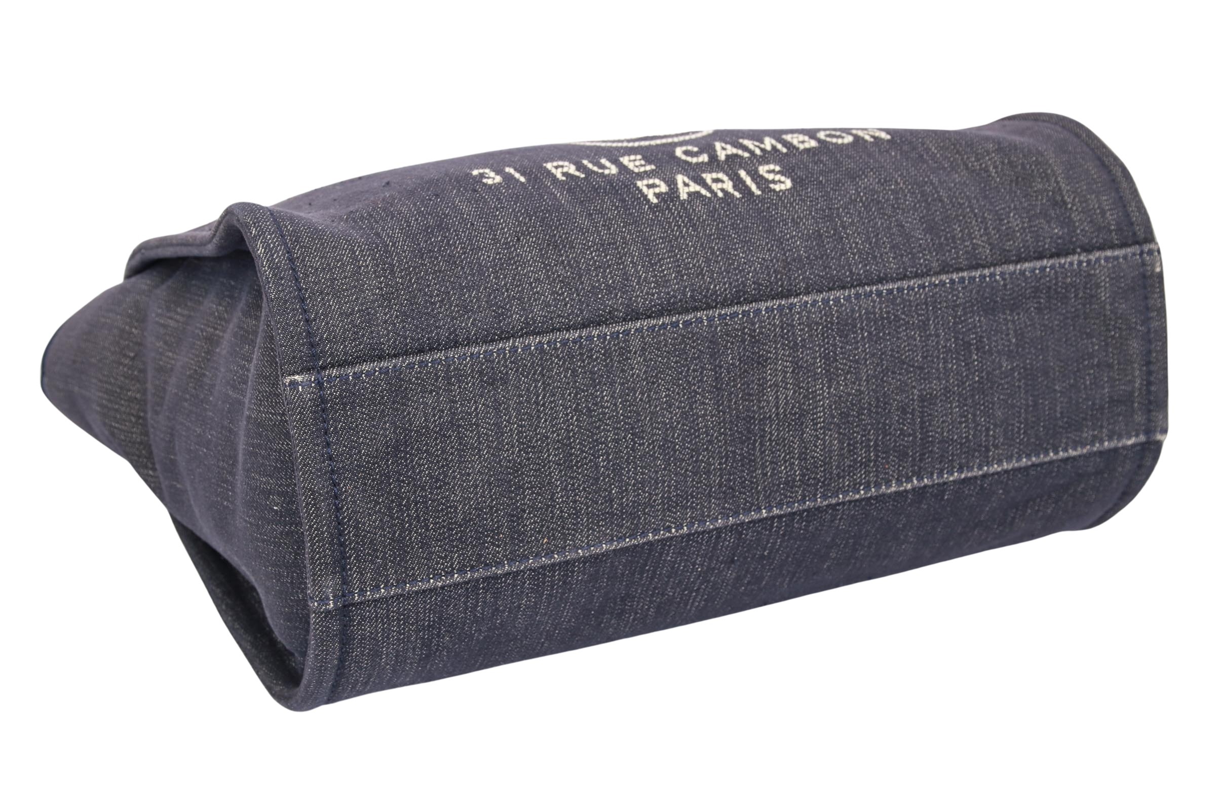 Die Chanel Deauville Small in edlem Denim verbindet sommerliche Leichtigkeit mit ikonischem Chanel-Charme. Der strukturierte Jeansstoff verleiht der Tasche eine entspannte Note, während die typischen Leder-Kettenhenkel und das gestickte Logo auf der Vorderseite für den eleganten Chanel-Touch sorgen. Kompakt, leicht und dennoch geräumig – ideal für den stilvollen Alltag oder einen entspannten City-Look.