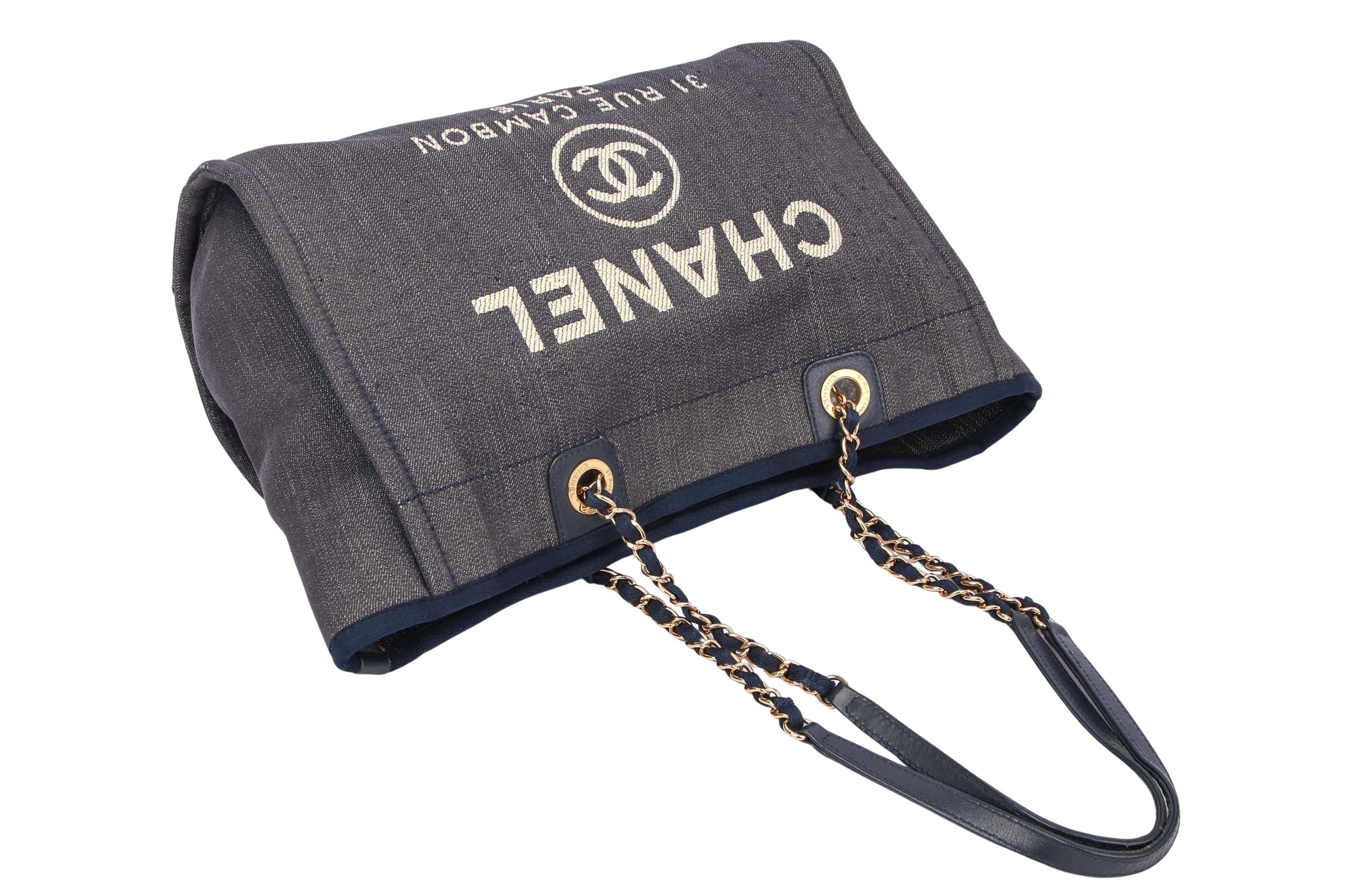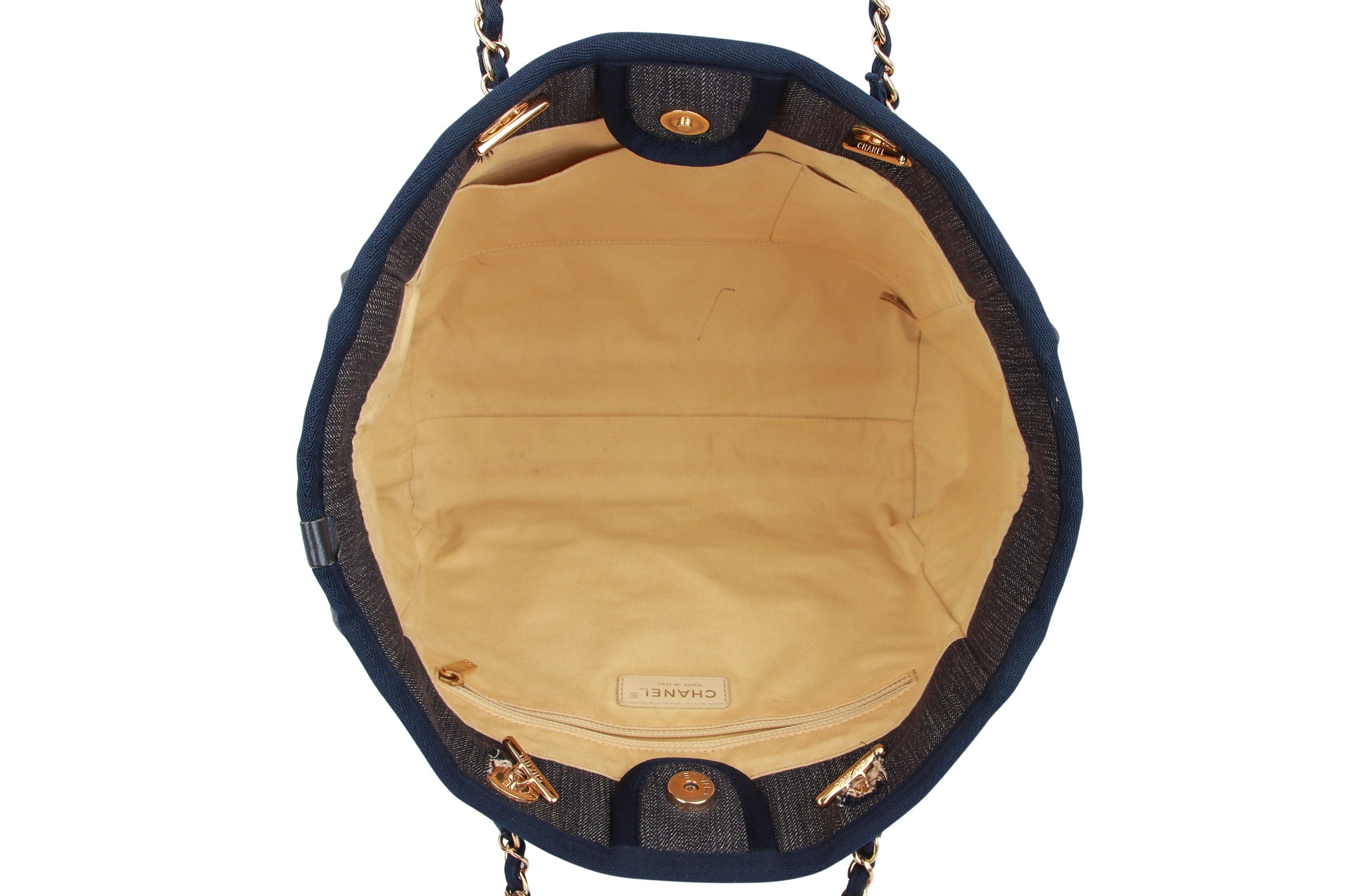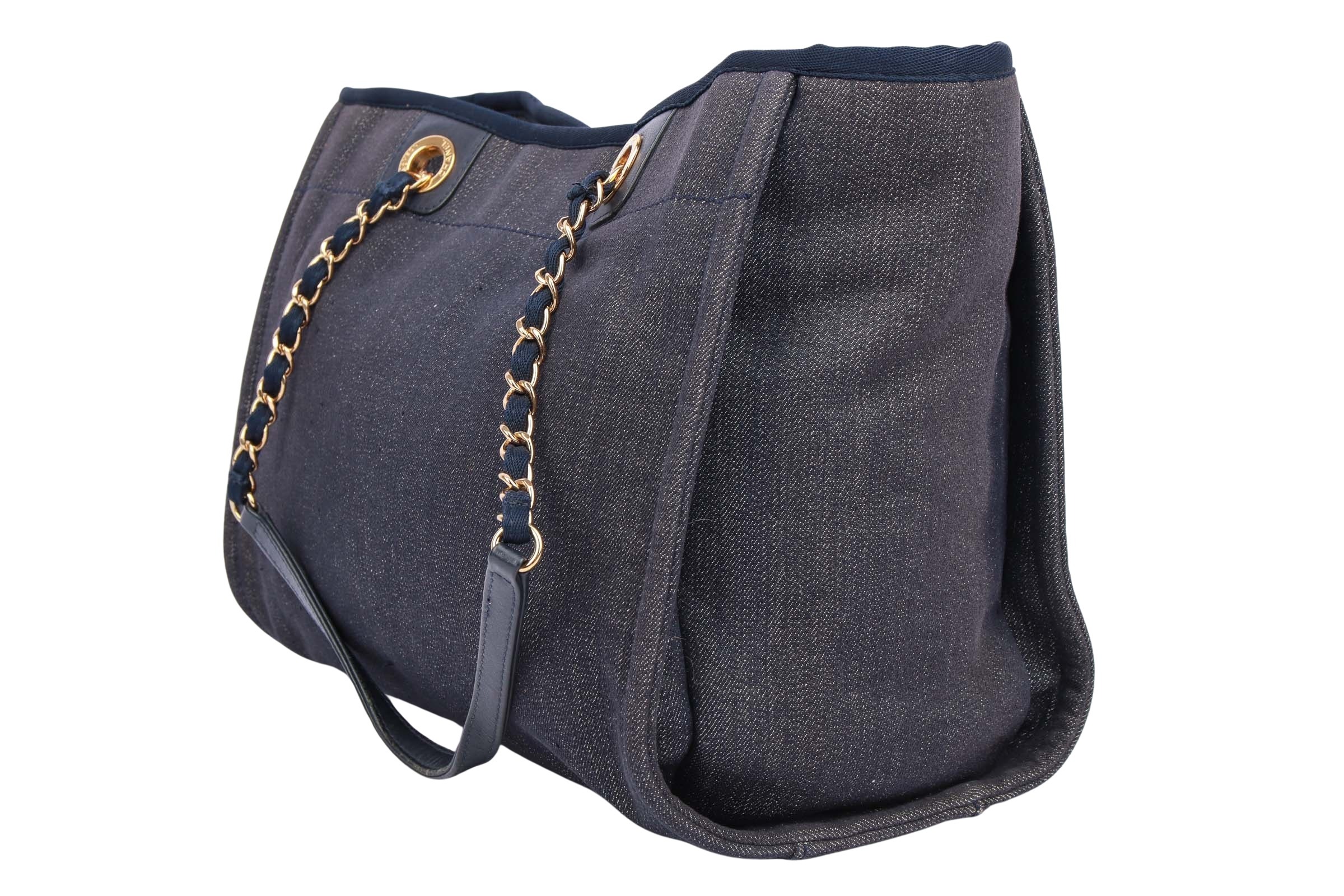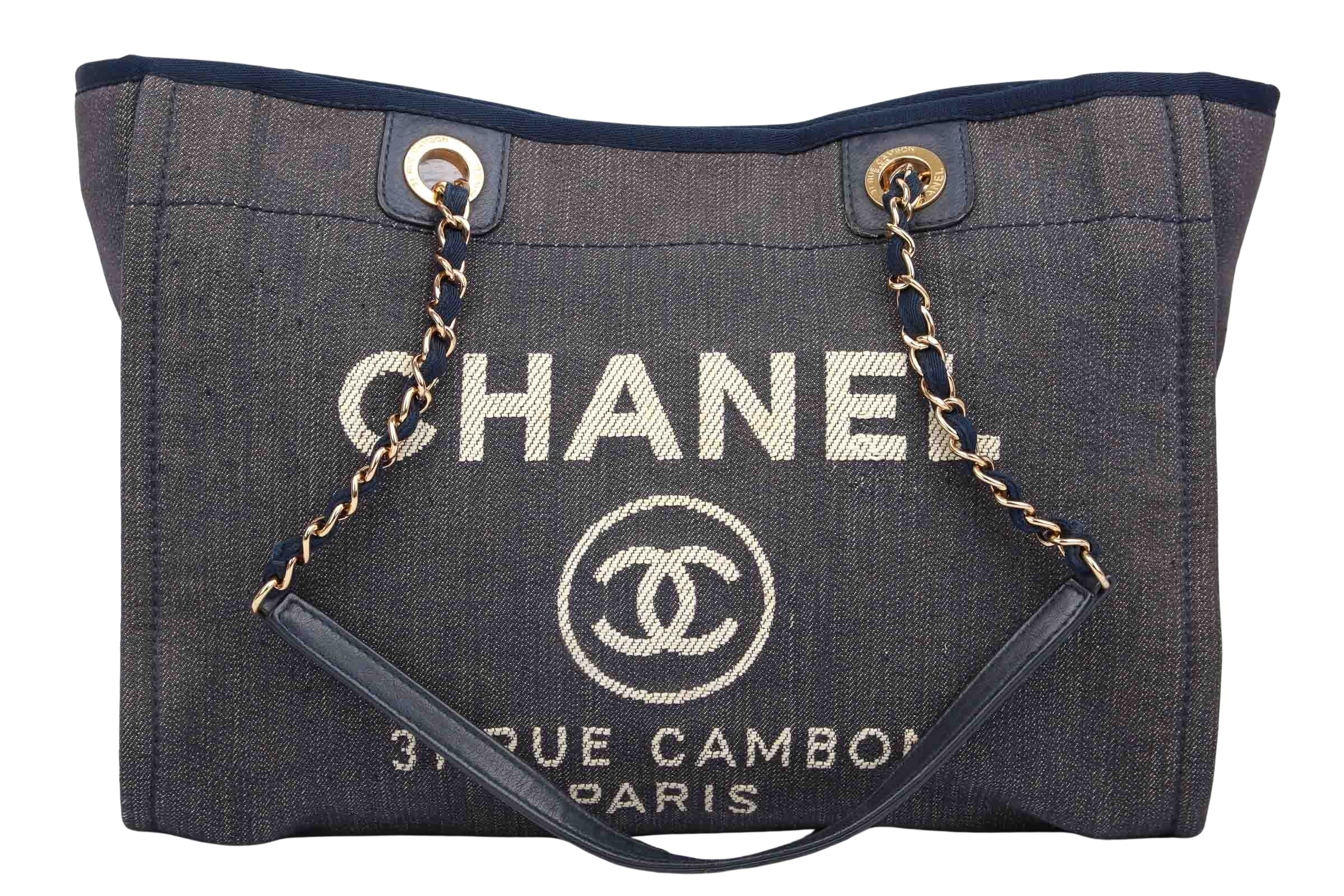 Die Chanel Deauville Small in edlem Denim verbindet sommerliche Leichtigkeit mit ikonischem Chanel-Charme. Der strukturierte Jeansstoff verleiht der Tasche eine entspannte Note, während die typischen Leder-Kettenhenkel und das gestickte Logo auf der Vorderseite für den eleganten Chanel-Touch sorgen. Kompakt, leicht und dennoch geräumig – ideal für den stilvollen Alltag oder einen entspannten City-Look.