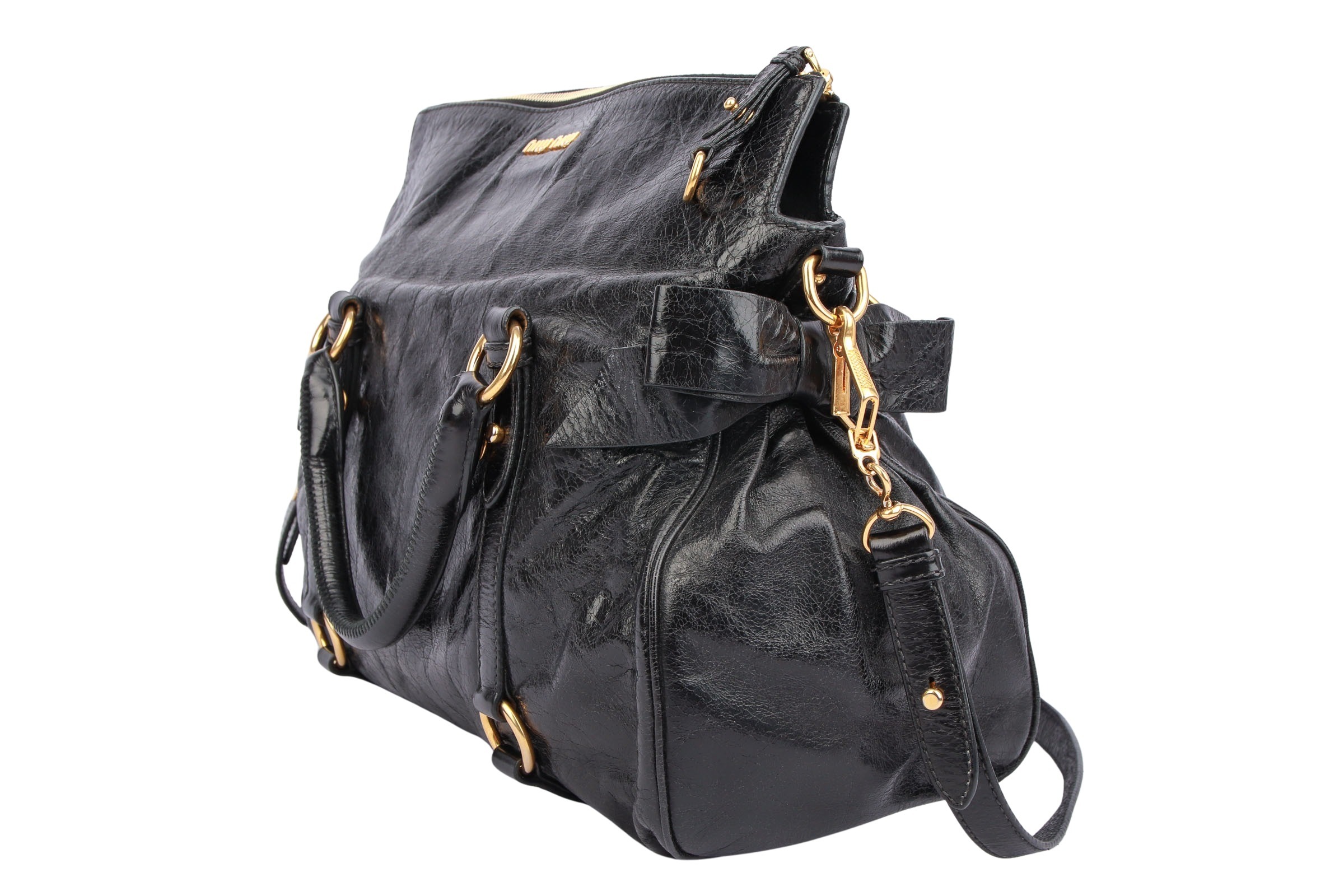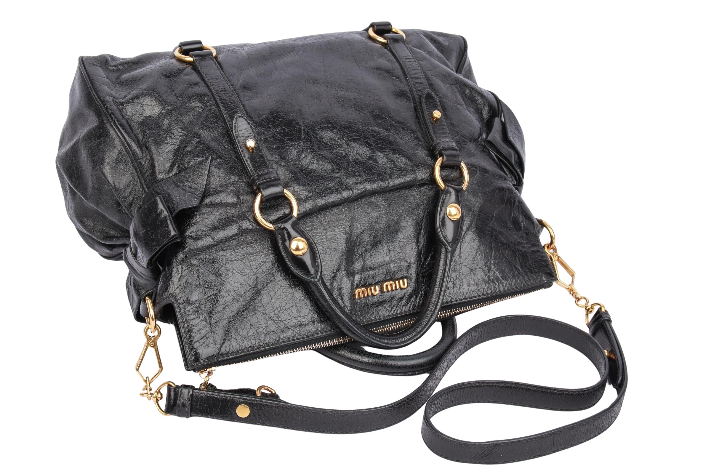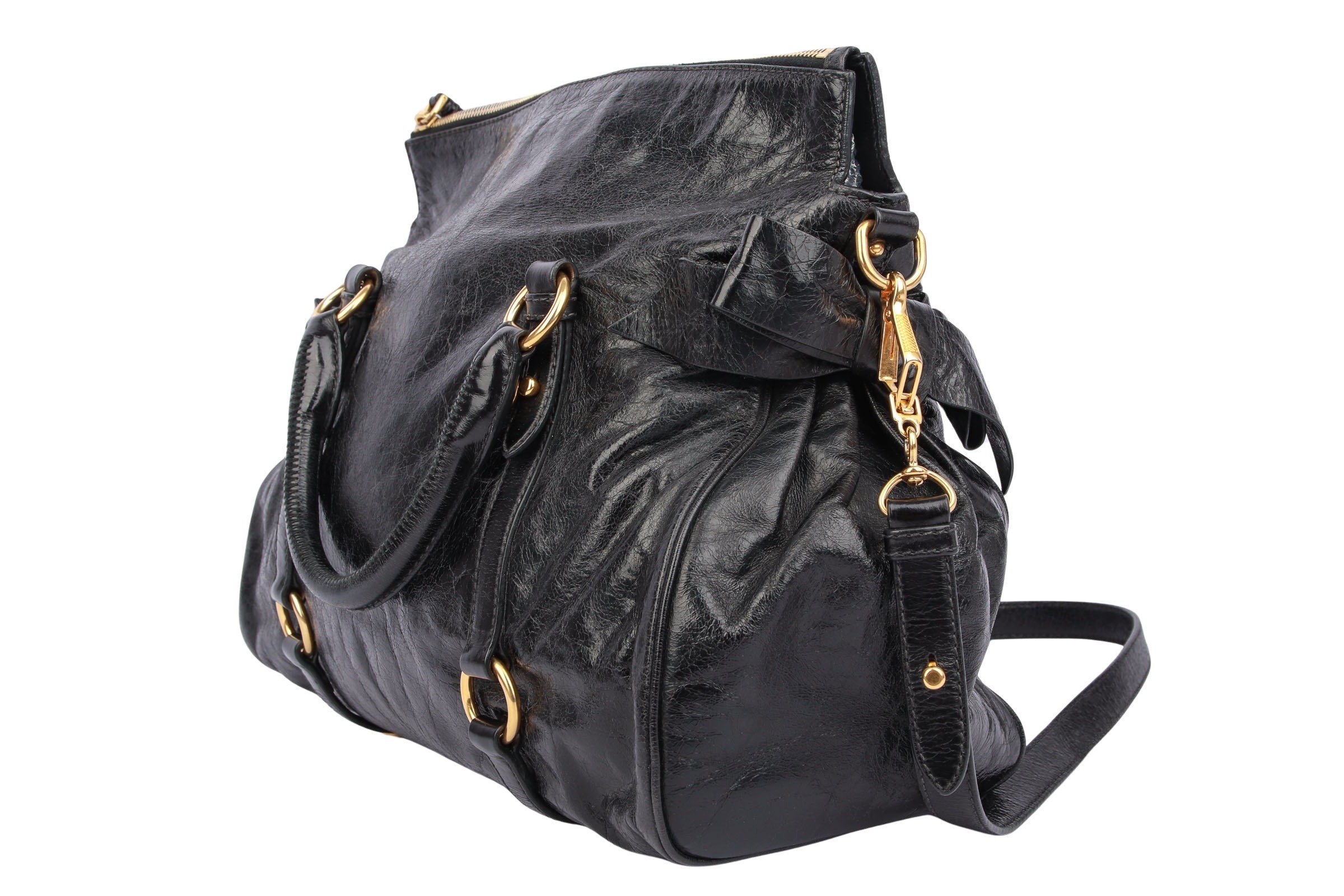 Die Miu Miu Bow Bag in klassischem Schwarz ist ein echter Blickfang mit verspieltem Twist. Gefertigt aus weichem, hochwertigem Leder, zeichnet sie sich durch ihre charakteristischen Schleifendetails an den Seiten und den dezenten Miu Miu-Schriftzug aus. Mit ihren praktischen Henkeln und einem abnehmbaren Schulterriemen vereint sie Stil und Funktionalität – perfekt für den femininen Alltagslook mit Raffinesse.