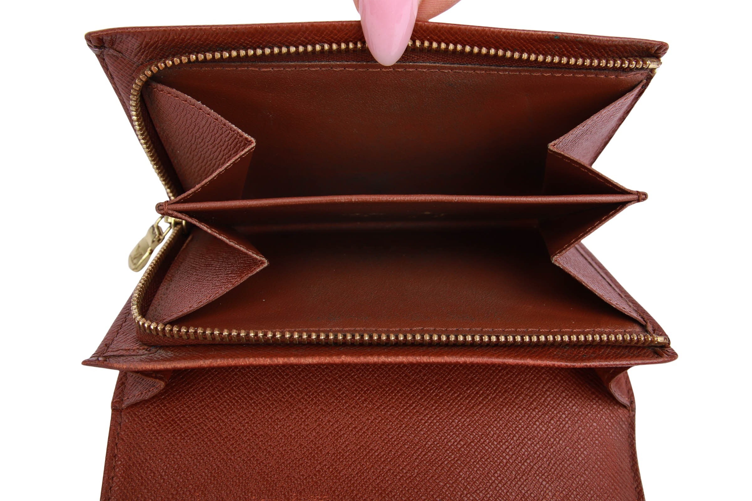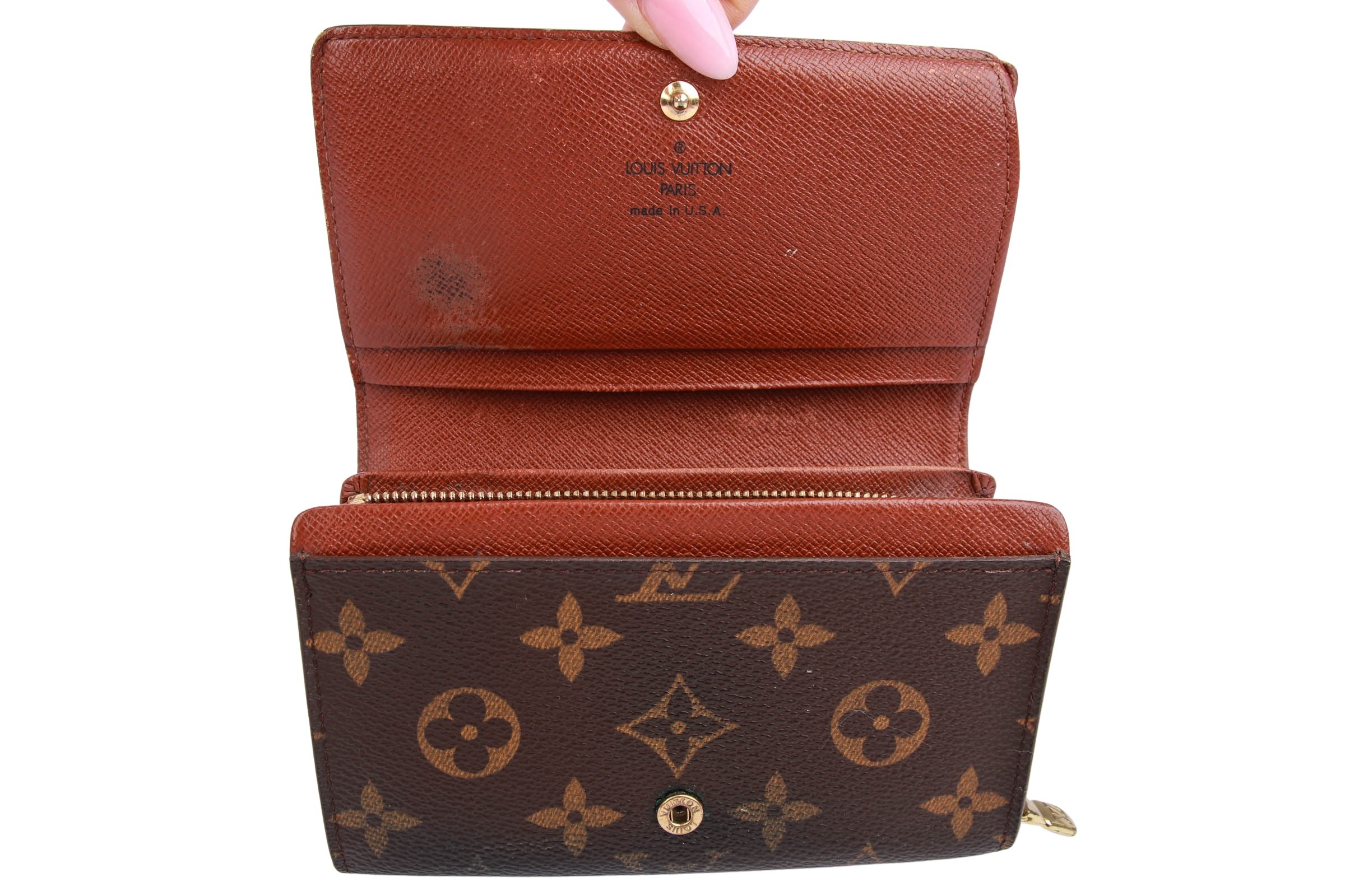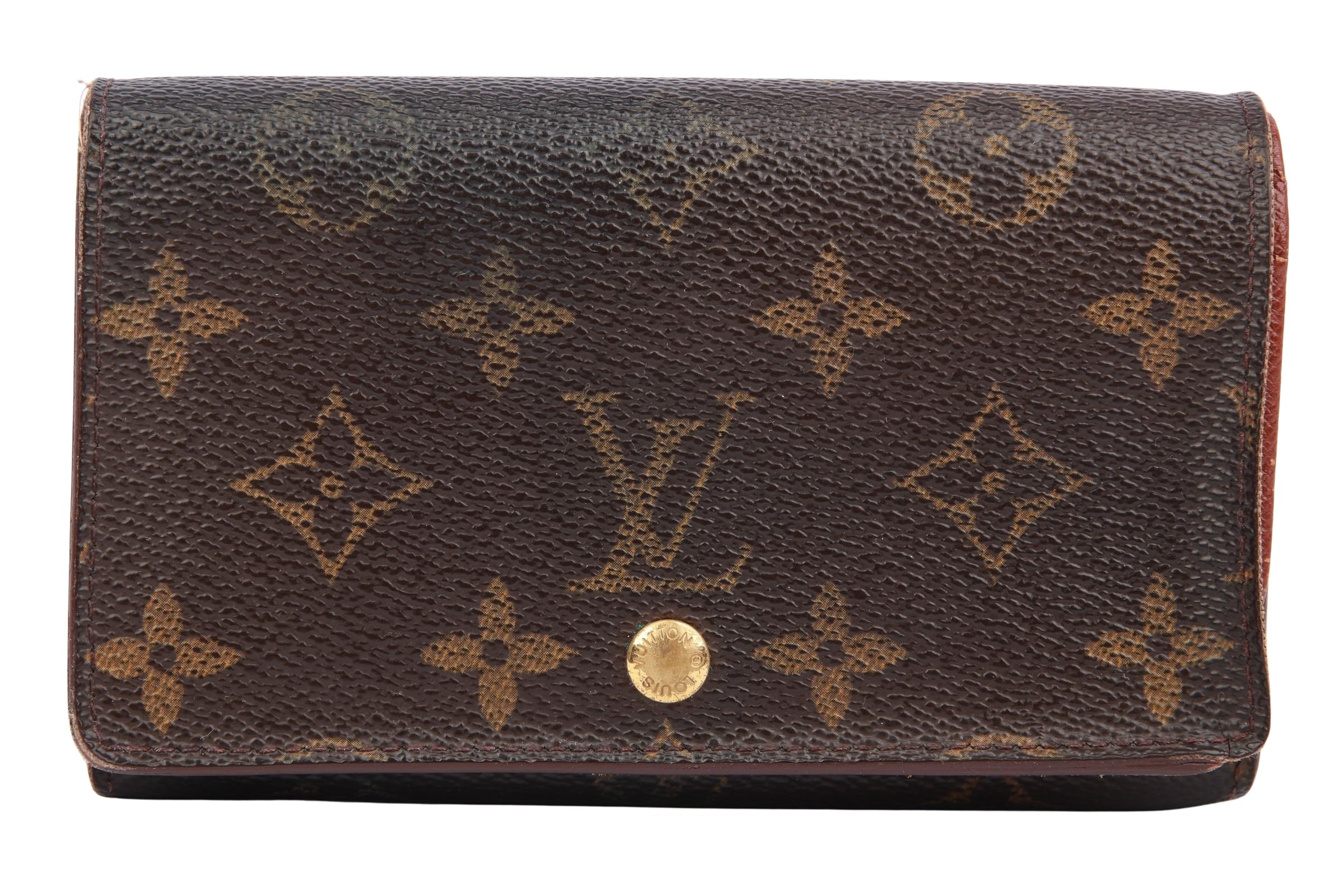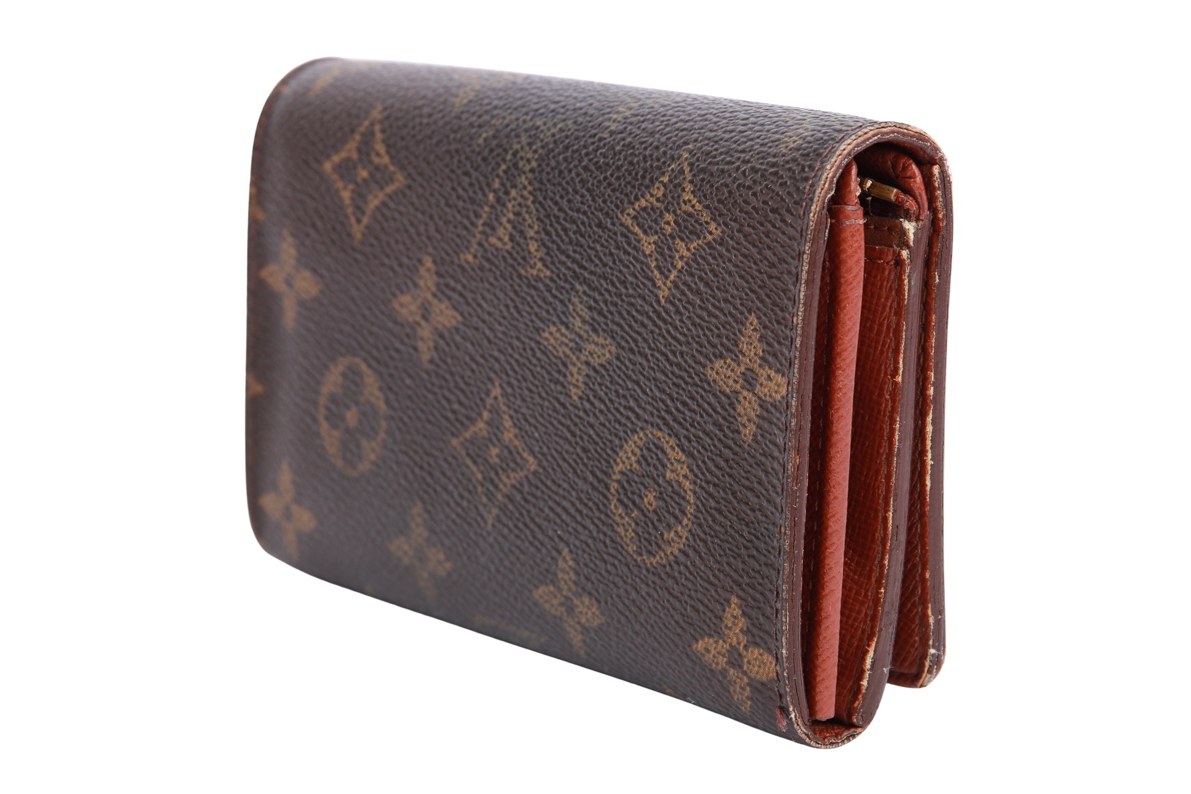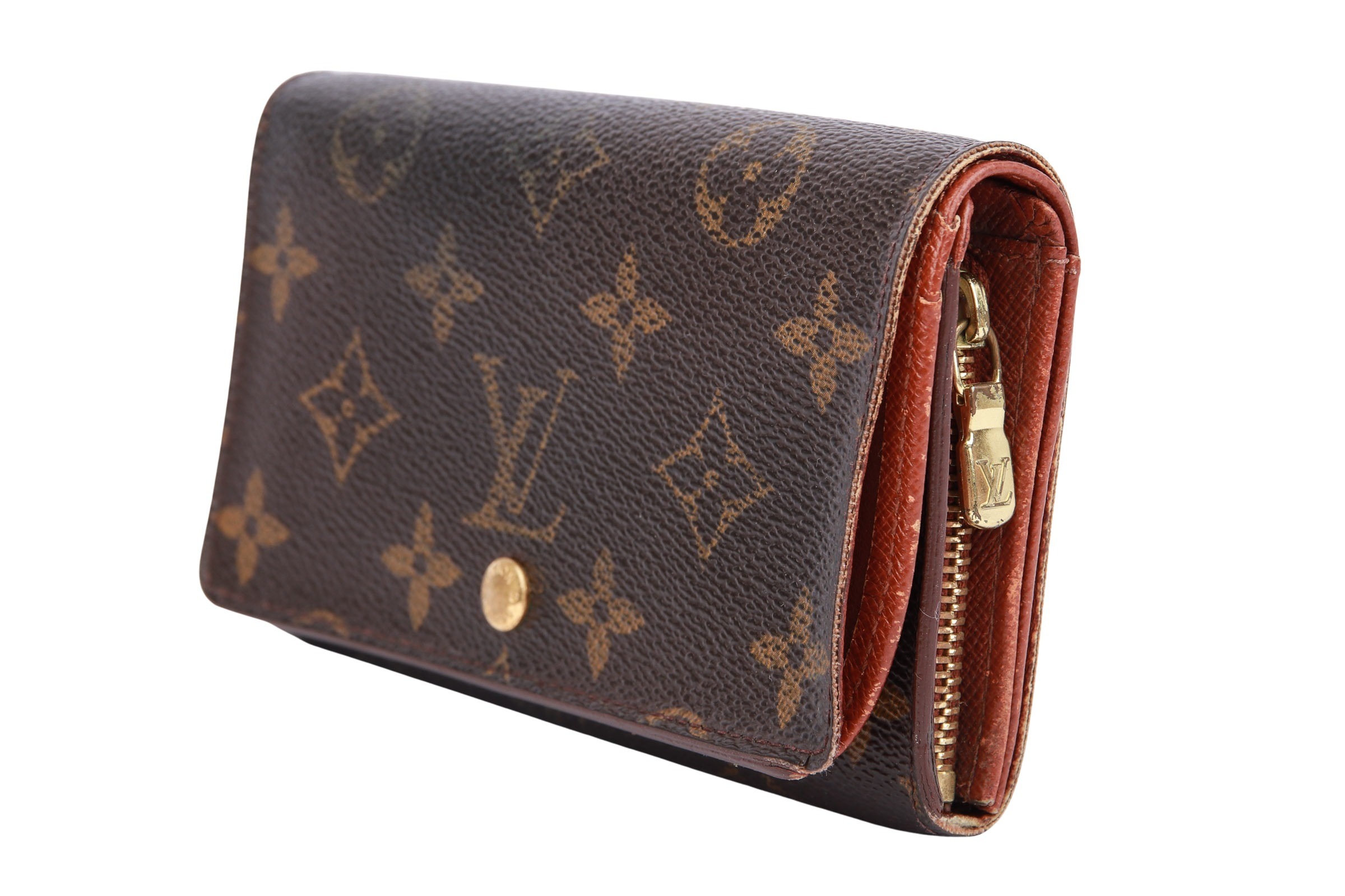 Das Louis Vuitton Porte Trésor Monogram Canvas ist ein klassisches Damenportemonnaie aus dem ikonischen LV-Monogram Canvas mit braunem Lederfutter. Es besitzt eine aufklappbare Klappe mit Druckknopfverschluss, Scheinfächer sowie ein Münzfach mit separatem Verschluss  Das Material ist langlebig, wasserabweisend und mit goldfarbener Hardware versehen.