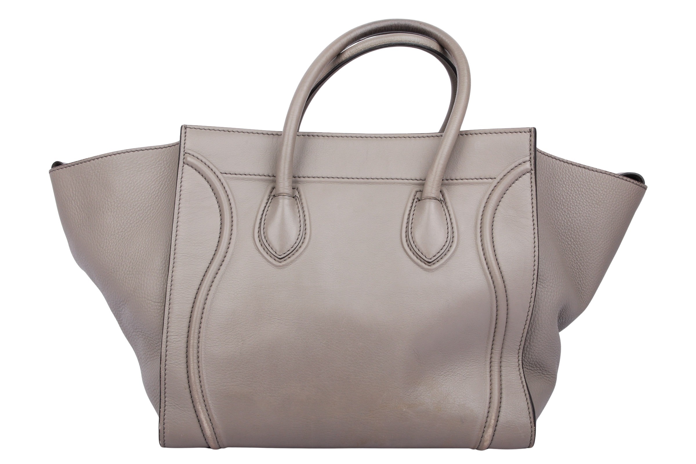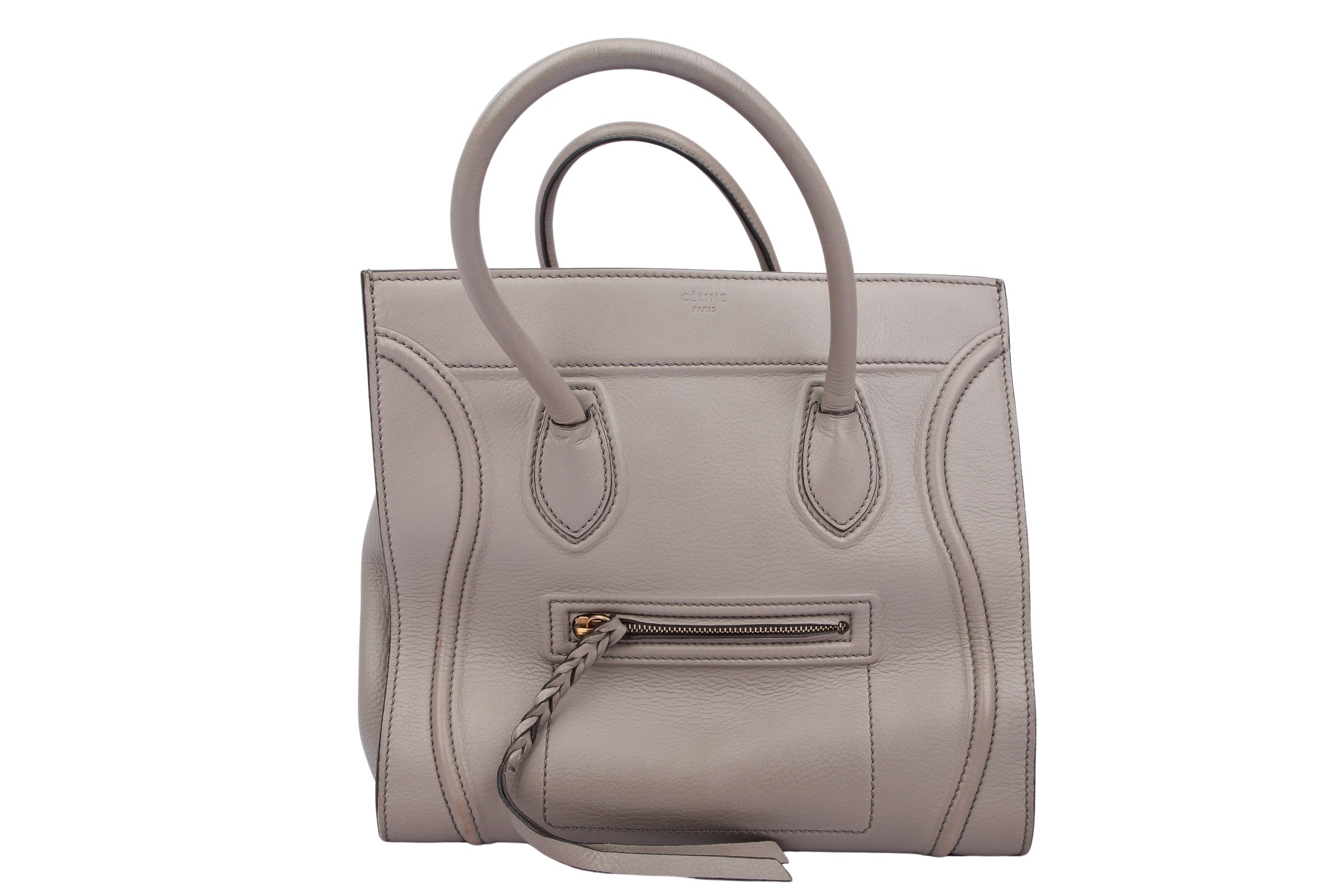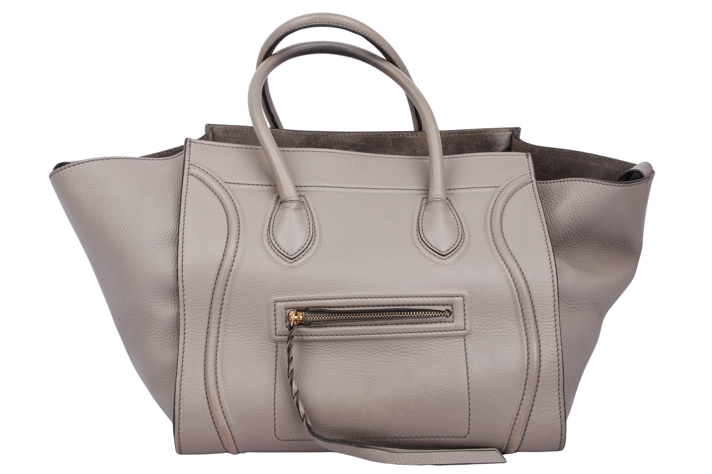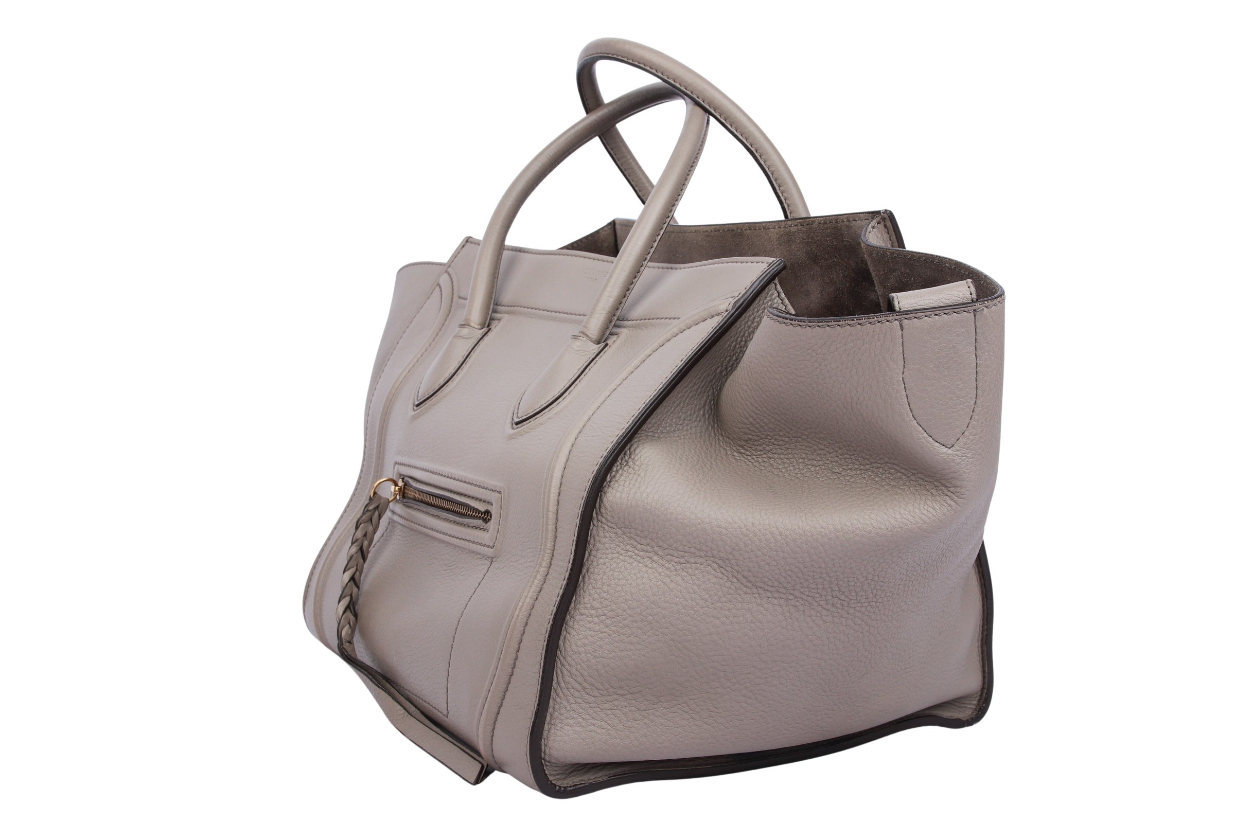Eine kompakte Eleganz in ruhigem Grau: Die Phantom Small aus der Luggage/Phantom Serie von Céline besticht durch ihre markante Silhouette mit „Flügeln“ seitlich, die dem Design Volumen und Charakter verleihen. Das strukturierte Kalbsleder mit matter Textur sorgt für Langlebigkeit und edle Optik. Vorn findet sich eine Reißverschlusstasche, die den Look bereichert und gleichzeitig praktischen Stauraum bietet. Die Tasche besitzt zwei kurze Griffe zum Tragen in der Hand, ideal für Tage, an denen Stil genauso zählt wie Funktion. Abschließend sorgen dezente Hardware und ein Innenfach mit Reißverschluss für Organisation und hochwertige Details.