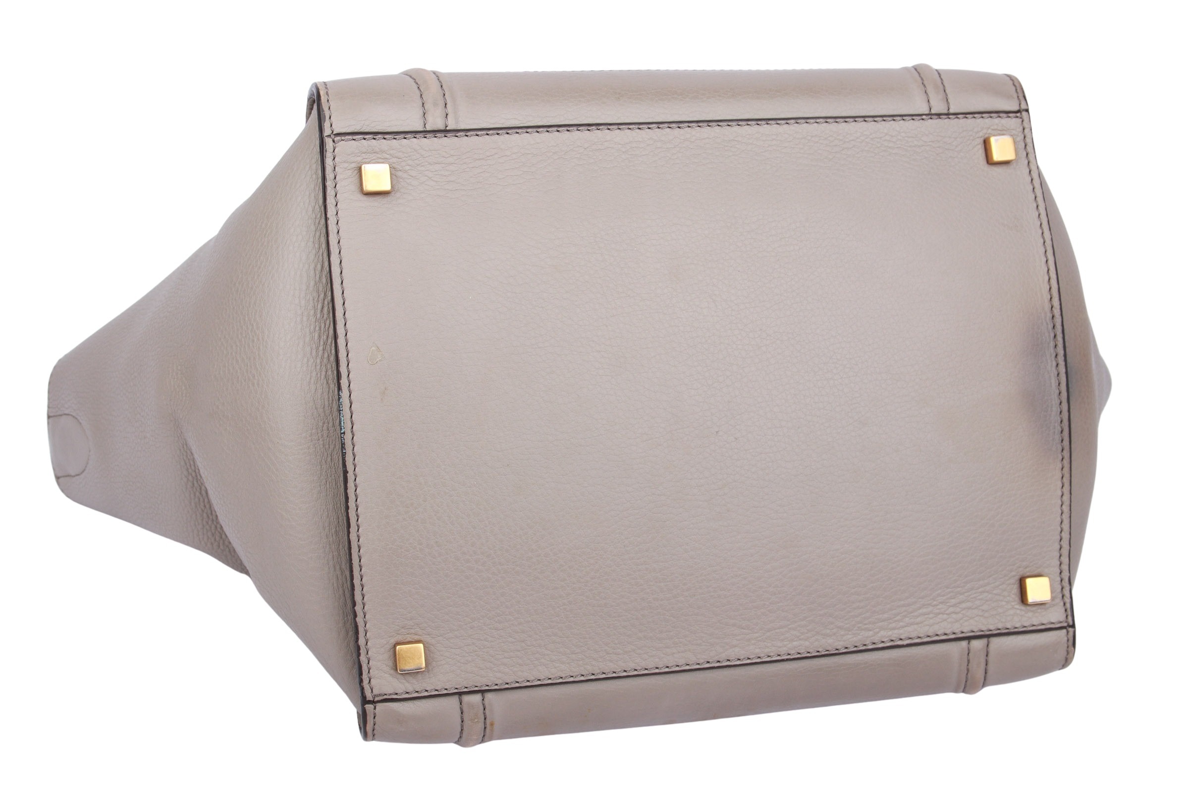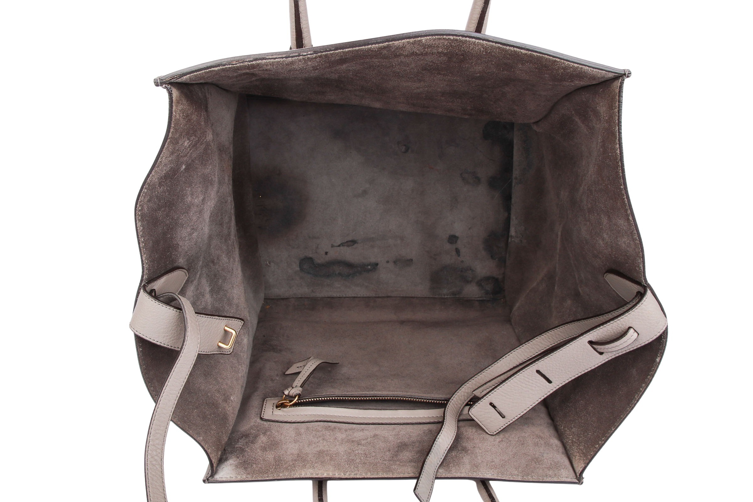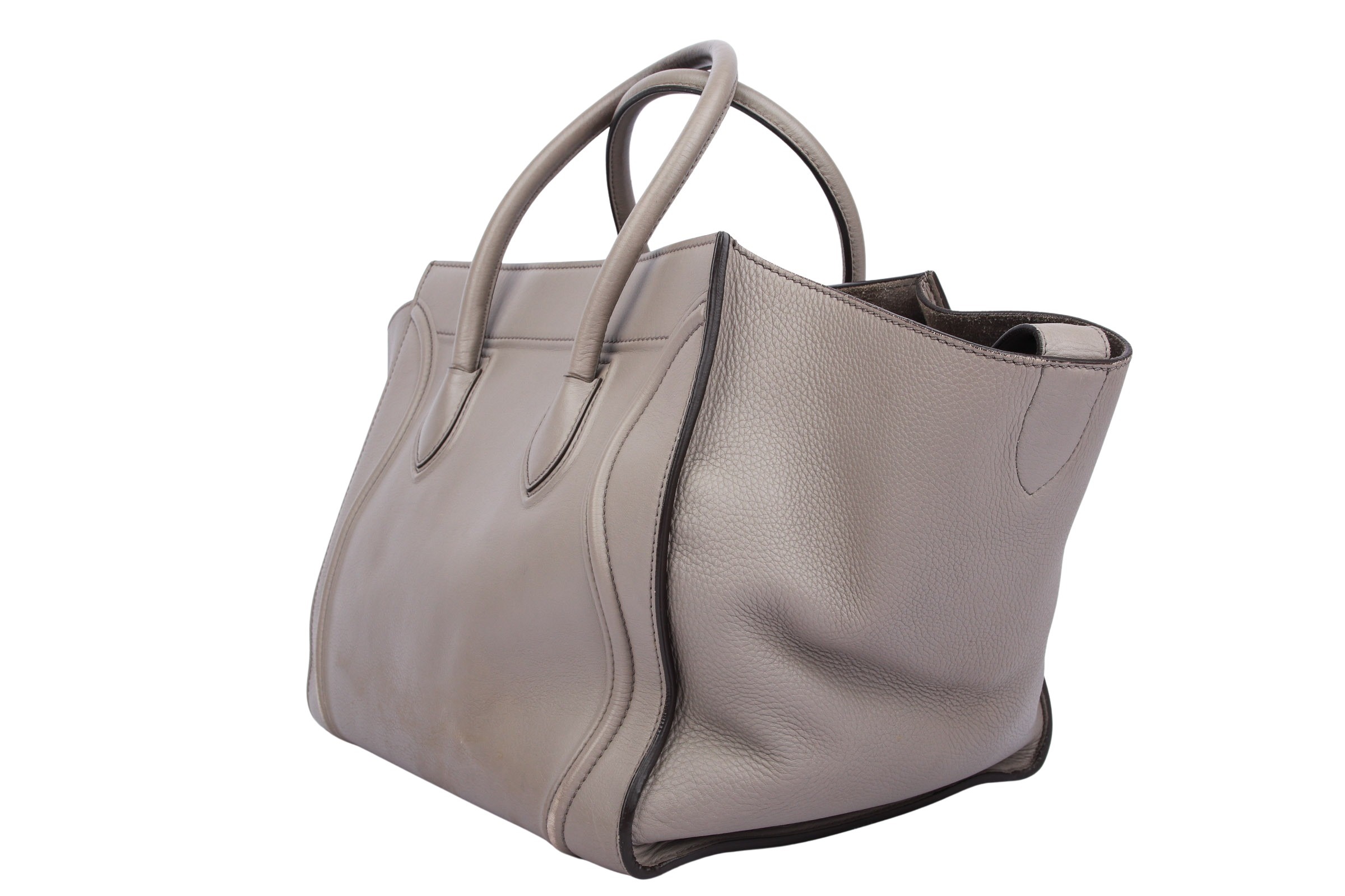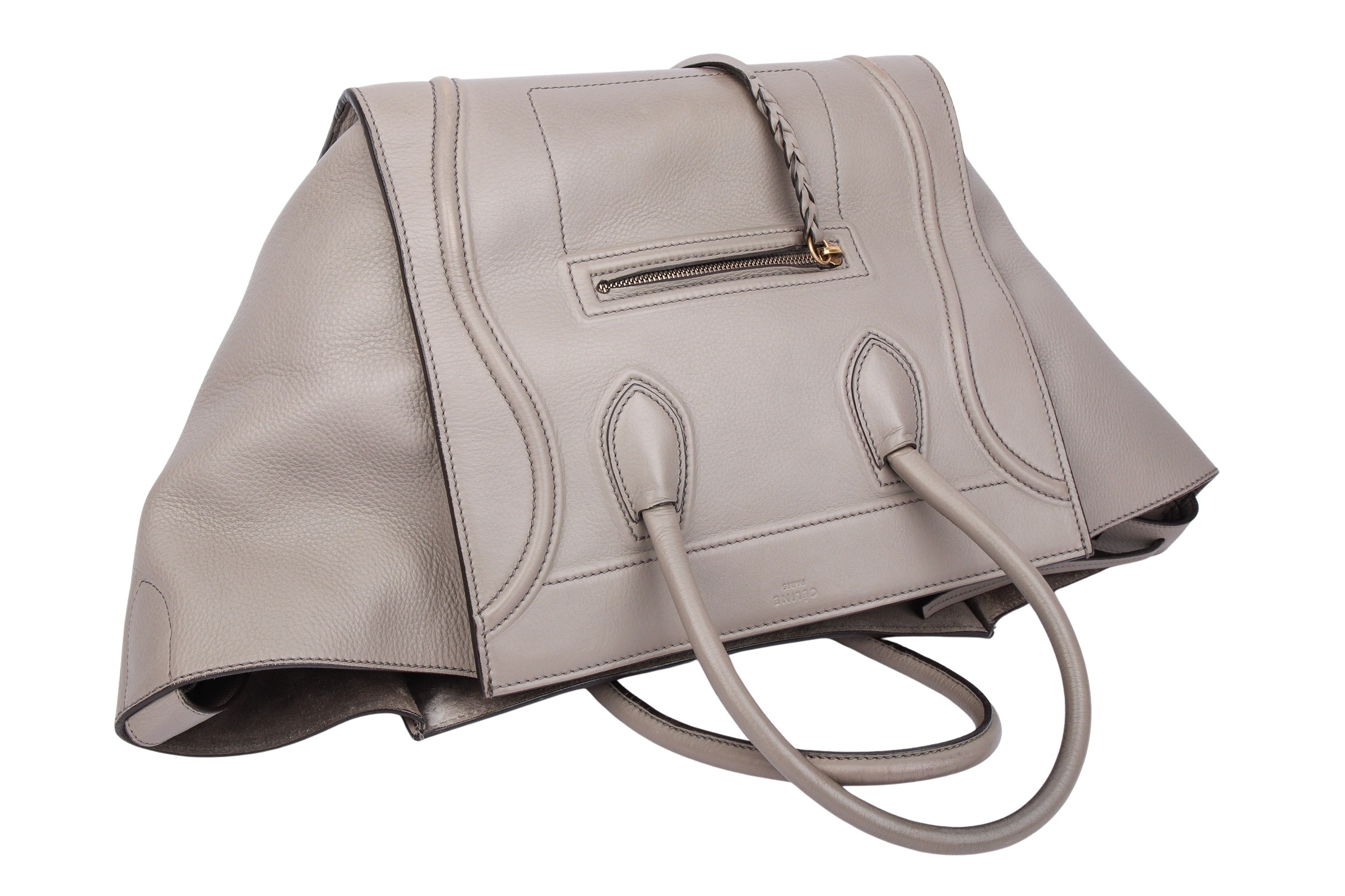 Eine kompakte Eleganz in ruhigem Grau: Die Phantom Small aus der Luggage/Phantom Serie von Céline besticht durch ihre markante Silhouette mit „Flügeln“ seitlich, die dem Design Volumen und Charakter verleihen. Das strukturierte Kalbsleder mit matter Textur sorgt für Langlebigkeit und edle Optik. Vorn findet sich eine Reißverschlusstasche, die den Look bereichert und gleichzeitig praktischen Stauraum bietet. Die Tasche besitzt zwei kurze Griffe zum Tragen in der Hand, ideal für Tage, an denen Stil genauso zählt wie Funktion. Abschließend sorgen dezente Hardware und ein Innenfach mit Reißverschluss für Organisation und hochwertige Details.