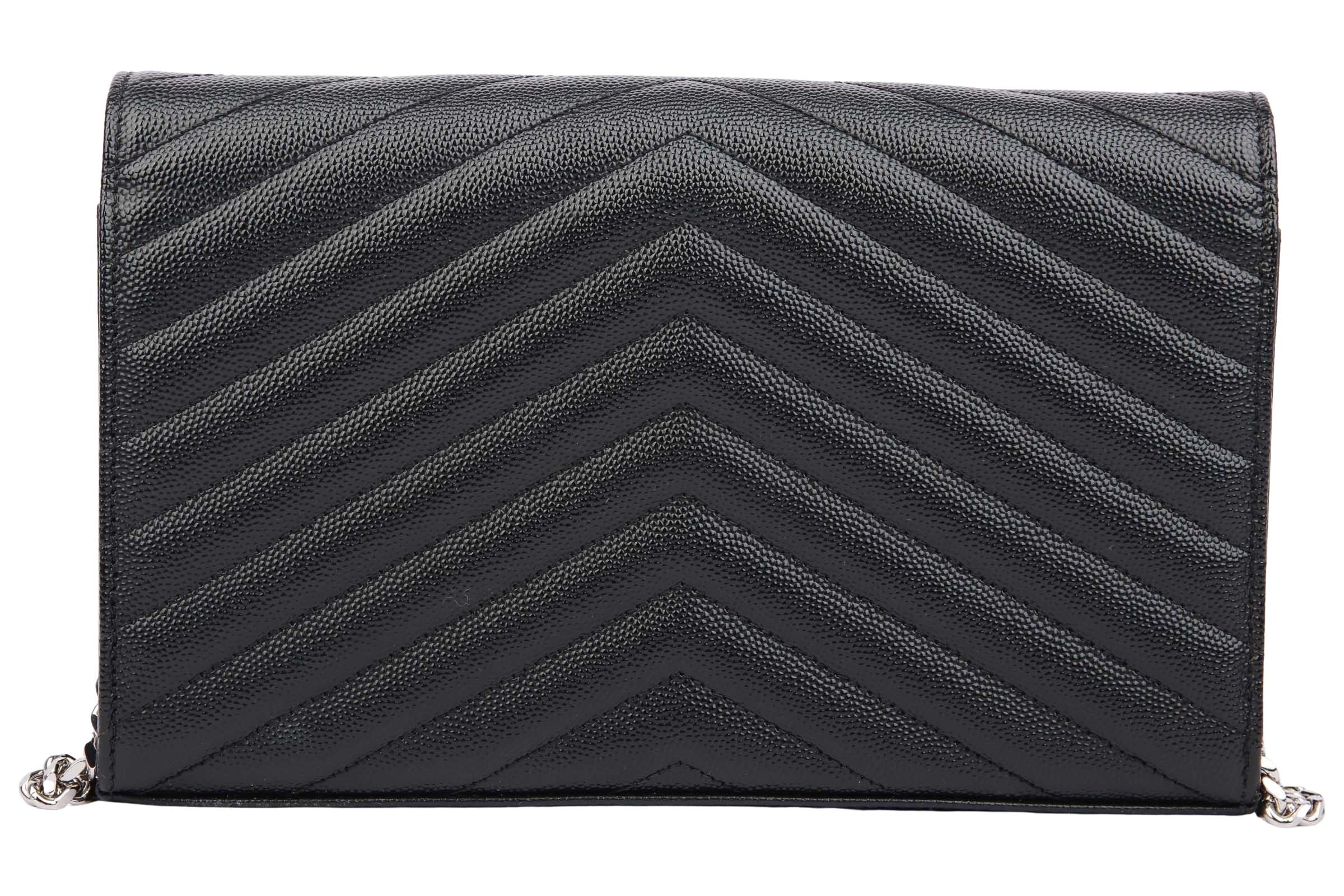 Die Saint Laurent Cassandre Wallet On Chain in Schwarz ist eine elegante und vielseitige Crossbody-Tasche, die Funktionalität mit zeitloser Eleganz verbindet. Die Tasche ist aus hochwertigem Leder gefertigt und besticht durch ihr schlankes Design und die charakteristische YSL-Logo-Schnalle auf der Umschlagklappe.