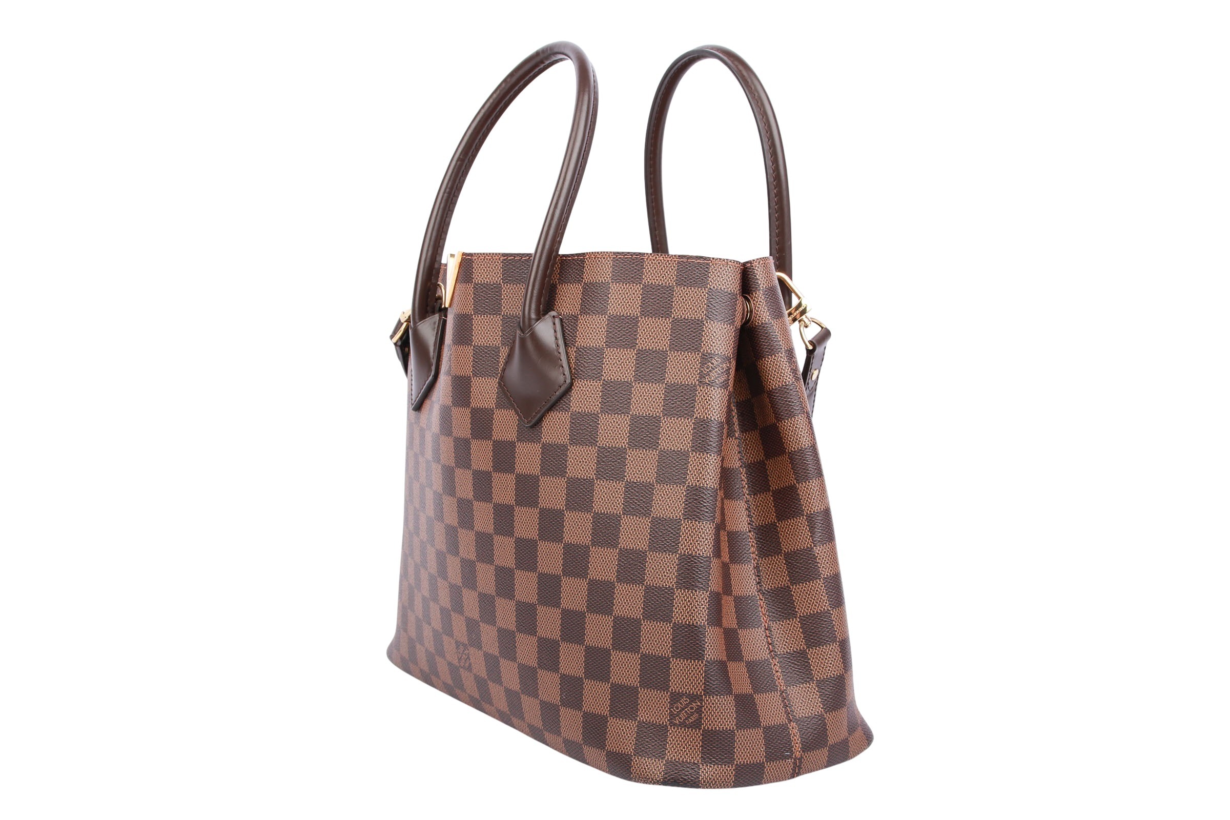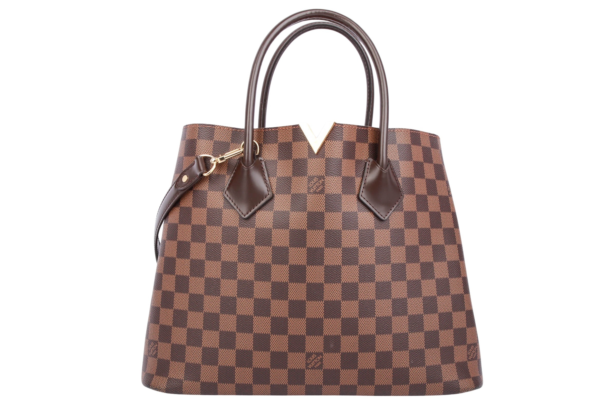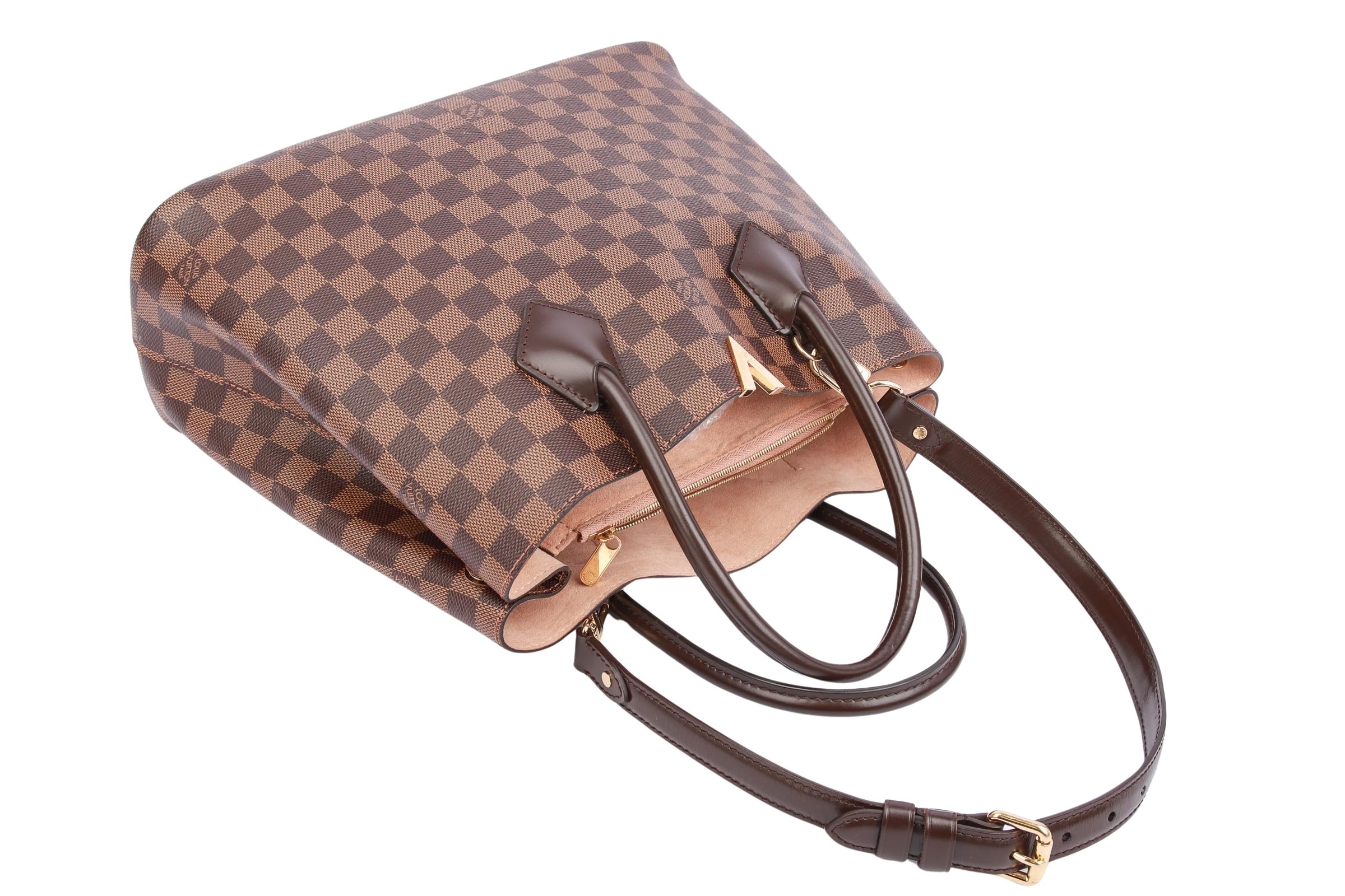 Die Louis Vuitton Kensington vereint klassische Eleganz mit modernem Chic. Gefertigt aus dem ikonischen Damier Ebene Canvas, besticht die Tasche durch ihr strukturiertes Design und ihre raffinierten Details – darunter elegante Lederbesätze und goldfarbene Metall-Elemente. Mit dem praktischen Reißverschluss, den zwei Tragegriffen und dem abnehmbaren Schulterriemen ist sie der ideale Begleiter für stilvolle Alltagslooks oder gehobene Business-Outfits.