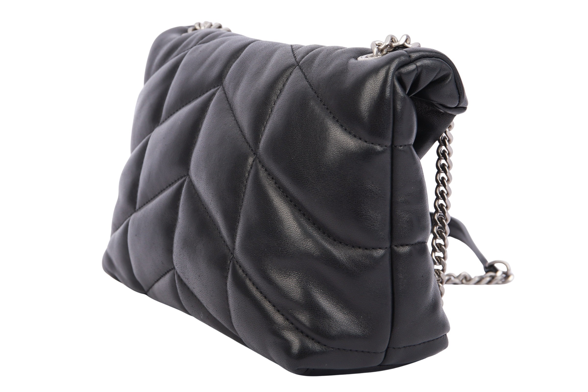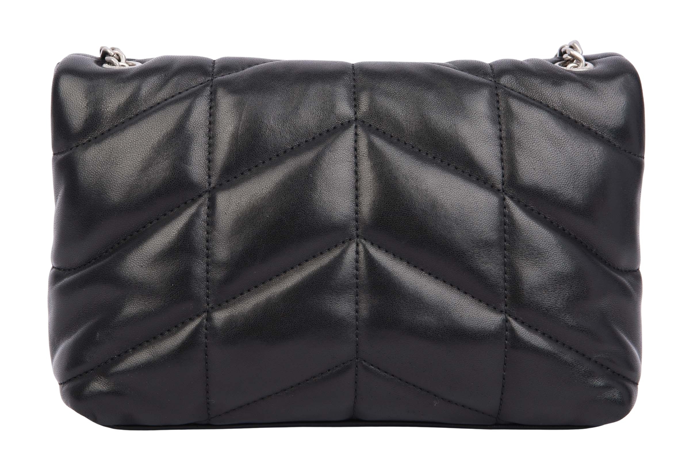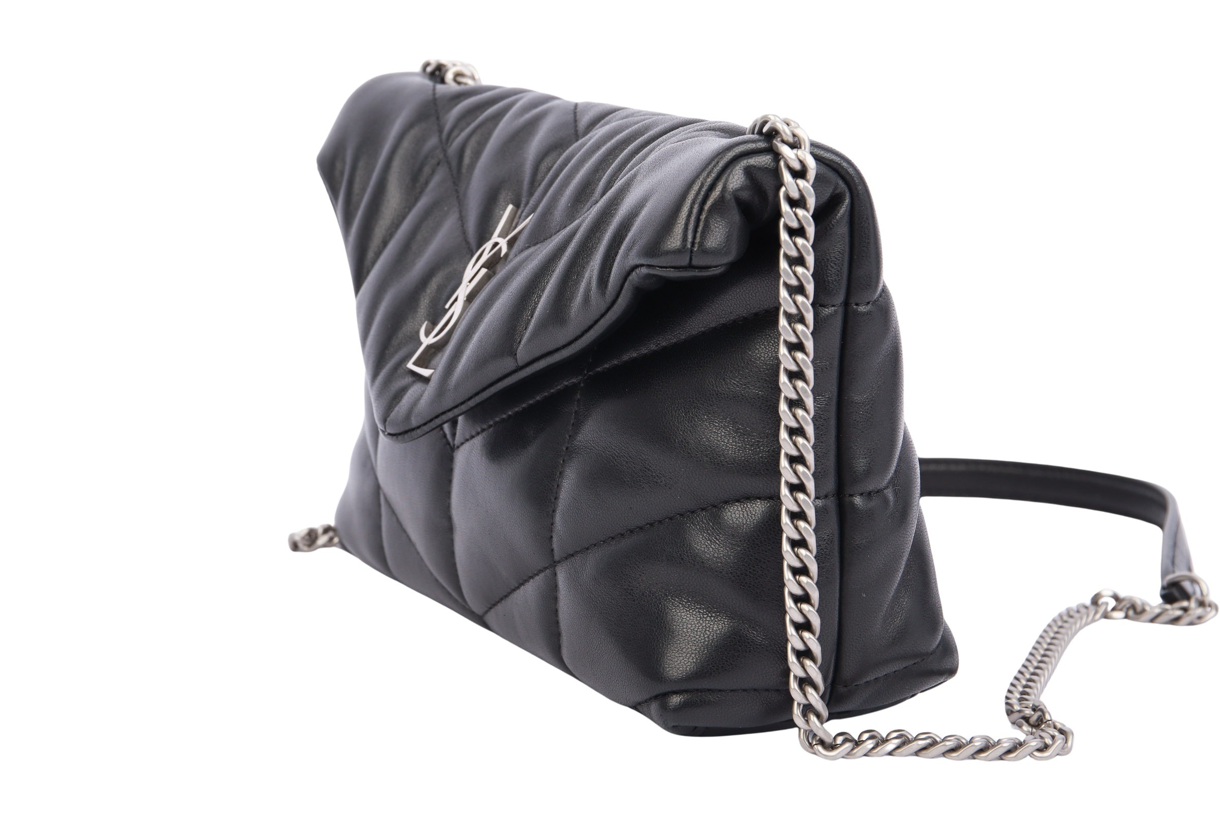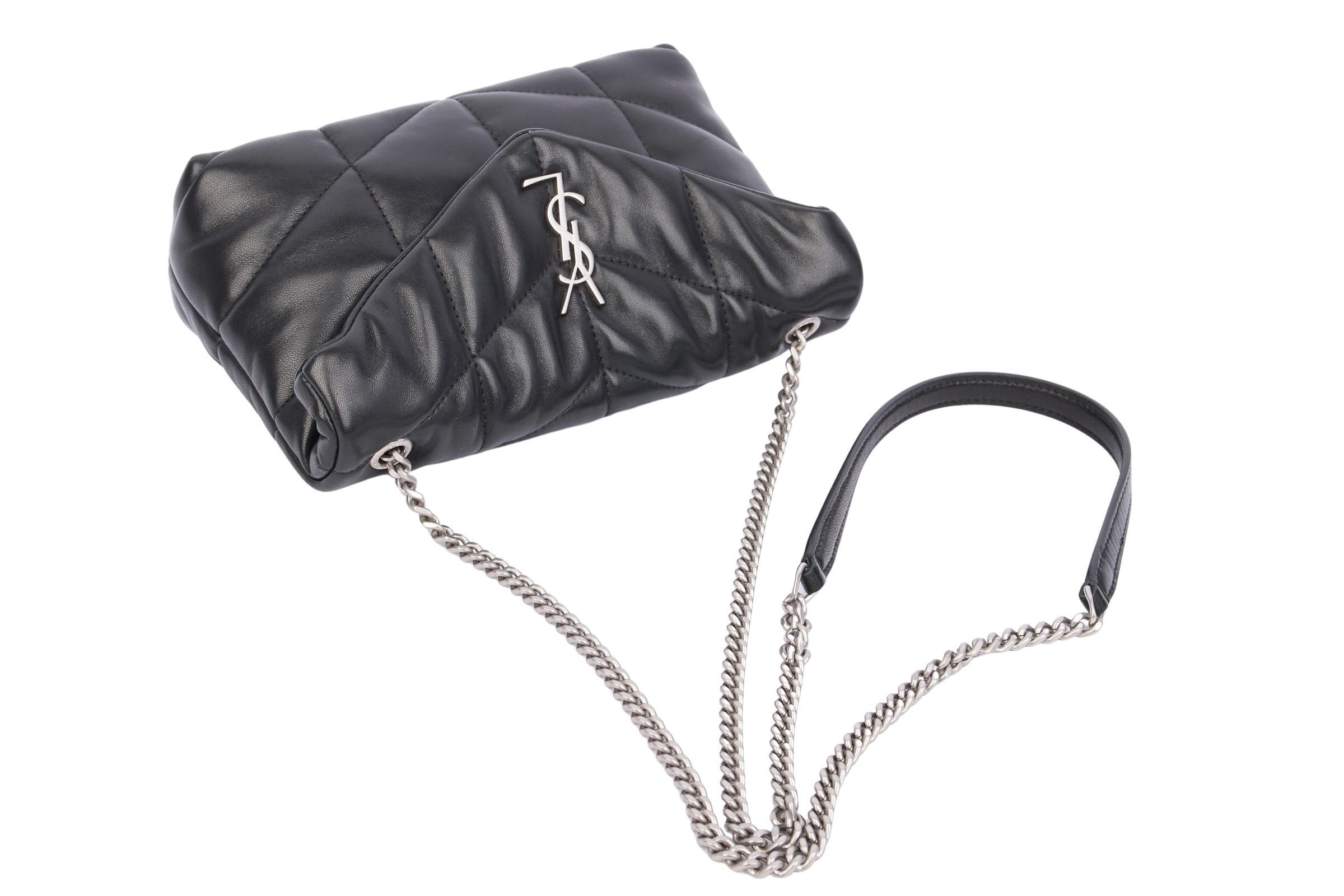 Saint Laurent Loulou Puffer – eine luxuriöse Schultertasche aus weich gepolstertem, gestepptem Lammleder in Schwarz. Sie hat ein ikonisches YSL-Logo aus Metall auf der Klappe, einen verstellbaren Kettenriemen (Crossbody oder Schulter tragbar) und schließt mit einem Magnetknopf. Innen bietet sie ein Textilfutter mit Reißverschluss- und Steckfach. Der Look ist weich, voluminös und gleichzeitig elegant.