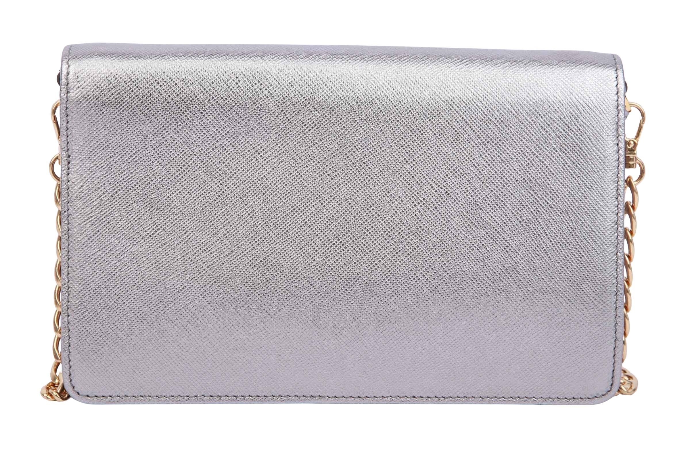 Silver Saffiano Leather Wallet on Chain – elegante Mini-Tasche aus silberfarbenem, kratzfestem Saffiano-Leder.