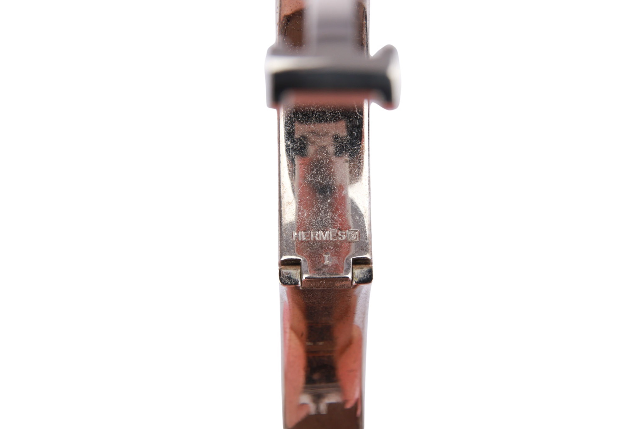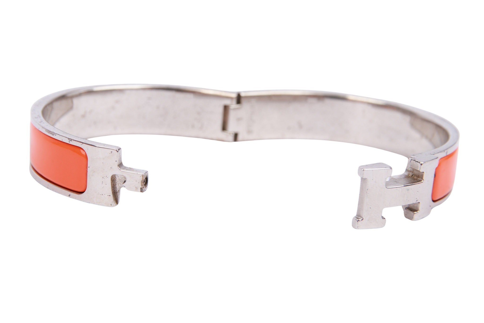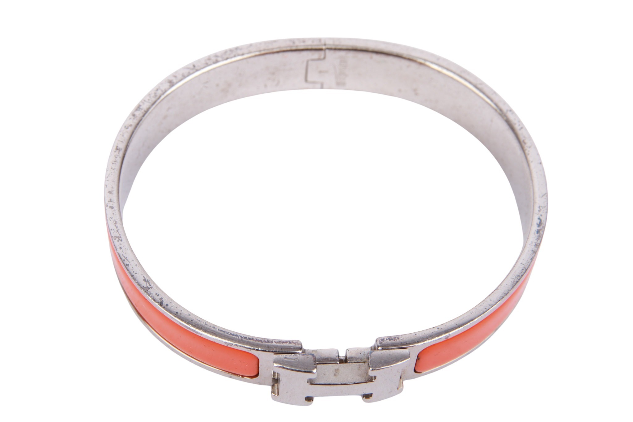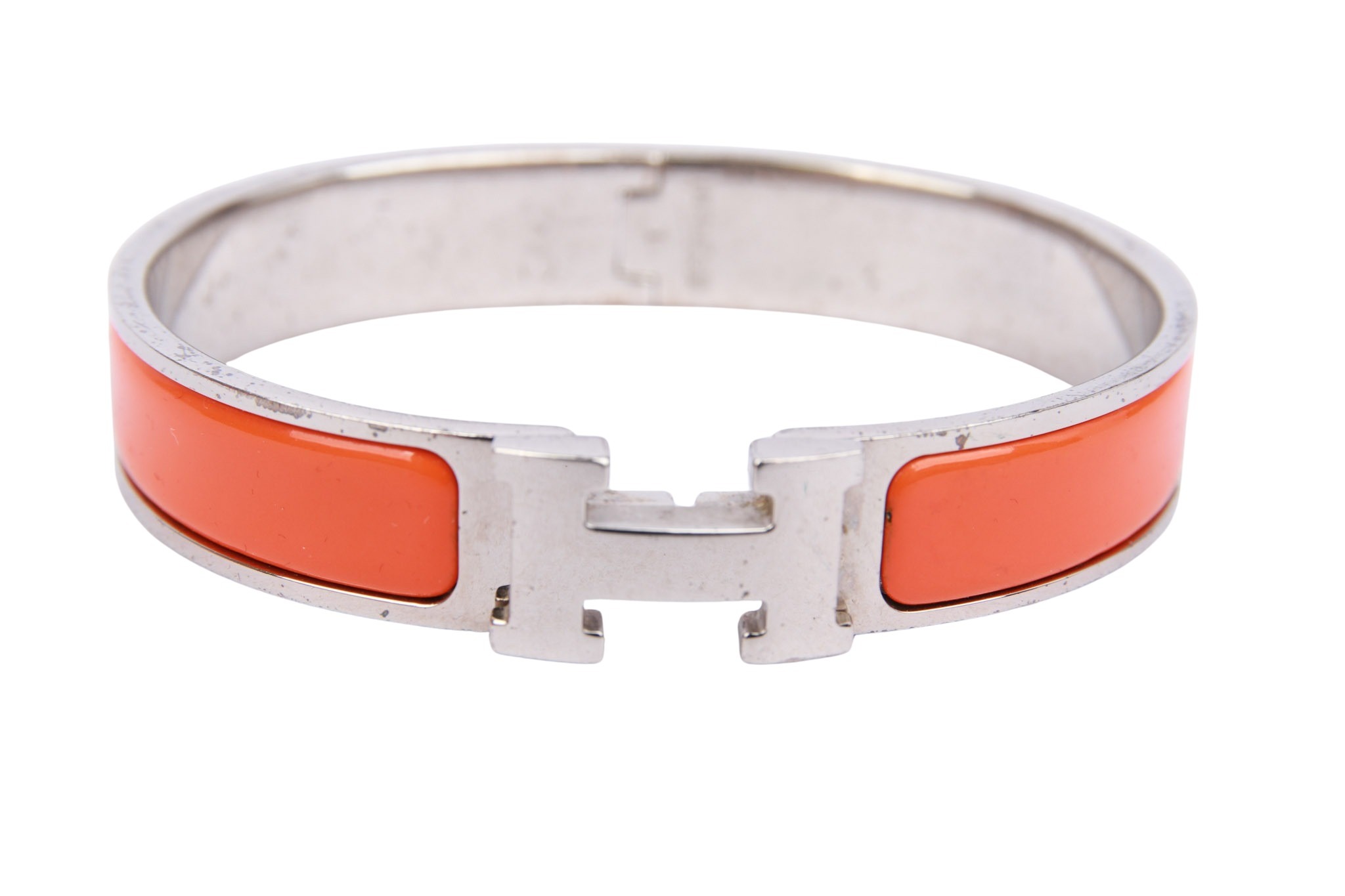 Der Hermès H Clic Clac Armreif vereint zeitlose Eleganz mit modernem Chic. Das ikonische H-Logo in vergoldetem Metall steht im Mittelpunkt des Designs und verleiht dem Schmuckstück sofortige Wiedererkennbarkeit. Der glänzende Emaille-Einsatz in sanftem Rosaton sorgt für eine feminine, edle Ausstrahlung und lässt sich sowohl zu Alltagslooks als auch zu Abendoutfits perfekt kombinieren.
