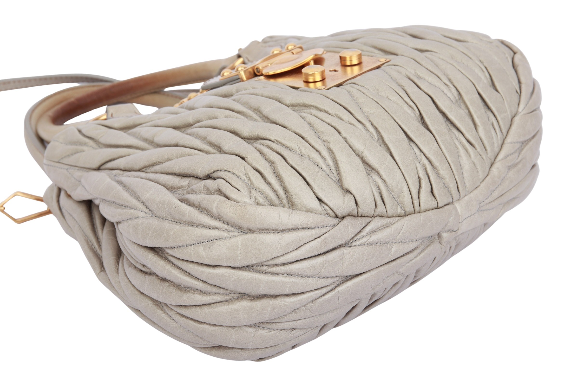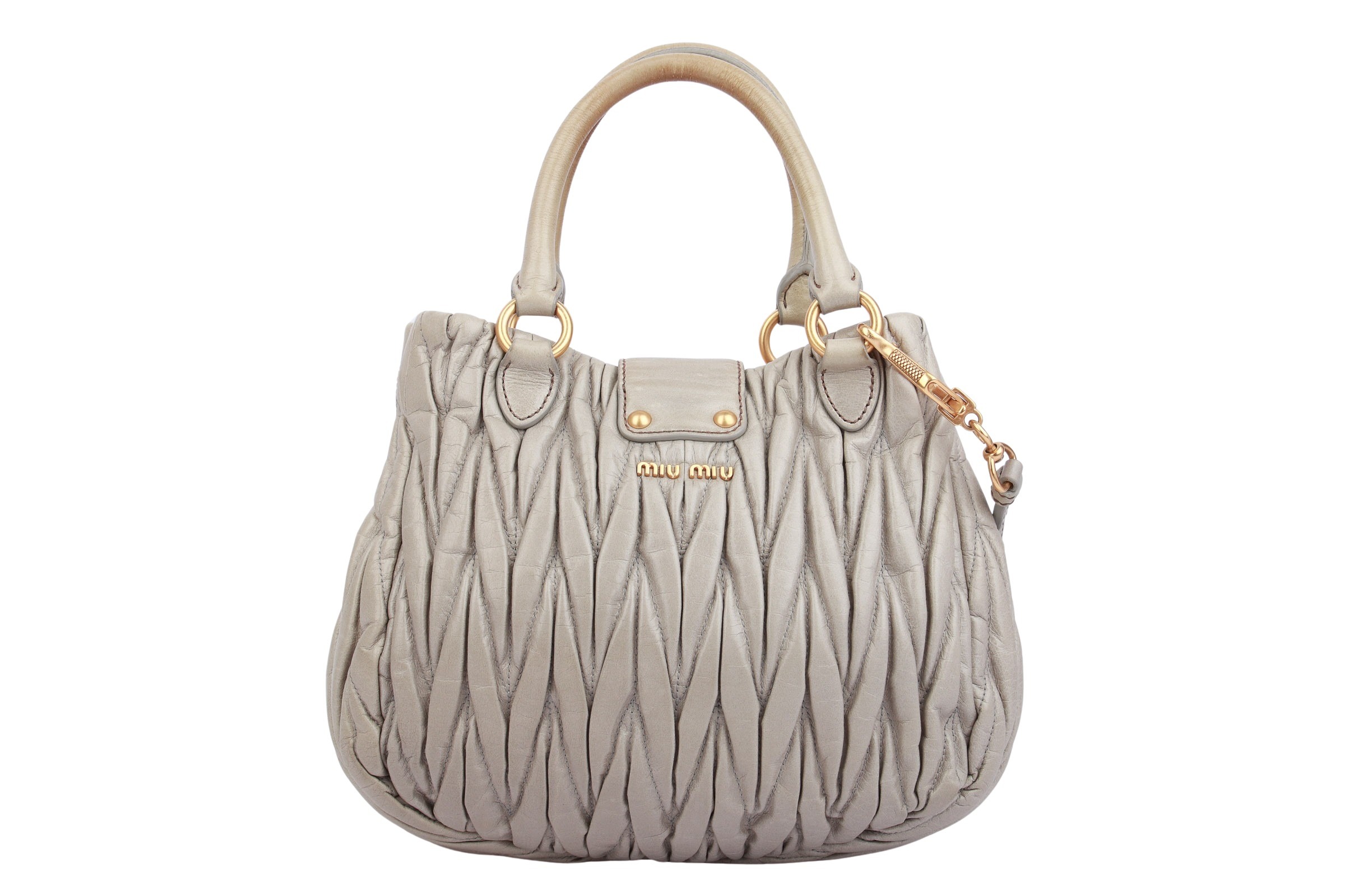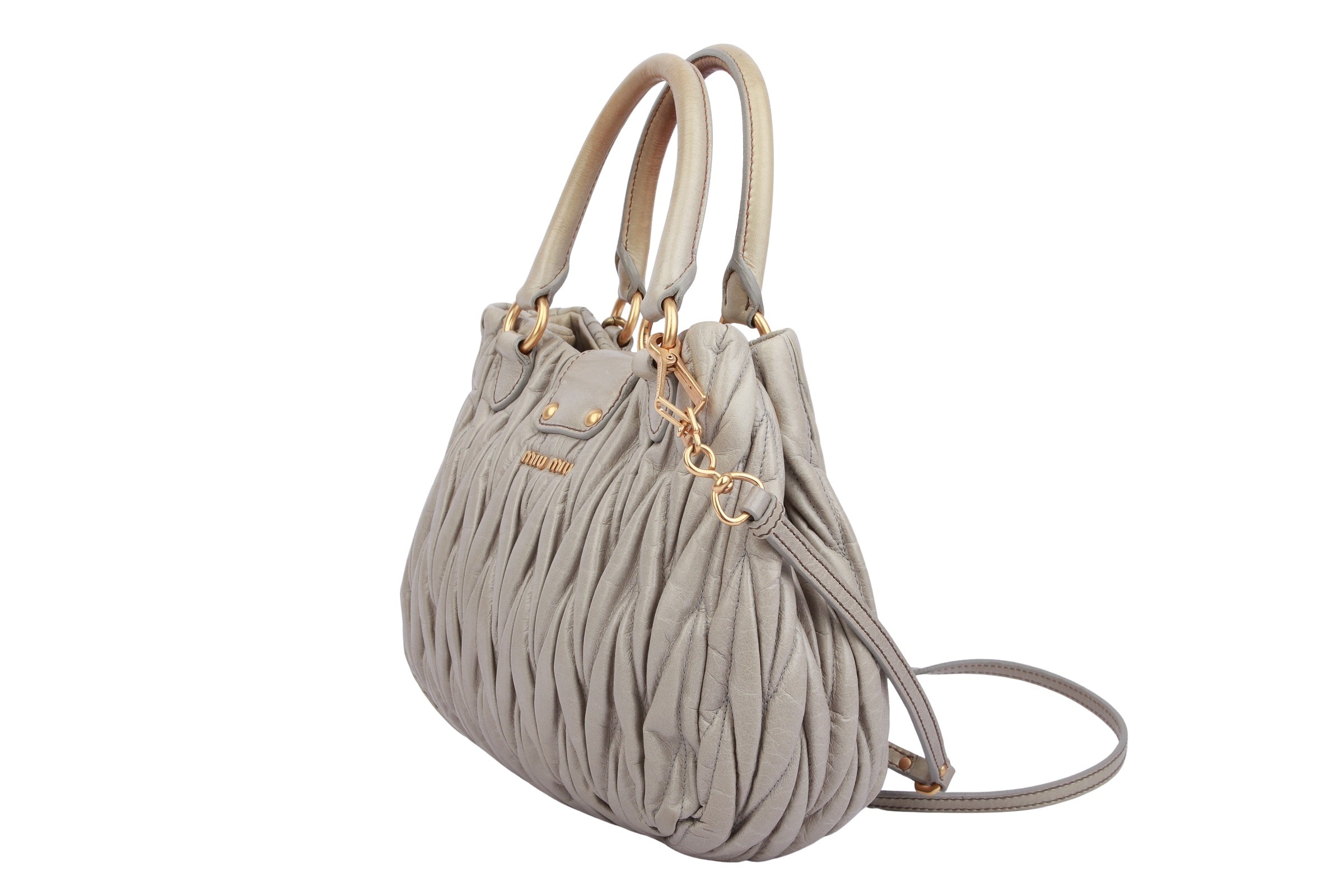 Die Miu Miu Matelassé Umhängetasche in elegantem Grau vereint luxuriösen Stil mit praktischer Funktionalität. Das weiche, quilted Leder in der charakteristischen Matelassé-Optik verleiht der Tasche eine edle Textur und zeitlose Eleganz.