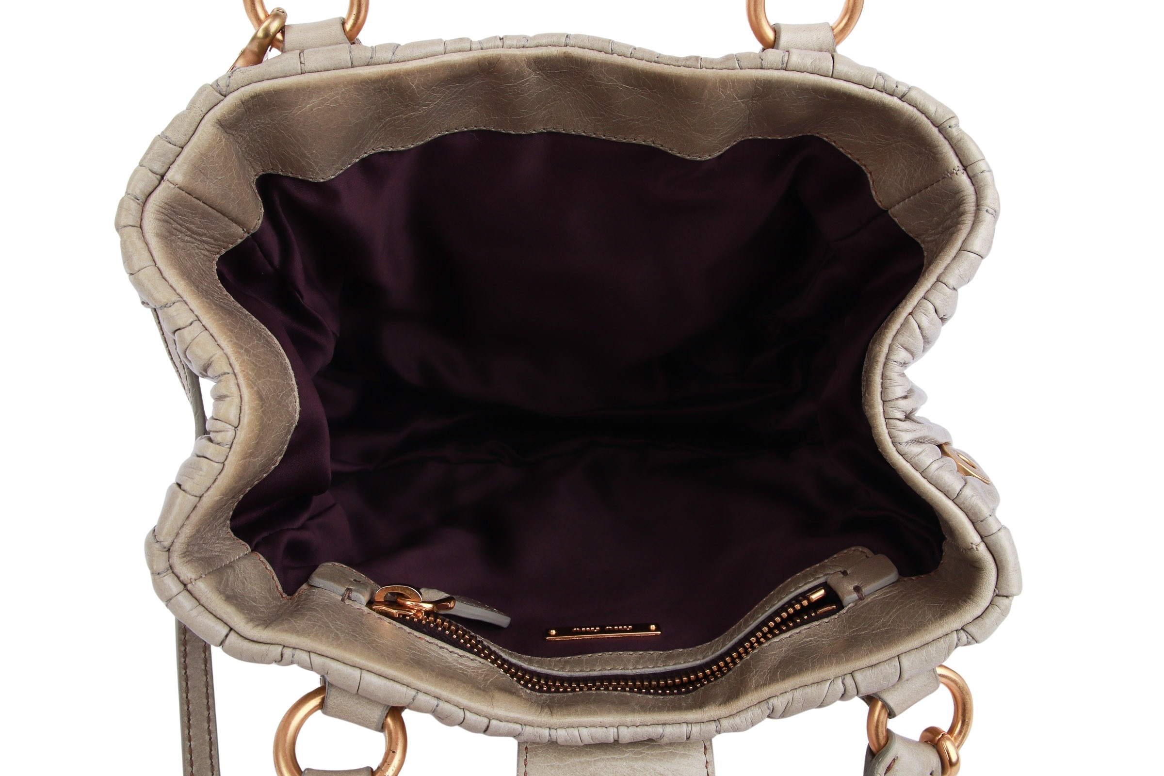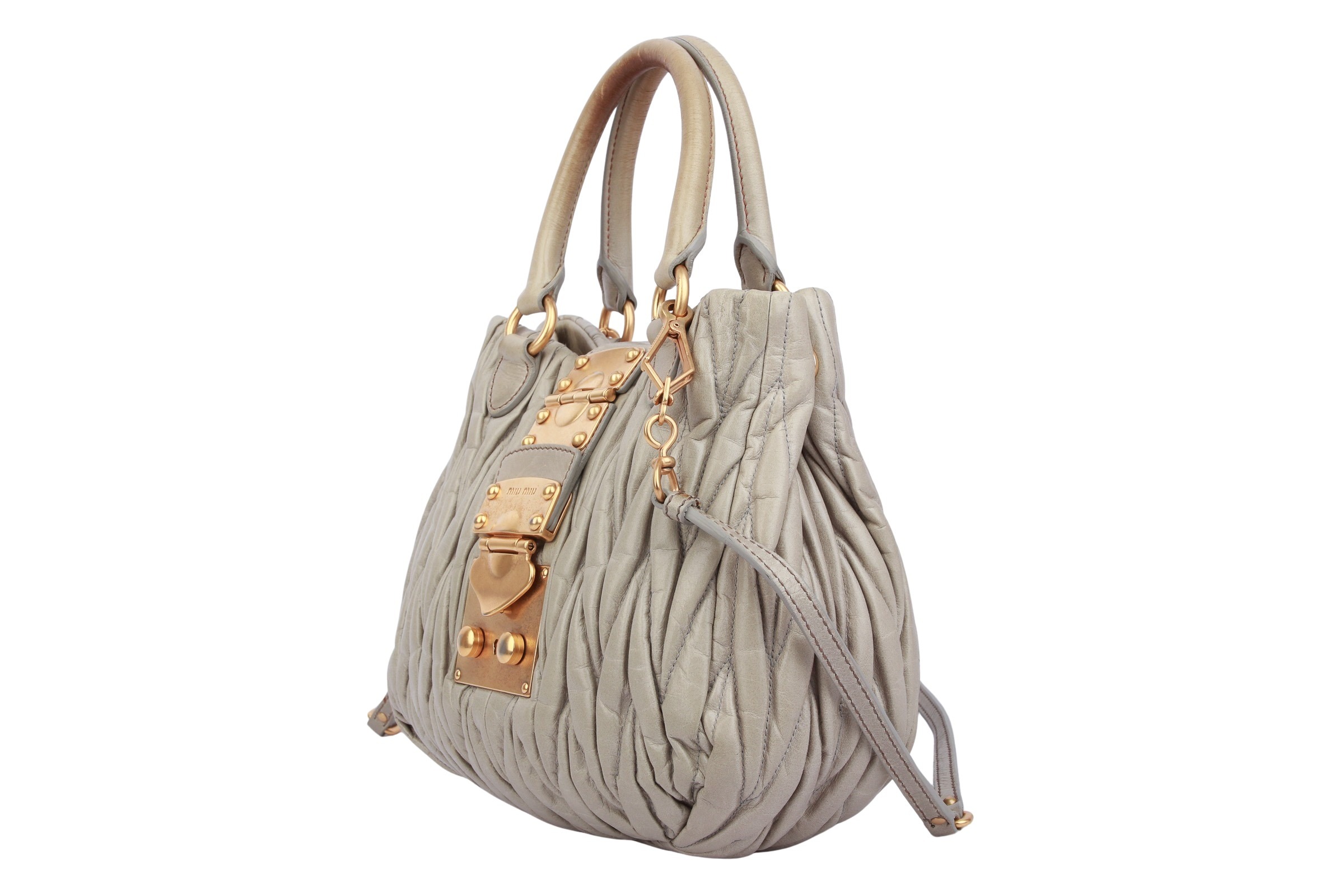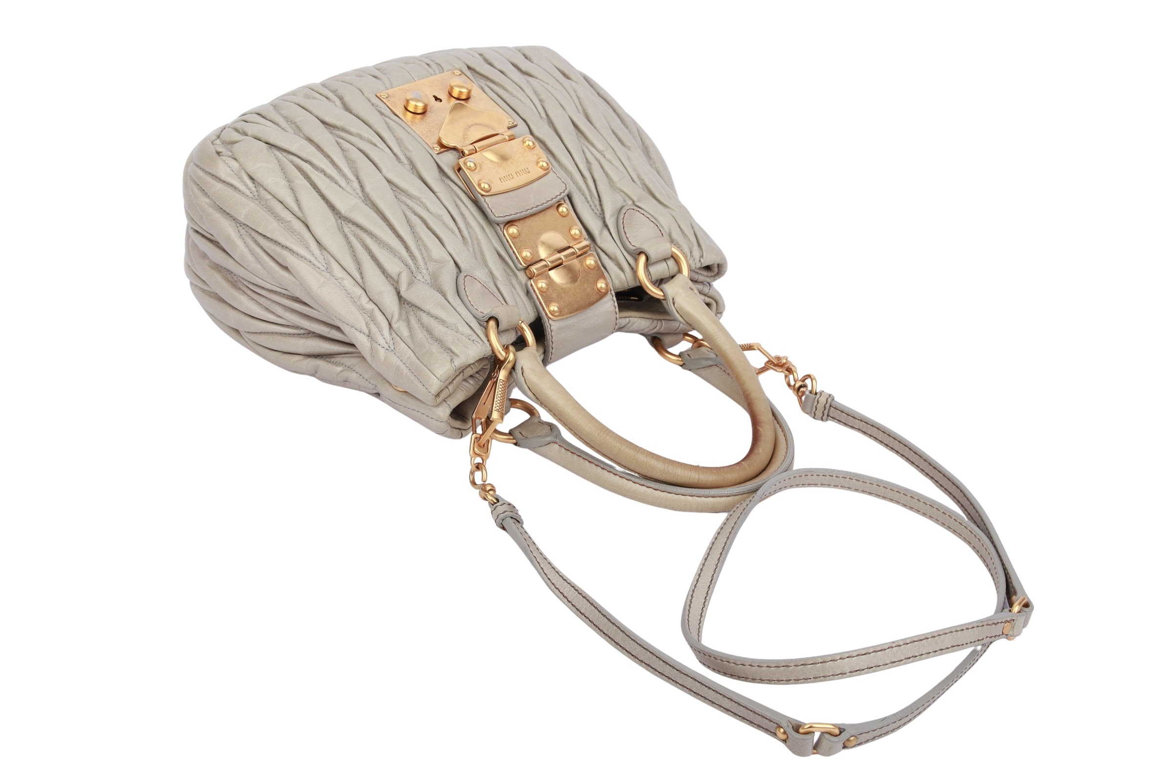 Die Miu Miu Matelassé Umhängetasche in elegantem Grau vereint luxuriösen Stil mit praktischer Funktionalität. Das weiche, quilted Leder in der charakteristischen Matelassé-Optik verleiht der Tasche eine edle Textur und zeitlose Eleganz.