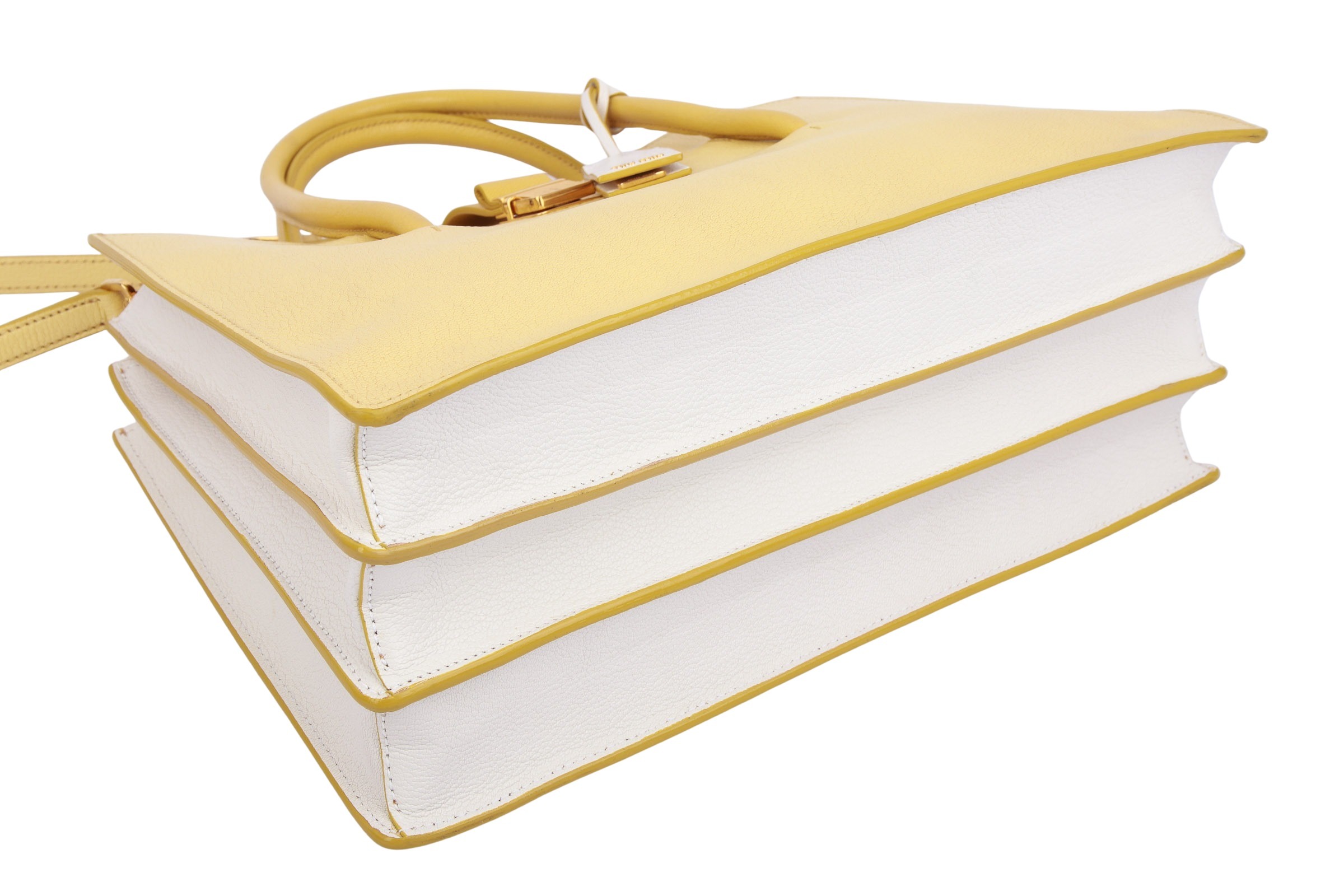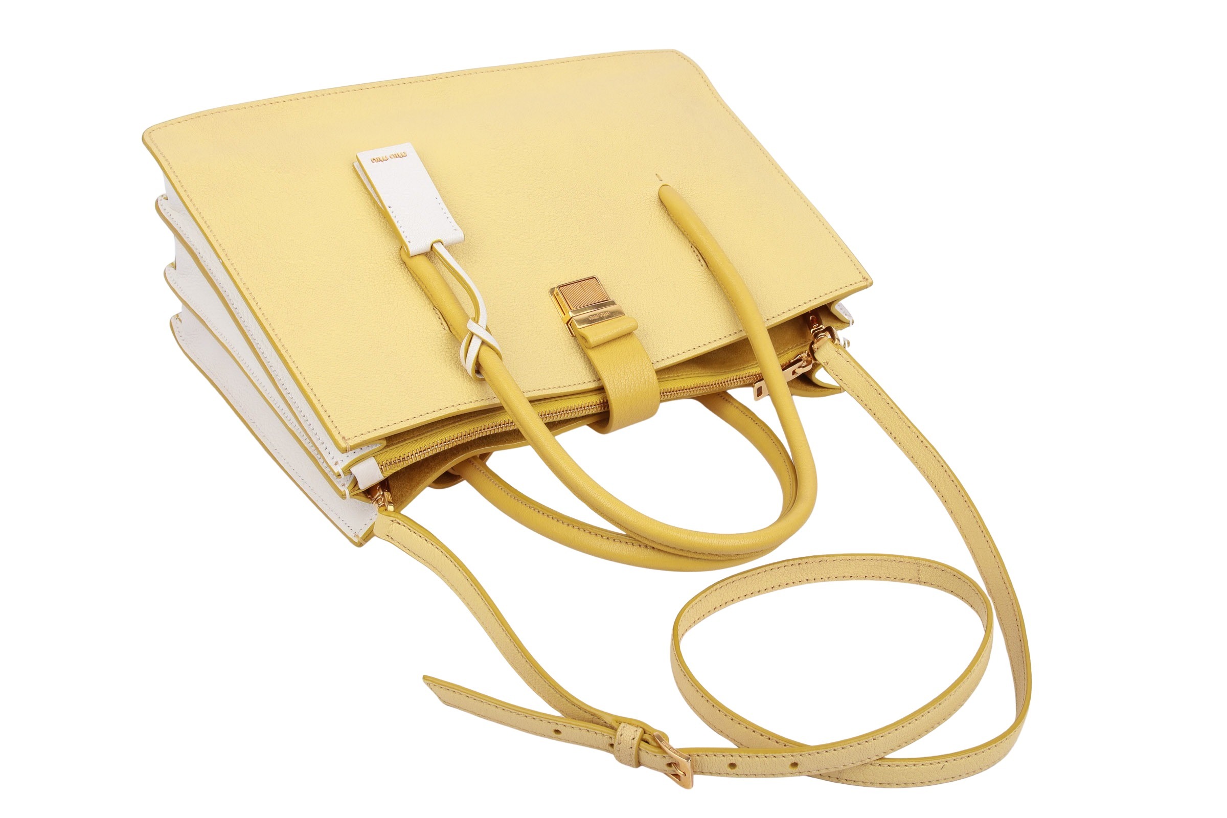 Diese stilvolle Madras-Tasche von Miu Miu vereint Eleganz und Funktionalität. Aus hochwertigem senffarbenem Leder gefertigt, besticht sie durch ihre kontrastierenden Seitenteile und den Boden. Die Tasche verfügt über zwei runde Griffe, einen sicheren Klappverschluss und ein innenliegendes Wildlederfutter. Ein luxuriöses Accessoire, das jede Sammlung bereichert.