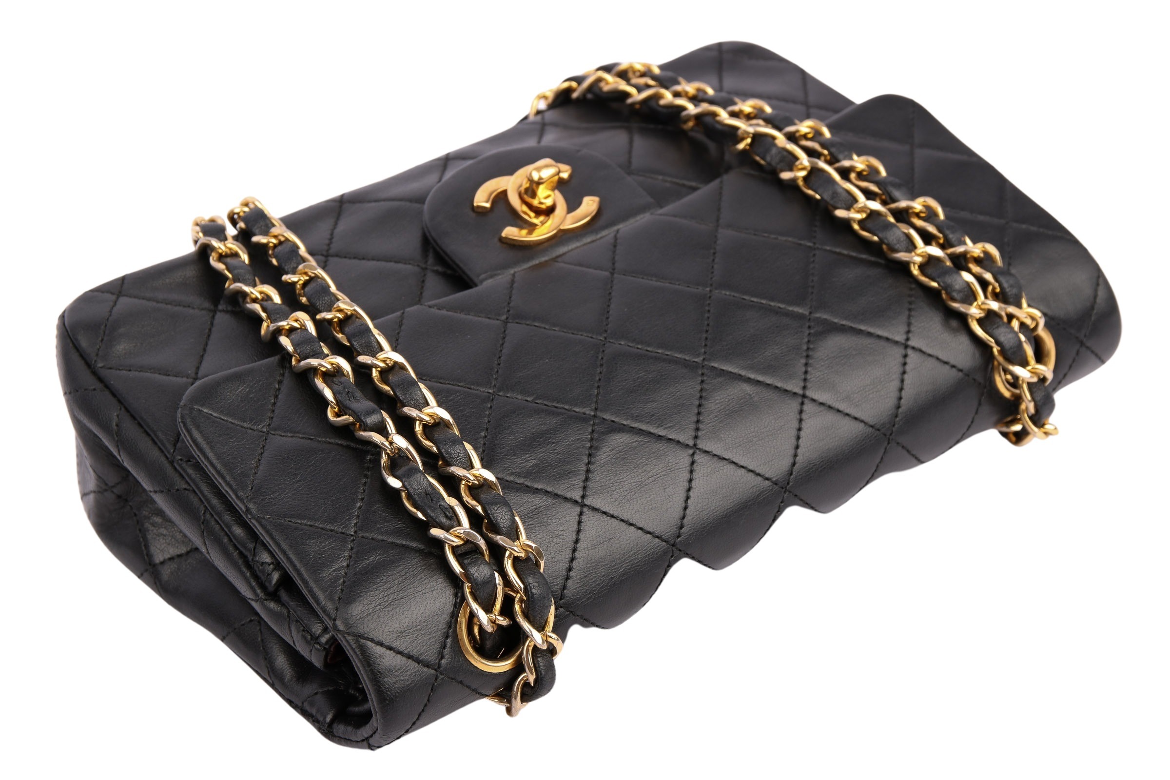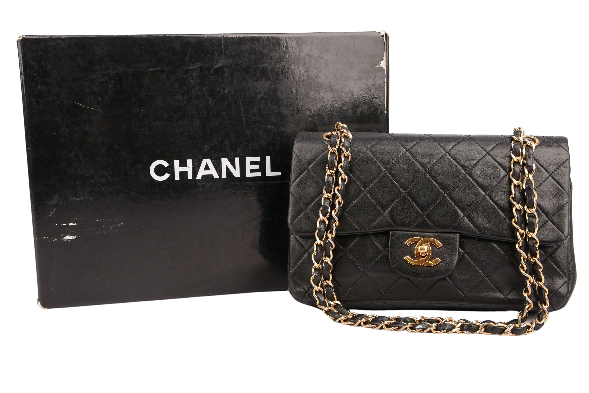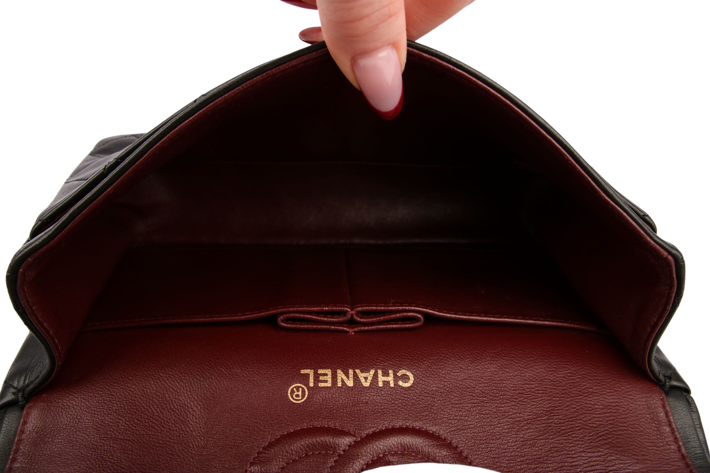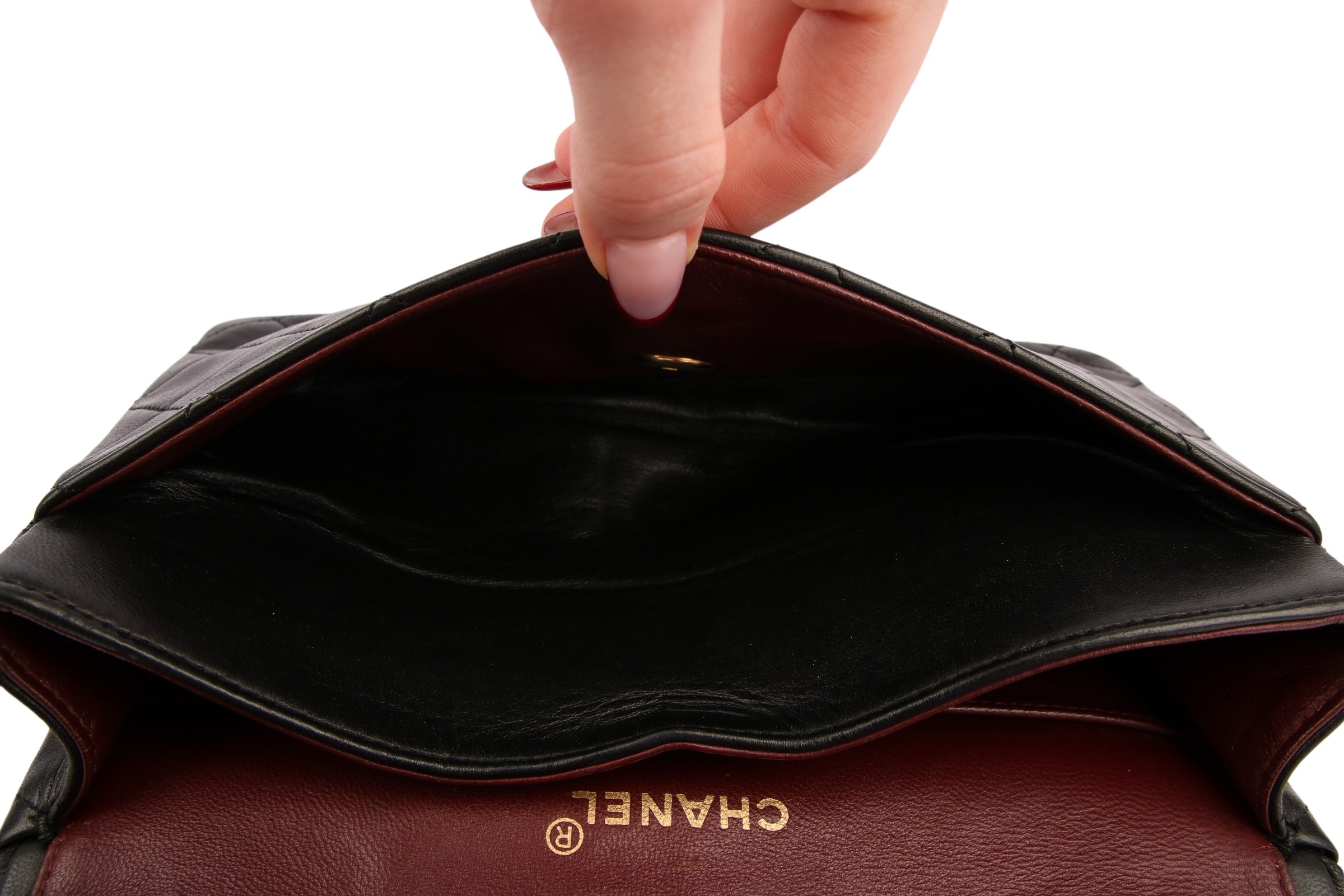 Die Idee dieser Tasche entstand Coco Chanel in den 20er Jahren, die Umsetzung erfolgte jedoch erst 1955. Das klassische Design der rechteckigen Grundform und der kleinen halbmondförmigen Einschubtasche auf der Rückseite - 'Mona Lisas Lächeln' auch genannt, existiert damals so wie heute. Das Rautenmuster durch Steppnähte sowieso die Kettenelemente haben sich im Laufe der Jahre zu einem unwiederruflichen Erkennungsmerkmal Chanels entwickelt und wirken auf den Träger sofort elegant und luxuriös. Eine Ikone in Taschenformat. Das Grunddesign der Tasche von 1955 wurde in schwarz und braun gehalten, mit dem klassischen 'CC'- Schloss und dem dunkelroten Innenleder...ein klassiker mit Geschichte, eine Tasche welche seit mehr als 50 Jahren die Herzen der Fashionistas höher schlägen lässt.