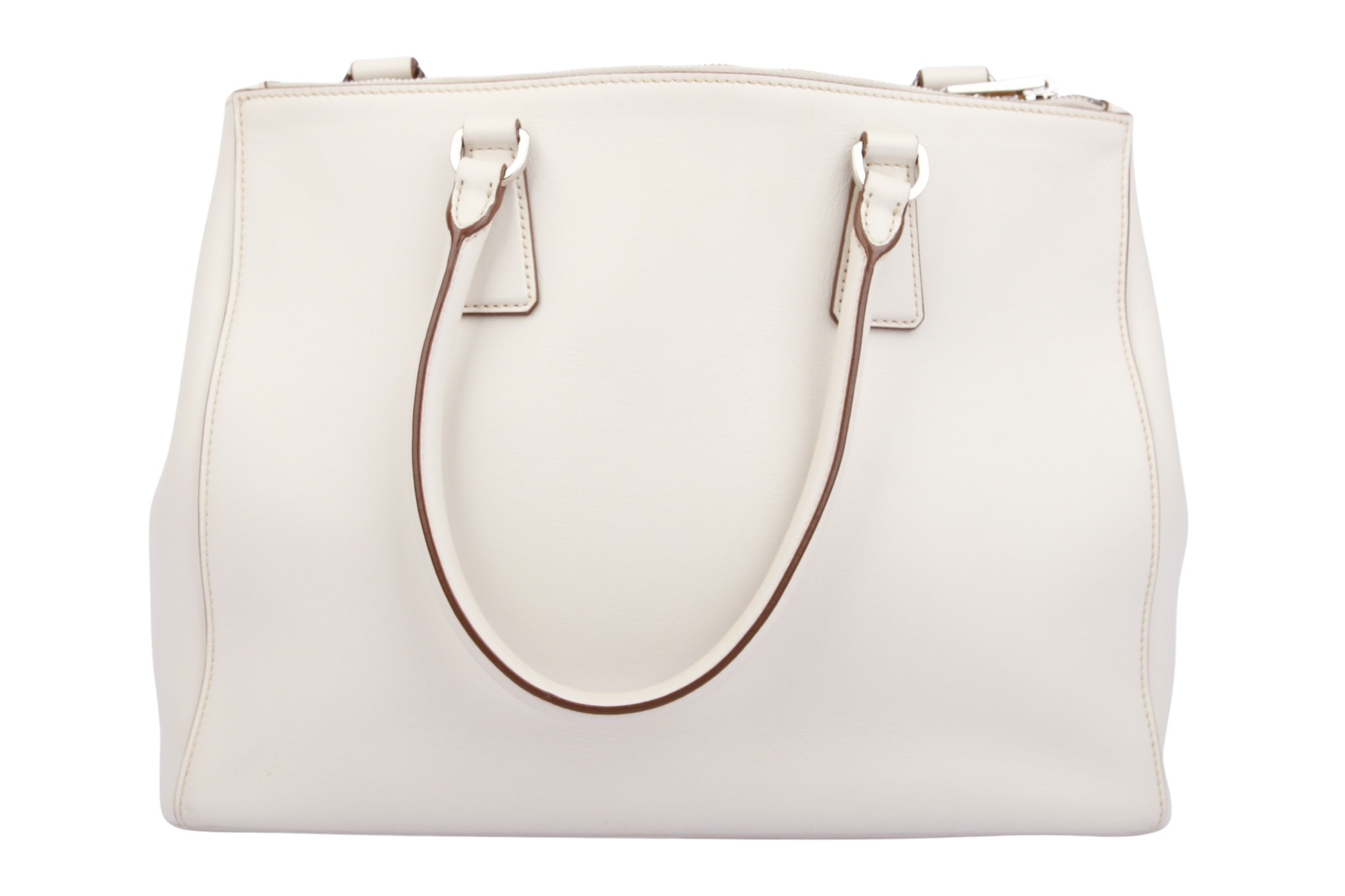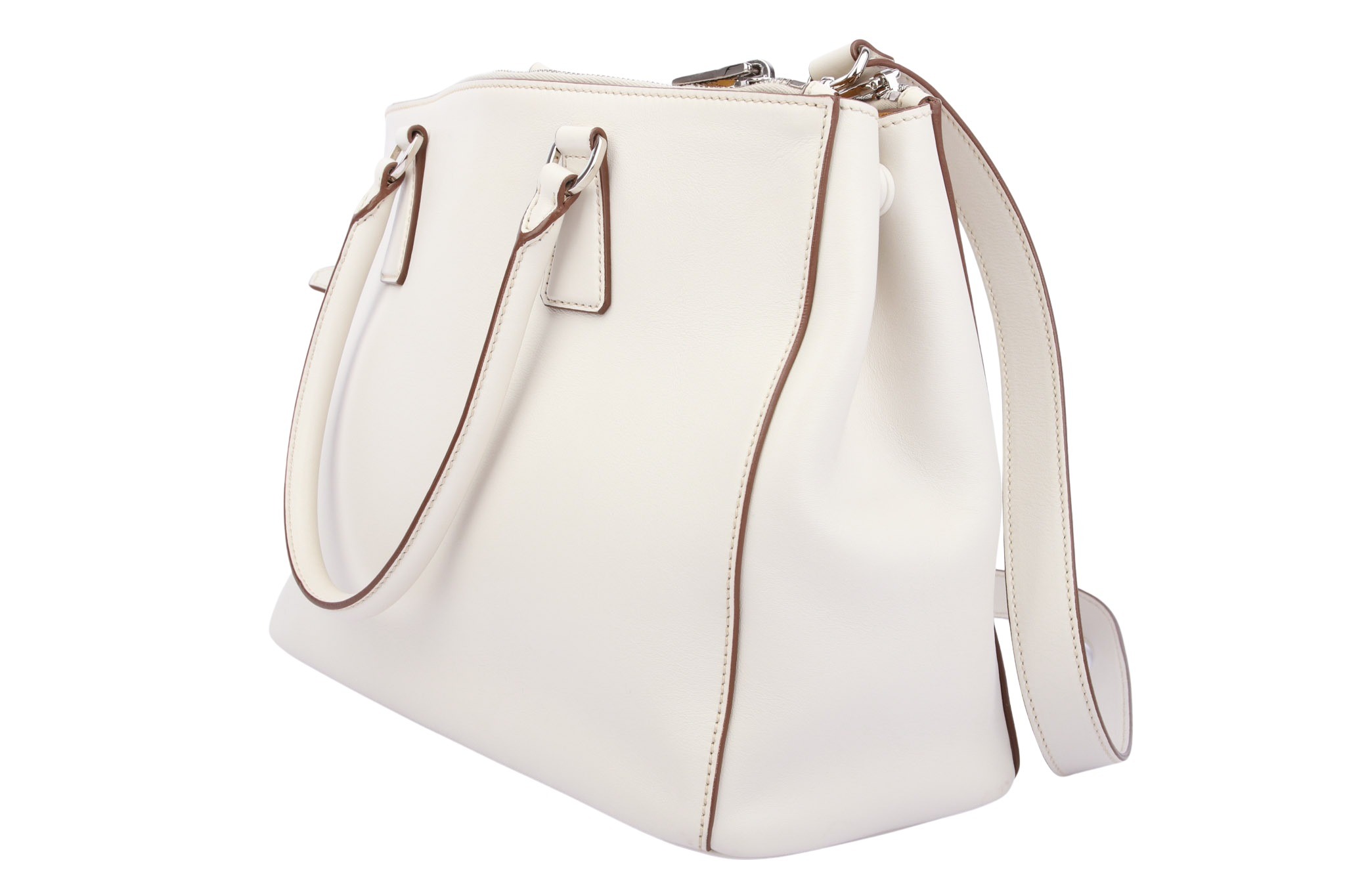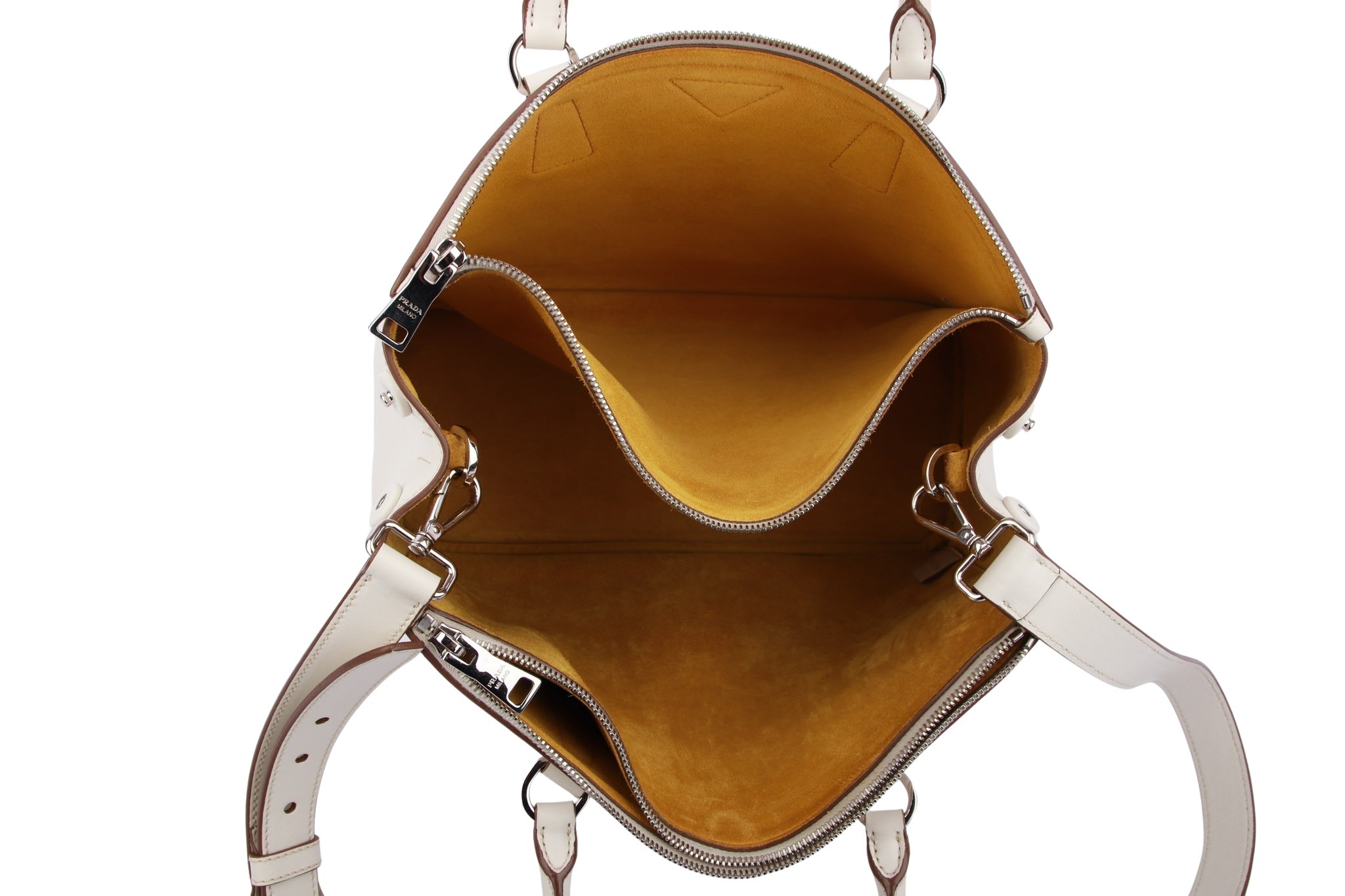 Die Prada Galleria Medium in Weiß ist eine elegante Handtasche mit klassischer, strukturierter Form. Sie besteht aus glattem, hochwertigem Leder und überzeugt durch ihre klare Linienführung und das ikonische Prada-Dreieckslogo auf der Vorderseite. Zwei Henkel und ein abnehmbarer Schulterriemen ermöglichen vielseitiges Tragen. Ihr zeitloses Design und die edle weiße Farbe machen sie zu einem stilvollen Begleiter für Alltag und besondere Anlässe.