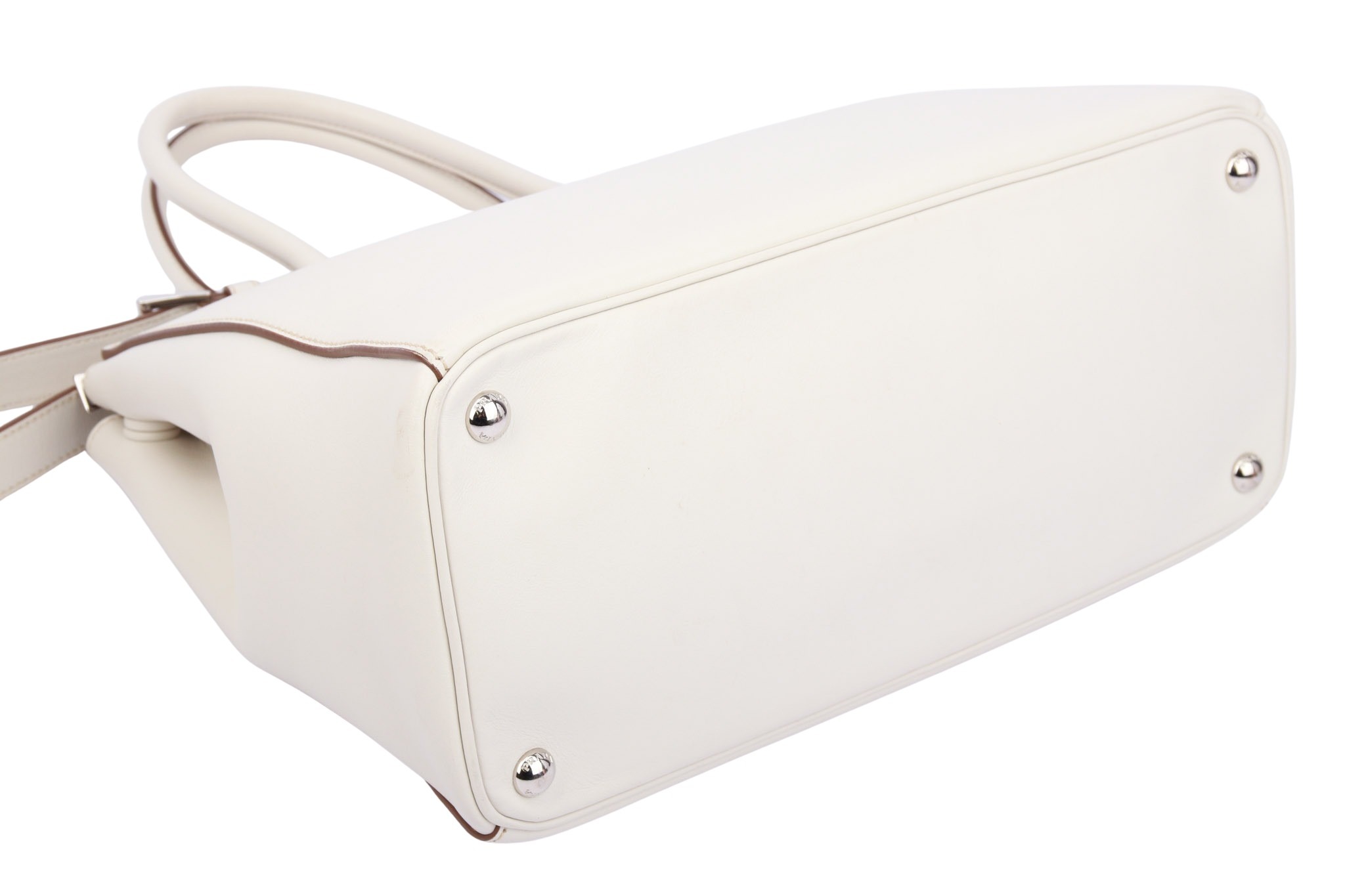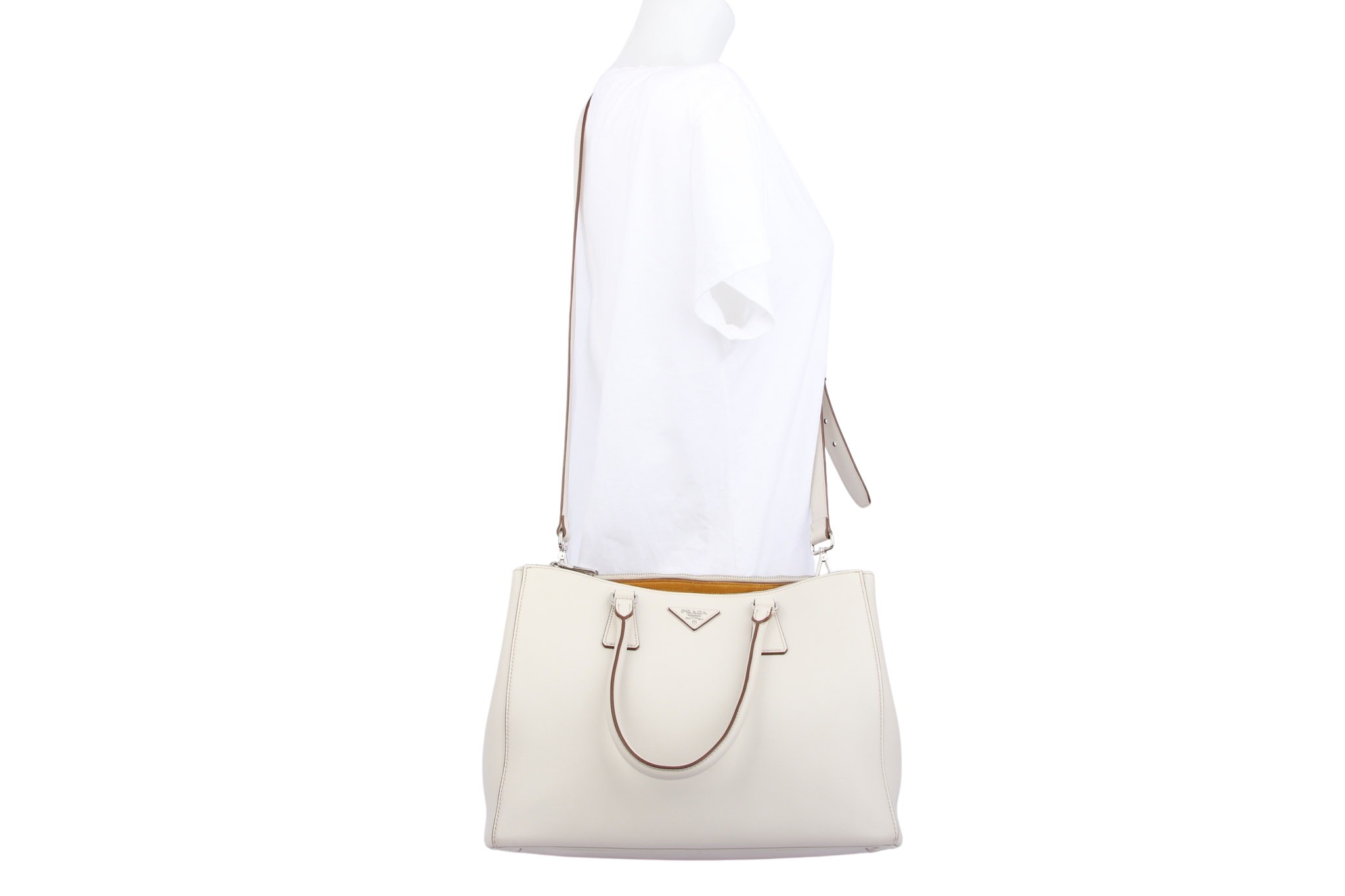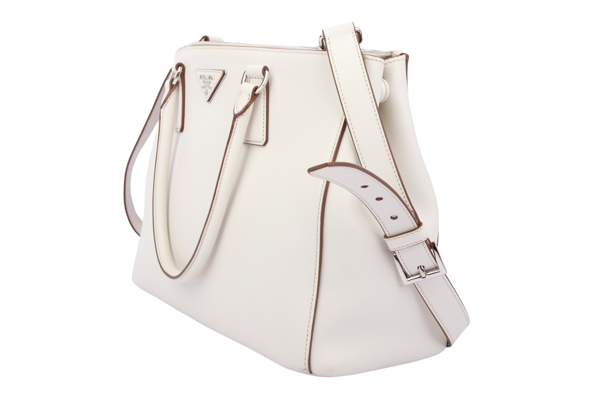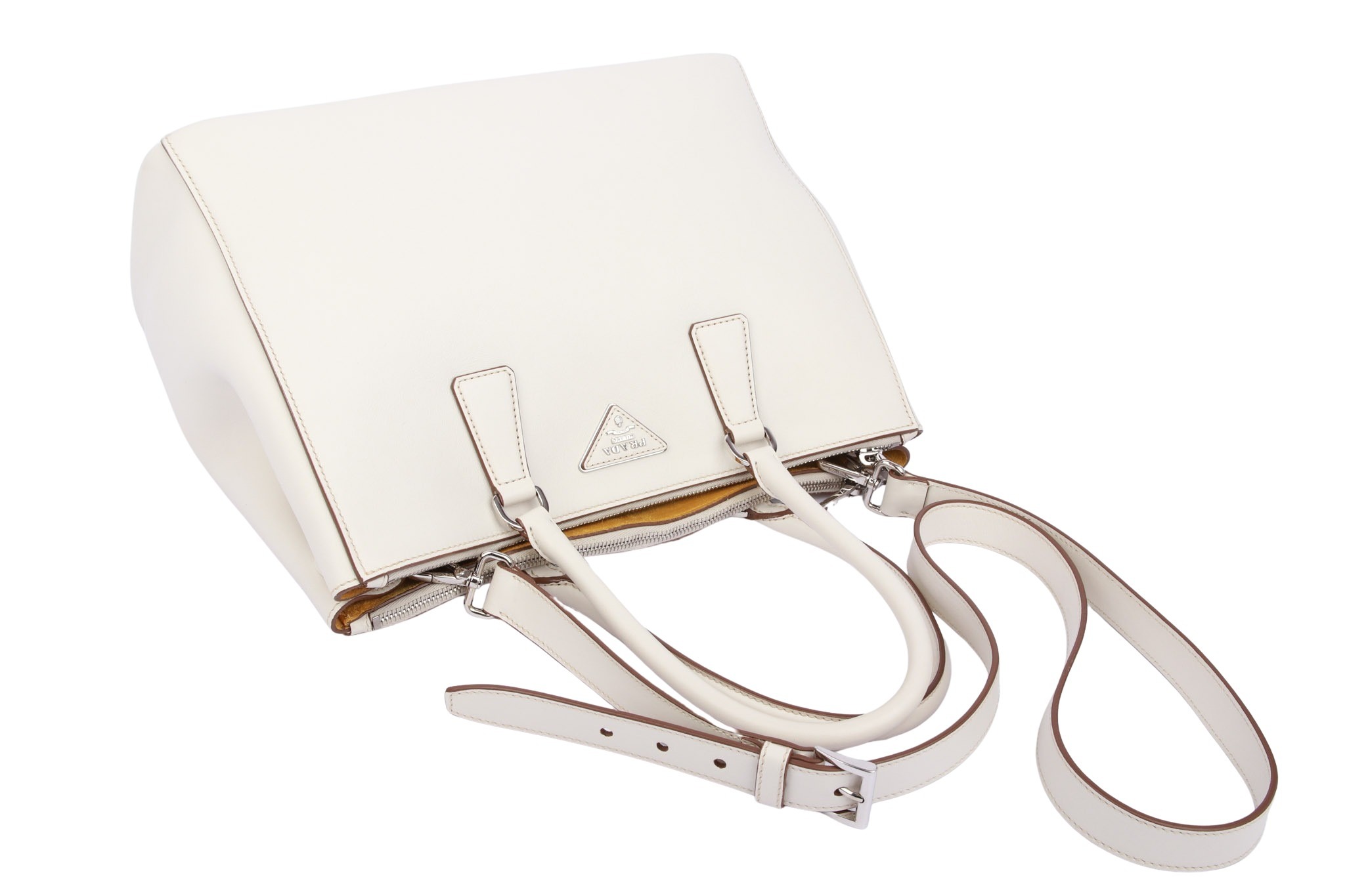 Die Prada Galleria Medium in Weiß ist eine elegante Handtasche mit klassischer, strukturierter Form. Sie besteht aus glattem, hochwertigem Leder und überzeugt durch ihre klare Linienführung und das ikonische Prada-Dreieckslogo auf der Vorderseite. Zwei Henkel und ein abnehmbarer Schulterriemen ermöglichen vielseitiges Tragen. Ihr zeitloses Design und die edle weiße Farbe machen sie zu einem stilvollen Begleiter für Alltag und besondere Anlässe.