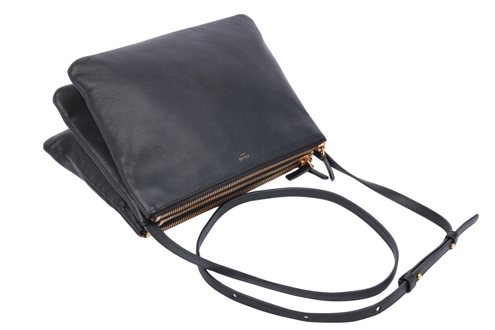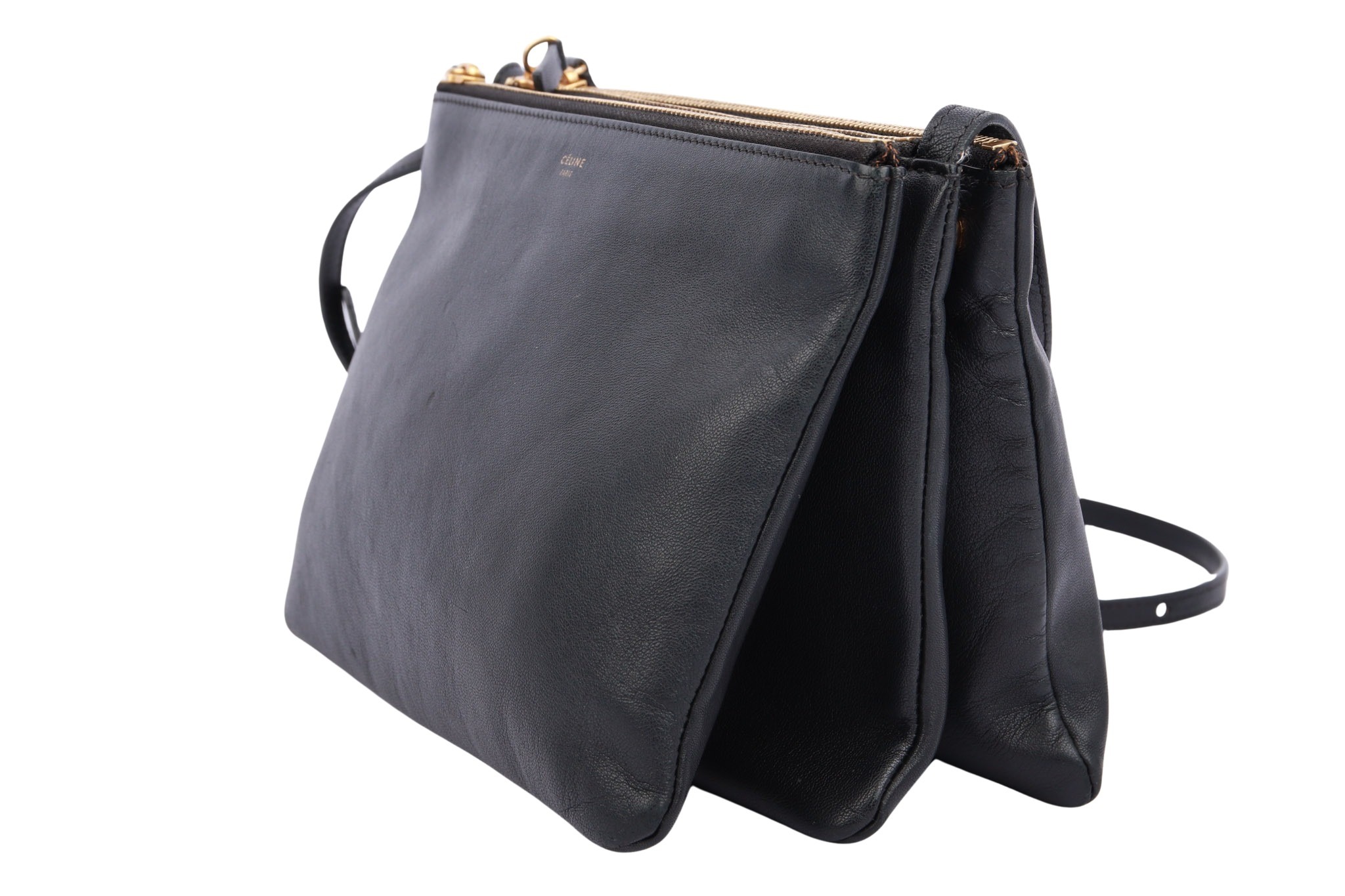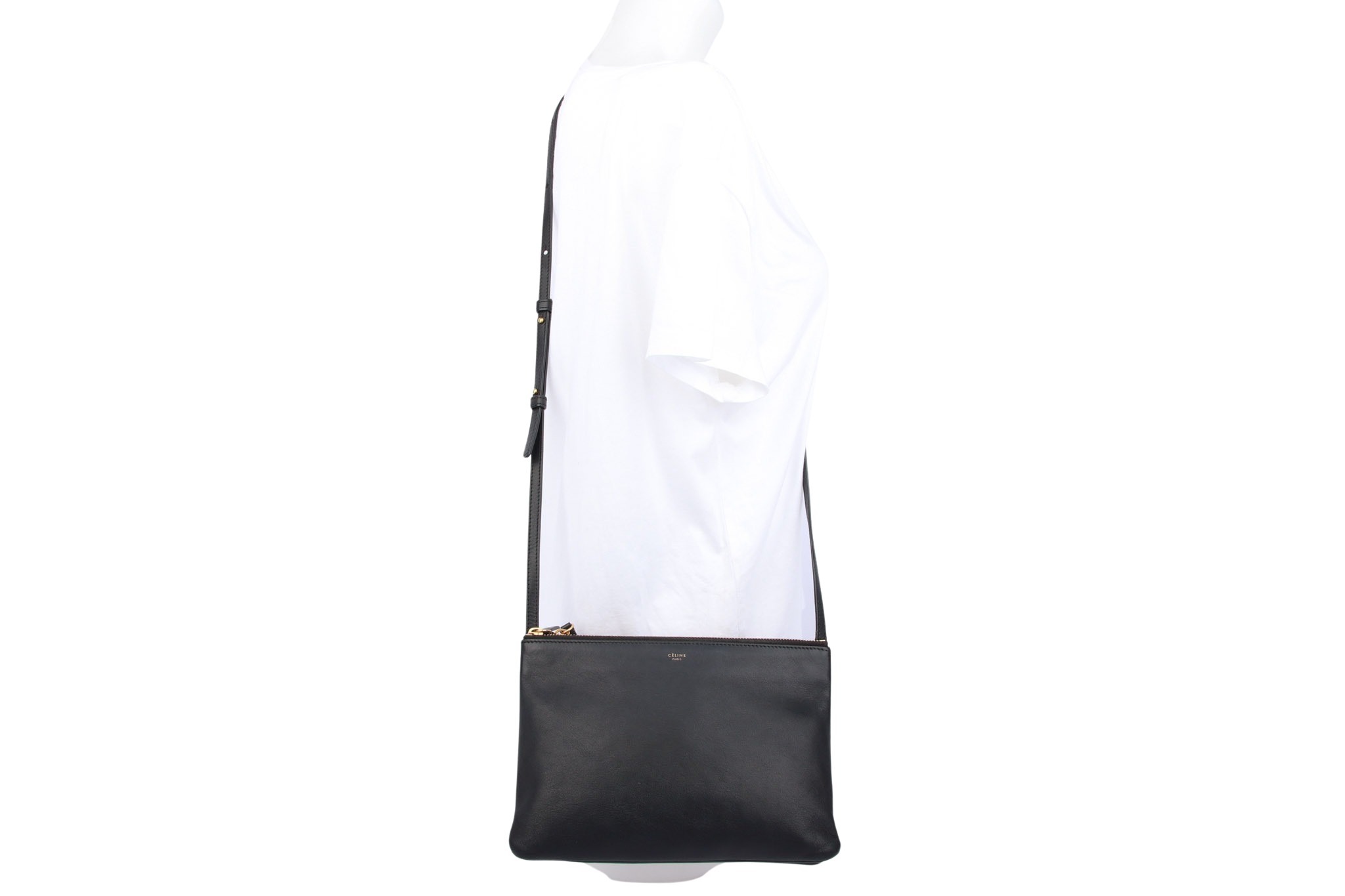 Die Céline Trio Large verkörpert schlichte Eleganz und zeitlose Raffinesse. Hergestellt aus hochwertigem Leder strahlt sie eine unaufdringliche Schönheit aus. Ihre minimalistische Silhouette wird durch die sauberen Linien und das diskrete Céline-Logo auf der Vorderseite betont. Mit ihren drei separaten Taschen bietet sie eine praktische und dennoch stilvolle Möglichkeit, Ihre persönlichen Gegenstände zu organisieren. Der verstellbare Riemen ermöglicht es Ihnen, die Tasche bequem über der Schulter oder Crossbody zu tragen. Die Céline Trio Large ist eine zeitlose Ergänzung für jede Garderobe und verleiht jedem Outfit eine subtile Eleganz.