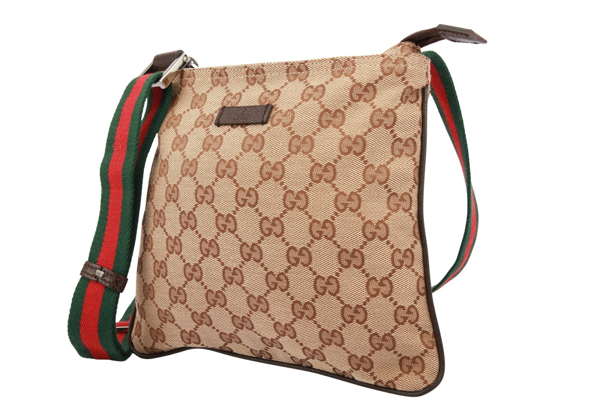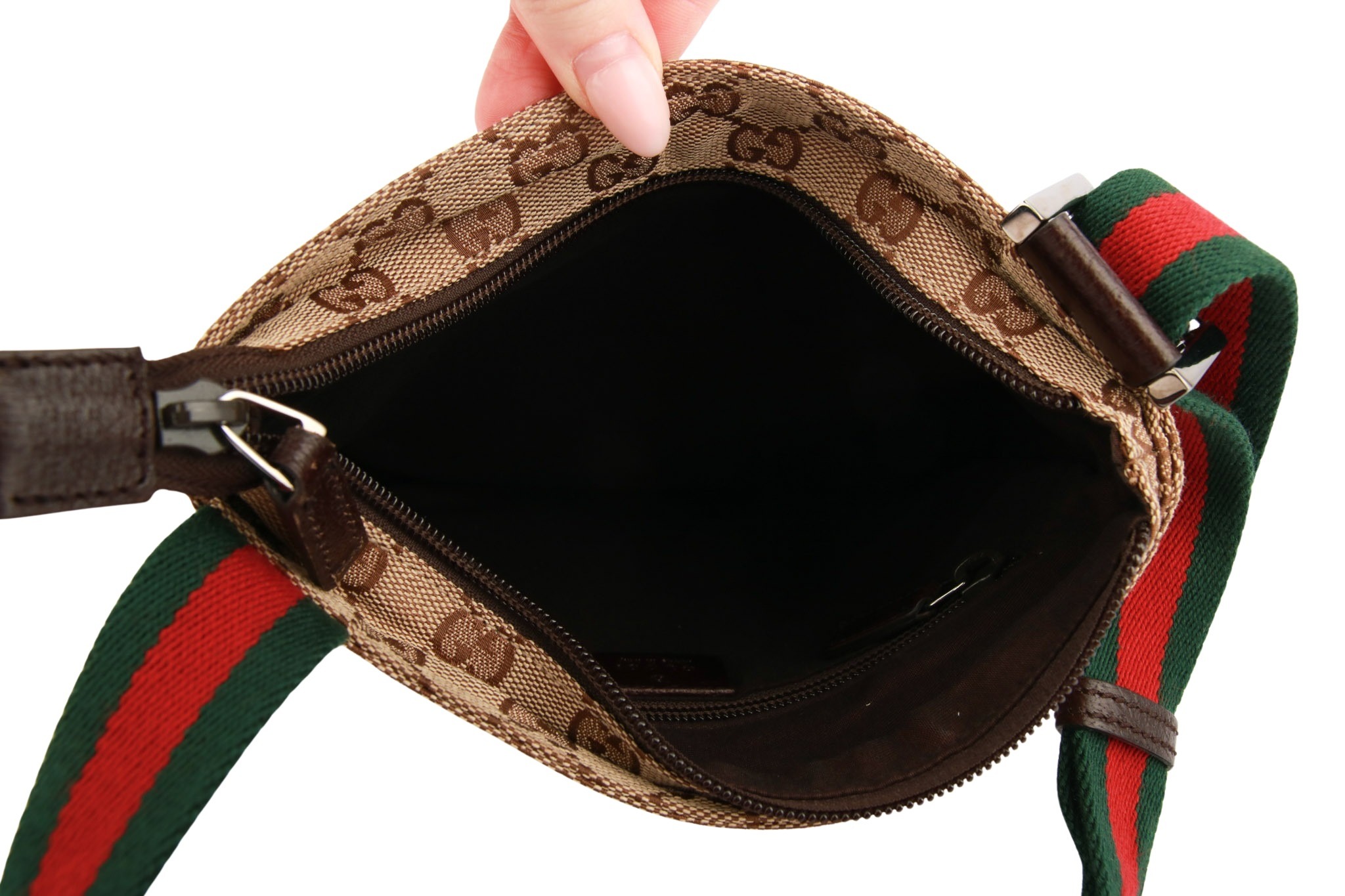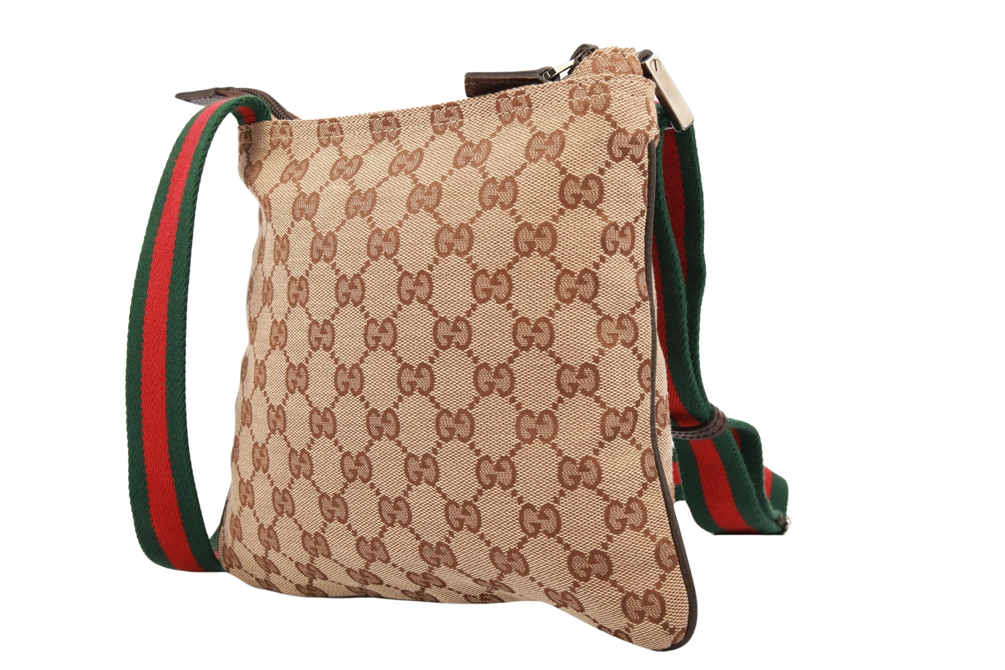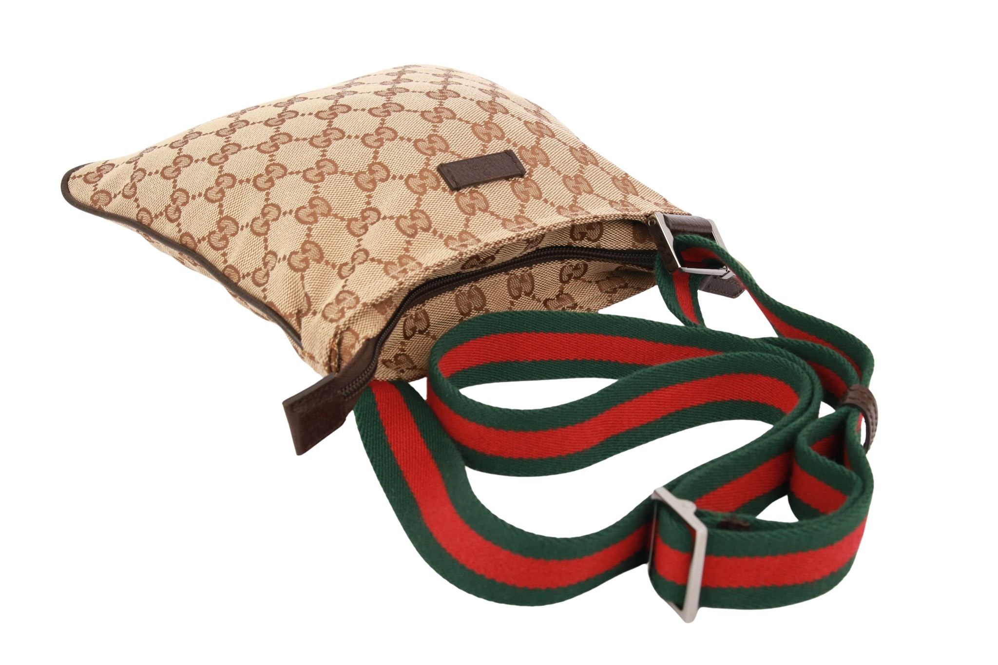 Gucci Monogramm Messenger Bag aus beigem GG Canvas mit dem ikonischen grün-rotem Schulterriemen. Ein Klassiker für unterwegs.
