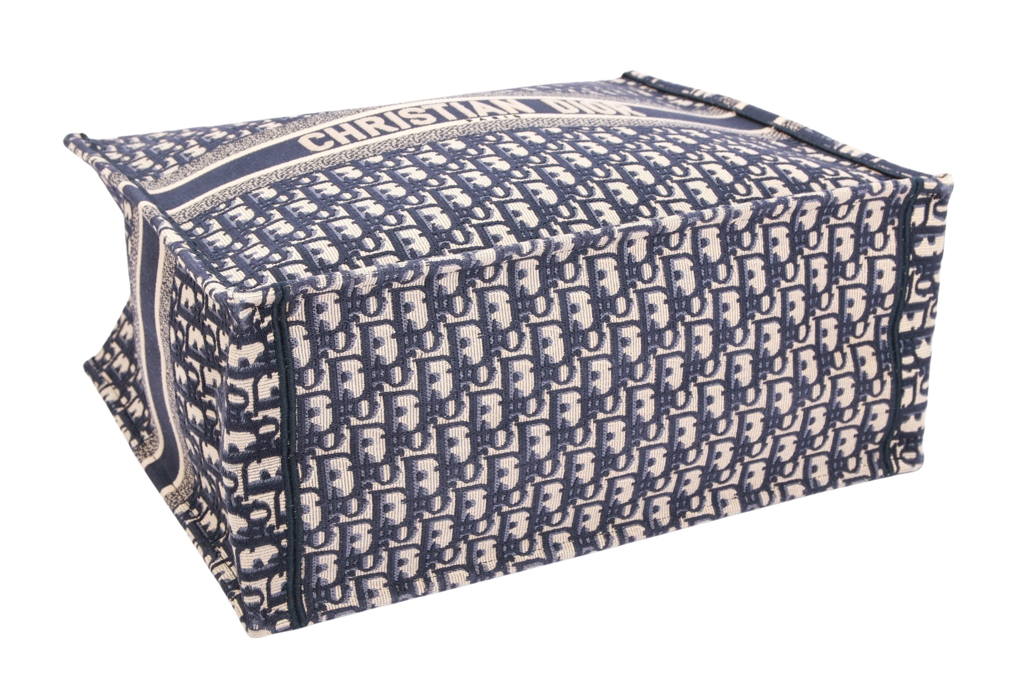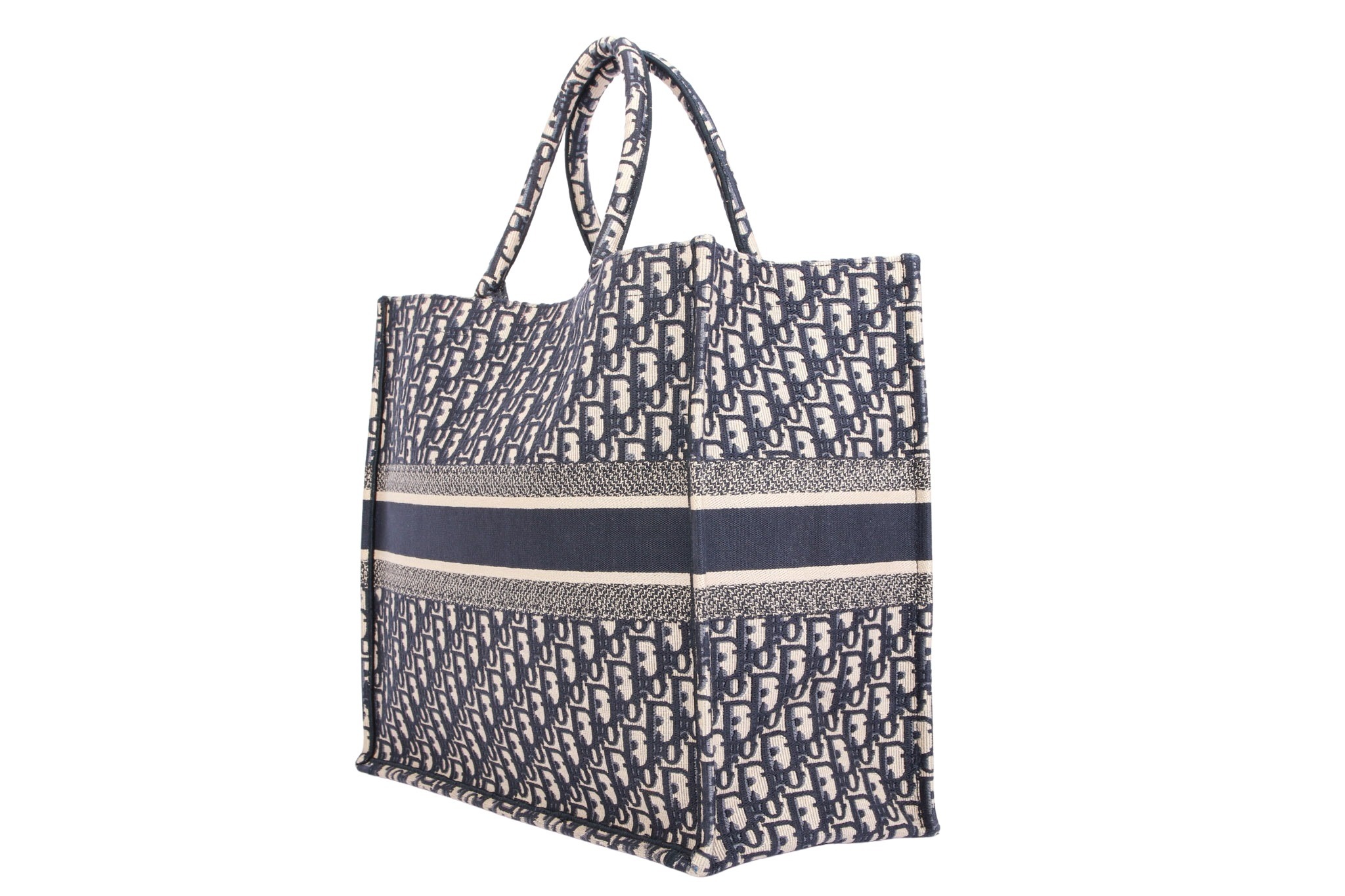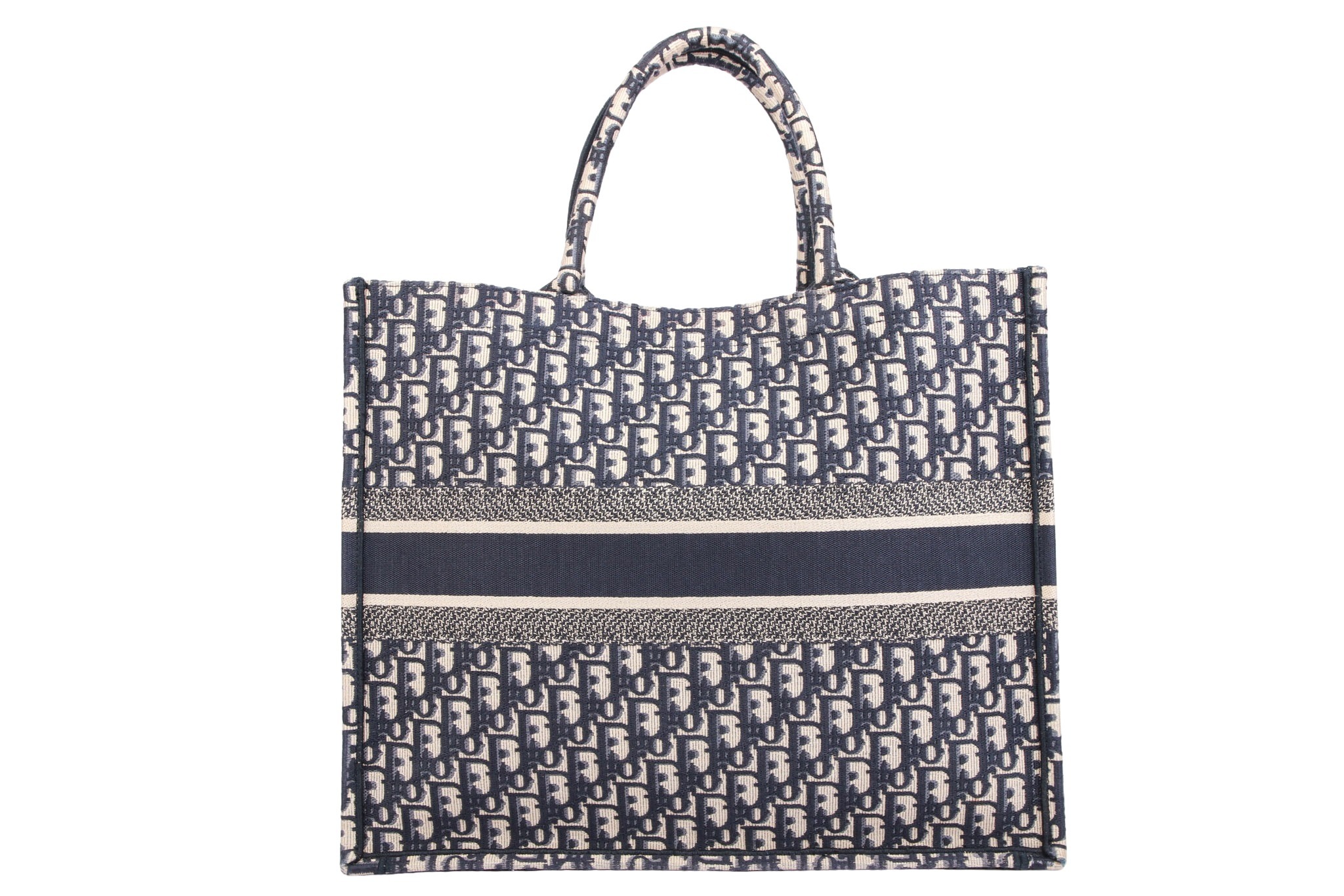 Die Dior Book Tote mit dem ikonischen Oblique-Muster in Blau ist eine der bekanntesten Taschen der Maison Dior. Gefertigt aus hochwertigem, besticktem Canvas zeigt sie das charakteristische Dior-Oblique-Jacquard in eleganten Blau- und Weißtönen. Mit ihren großzügigen Maßen bietet die Tasche ausreichend Platz für alltägliche Essentials wie Laptop, Unterlagen oder auch kleinere Einkäufe. Die zwei stabilen Henkel ermöglichen ein bequemes Tragen in der Hand oder über dem Arm. Der schlichte, strukturierte Aufbau ohne äußere Hardware verleiht der Tasche einen modernen und zugleich zeitlosen Look. Ob für den Alltag, das Büro oder als stilvoller Begleiter auf Reisen, die Dior Book Tote Large in Blau ist ein modisches Statement mit hohem Wiedererkennungswert.