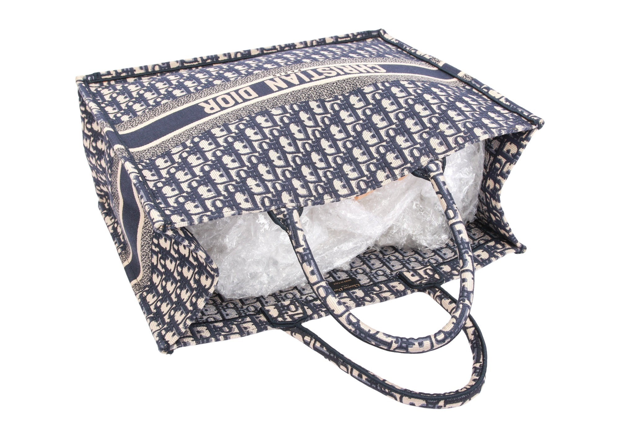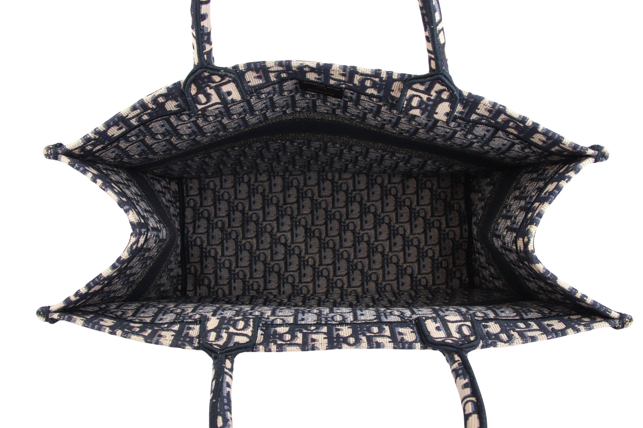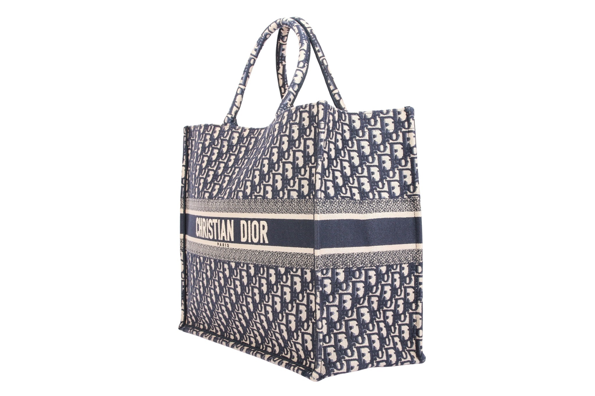 Die Dior Book Tote mit dem ikonischen Oblique-Muster in Blau ist eine der bekanntesten Taschen der Maison Dior. Gefertigt aus hochwertigem, besticktem Canvas zeigt sie das charakteristische Dior-Oblique-Jacquard in eleganten Blau- und Weißtönen. Mit ihren großzügigen Maßen bietet die Tasche ausreichend Platz für alltägliche Essentials wie Laptop, Unterlagen oder auch kleinere Einkäufe. Die zwei stabilen Henkel ermöglichen ein bequemes Tragen in der Hand oder über dem Arm. Der schlichte, strukturierte Aufbau ohne äußere Hardware verleiht der Tasche einen modernen und zugleich zeitlosen Look. Ob für den Alltag, das Büro oder als stilvoller Begleiter auf Reisen, die Dior Book Tote Large in Blau ist ein modisches Statement mit hohem Wiedererkennungswert.