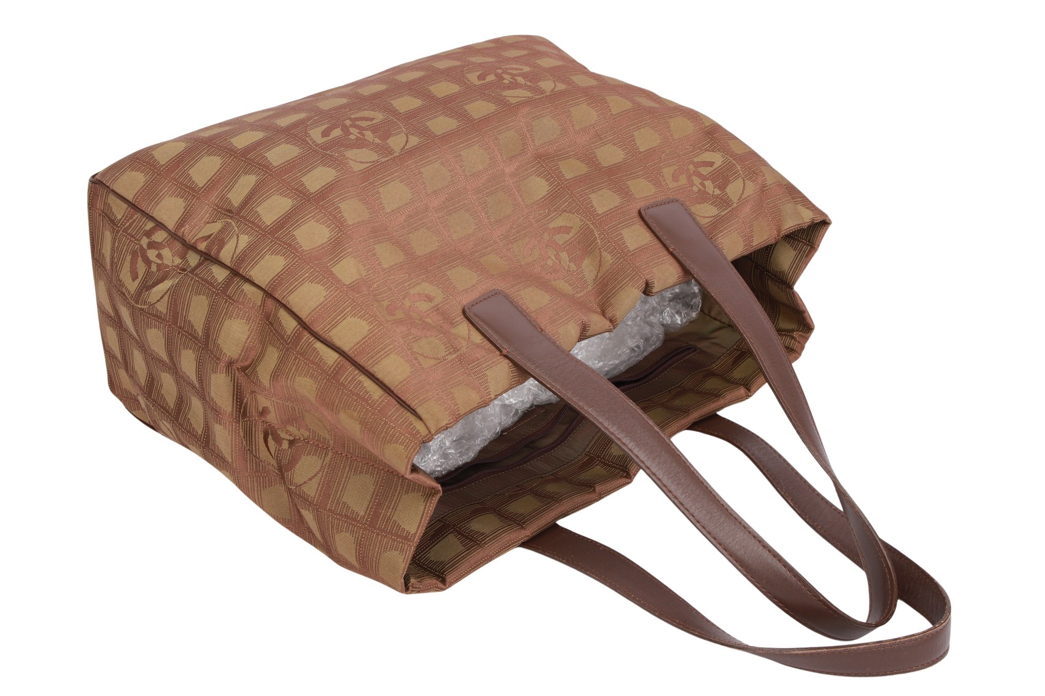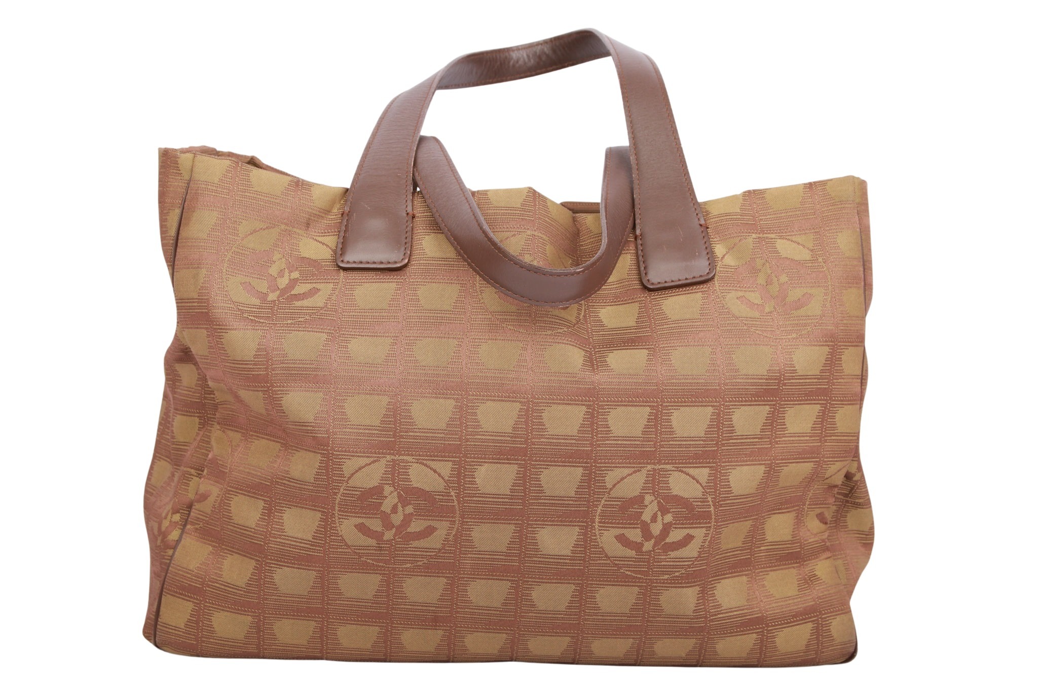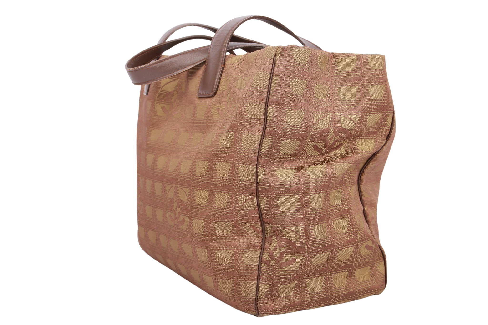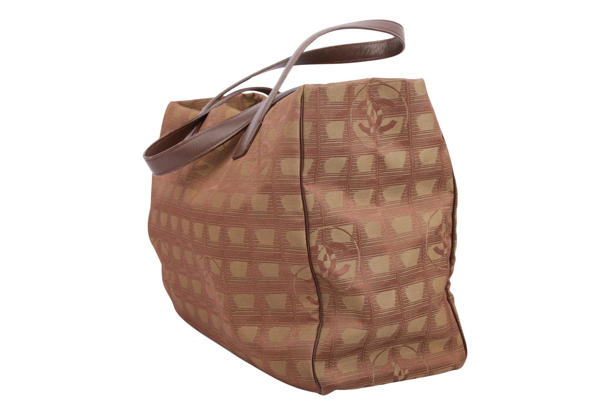 Der Chanel New Travel Line Shopper in Khaki ist eine geräumige und stilvolle Tasche aus strapazierfähigem Nylon mit dem charakteristischen Chanel-Logomuster. Sie verfügt über zwei bequeme Tragegriffe und ein großes Hauptfach mit zwei Innenfächern für optimale Organisation. Das ikonische CC-Logo runden das elegante Design ab, wodurch die Tasche sowohl praktisch als auch modisch ist.