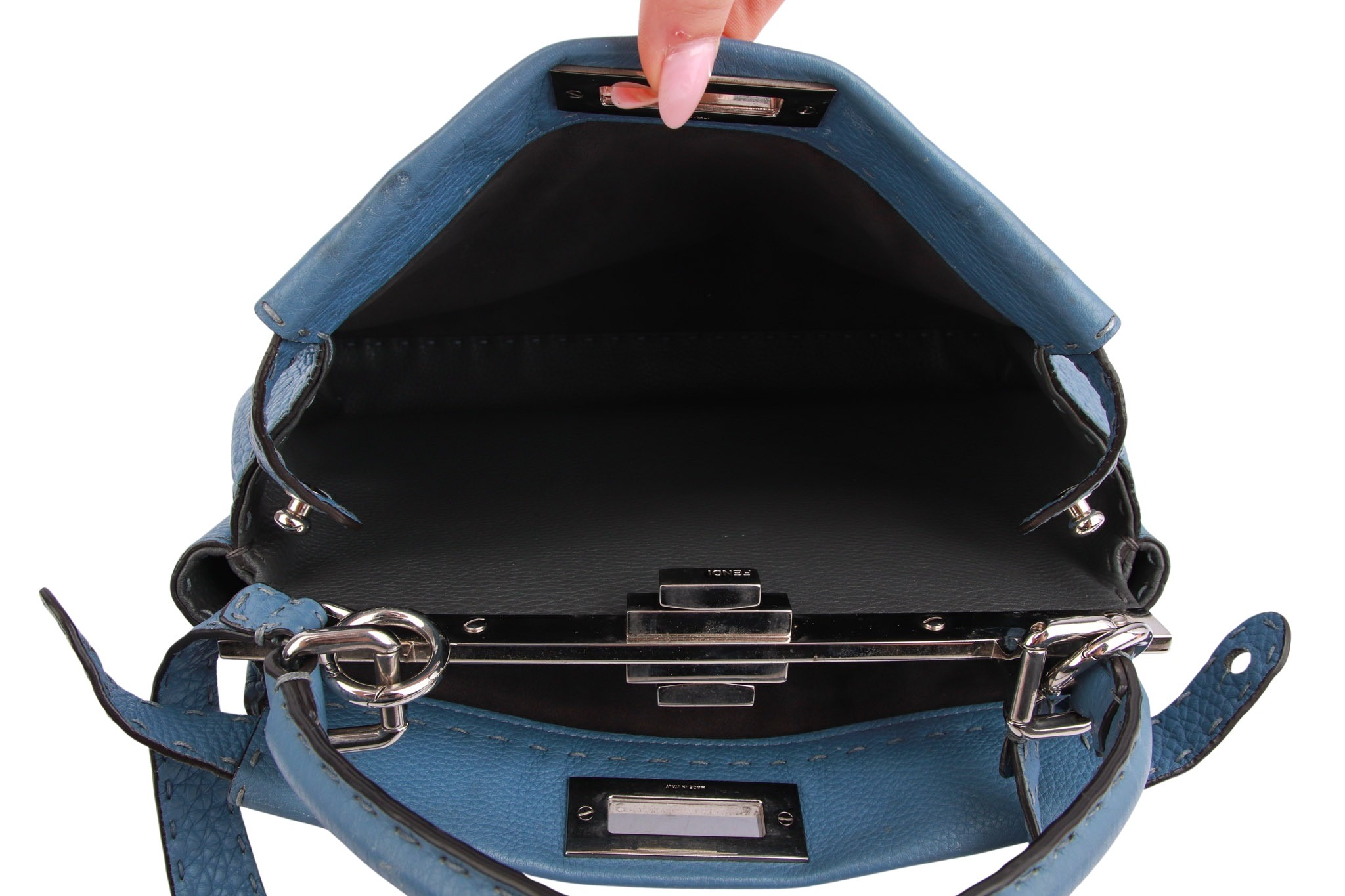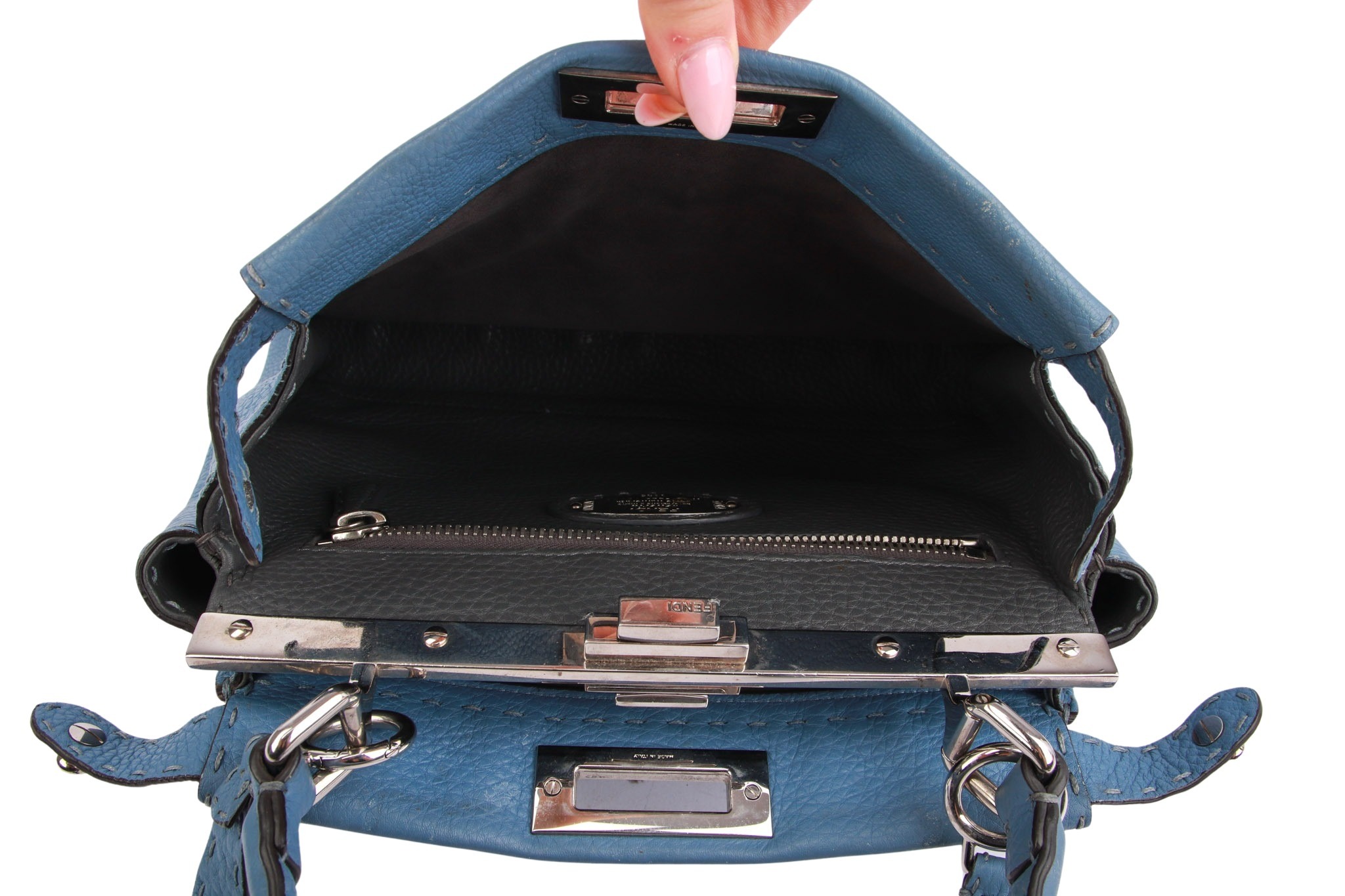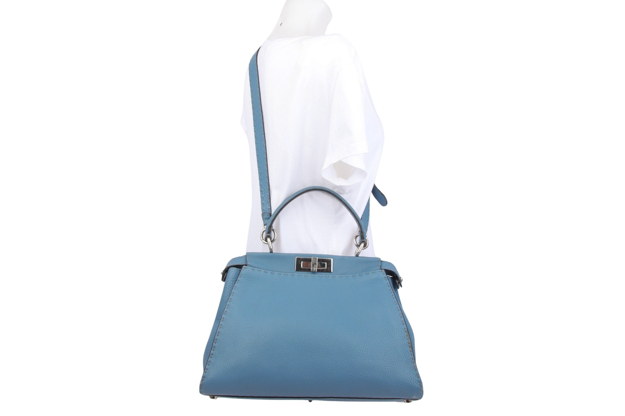 Fendi Peekaboo Medium Leder. Elegante, mittelgroße Handtasche aus Kalbsleder. Innen zwei Hauptfächer mit Trennwand und mindestens einem kleinen Fach für Essentials. Tragevarianten: Handgriff, Schulterriemen oder Crossbody. Typisches Peekaboo-Design mit Drehverschluss, hochwertige Hardware, schlicht, zeitlos und vielseitig für Alltag und Büro.