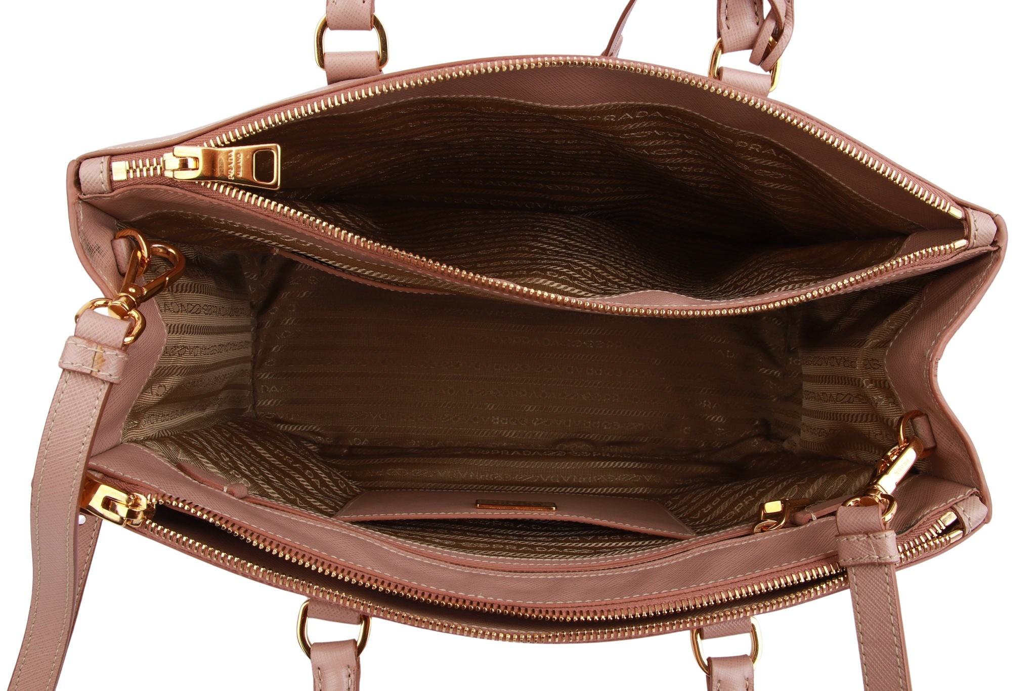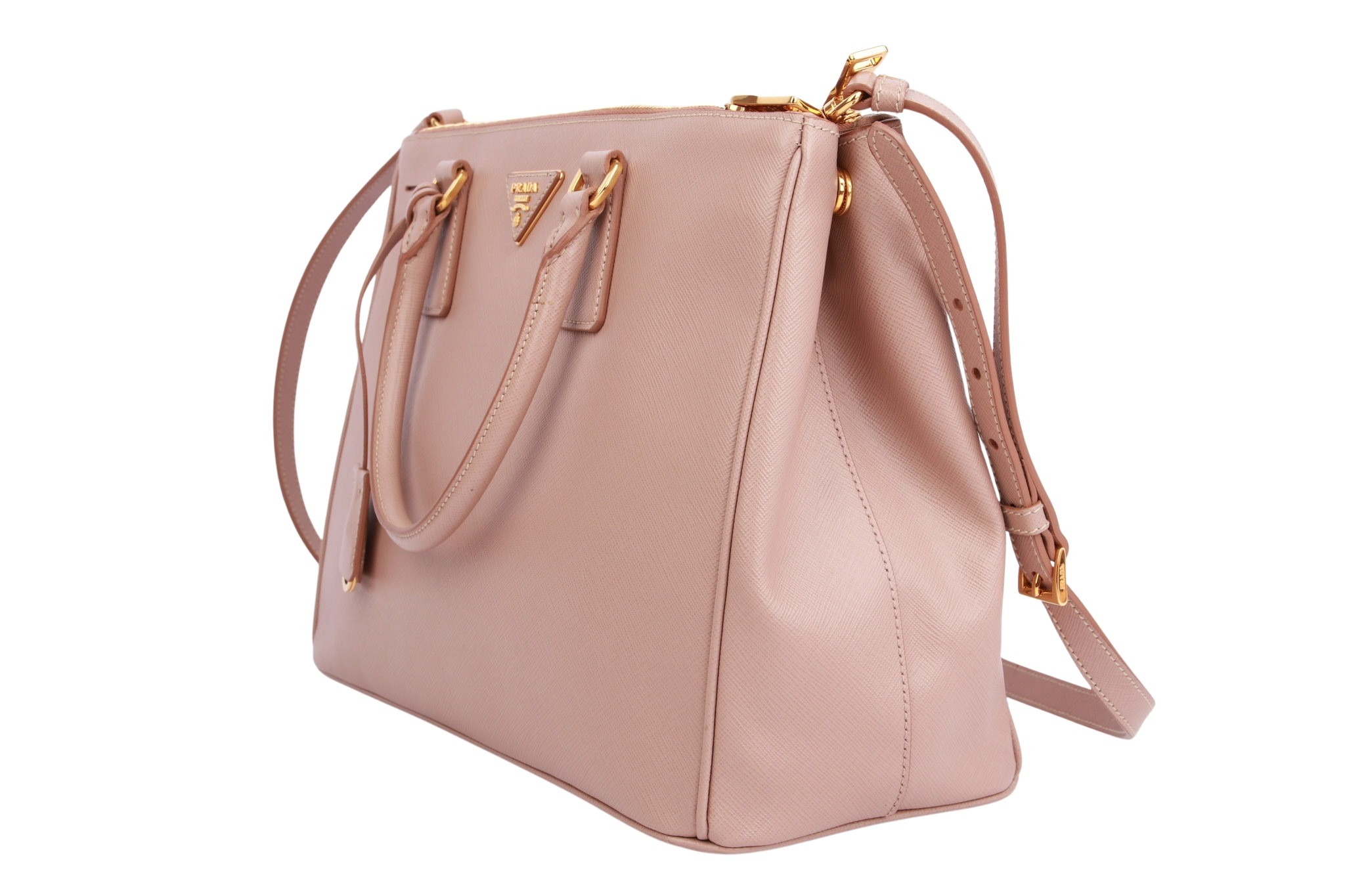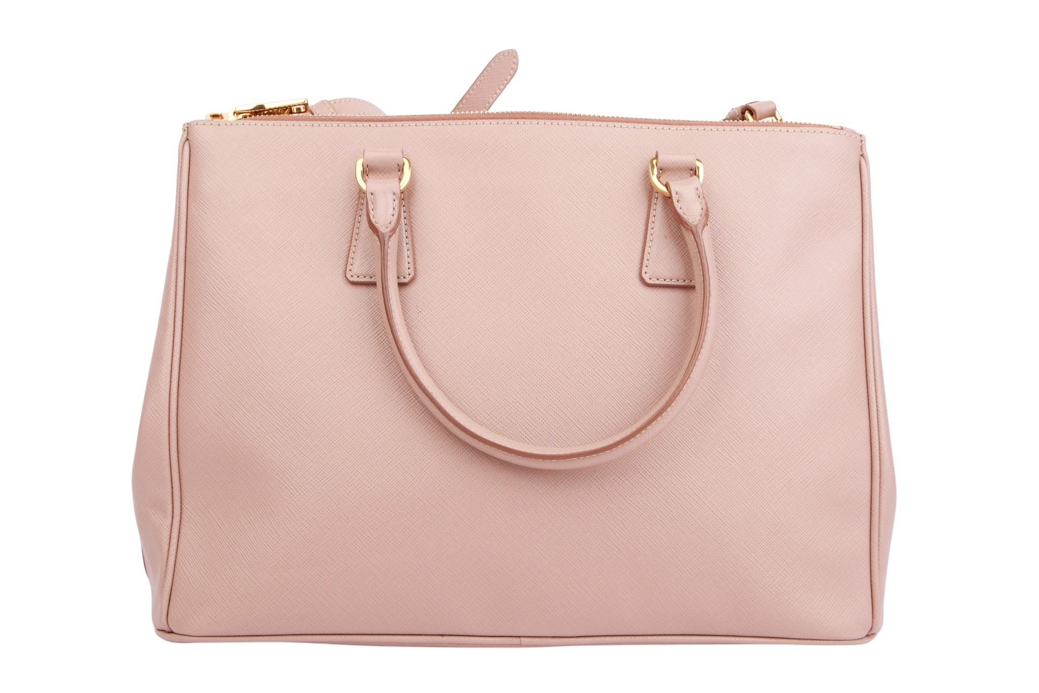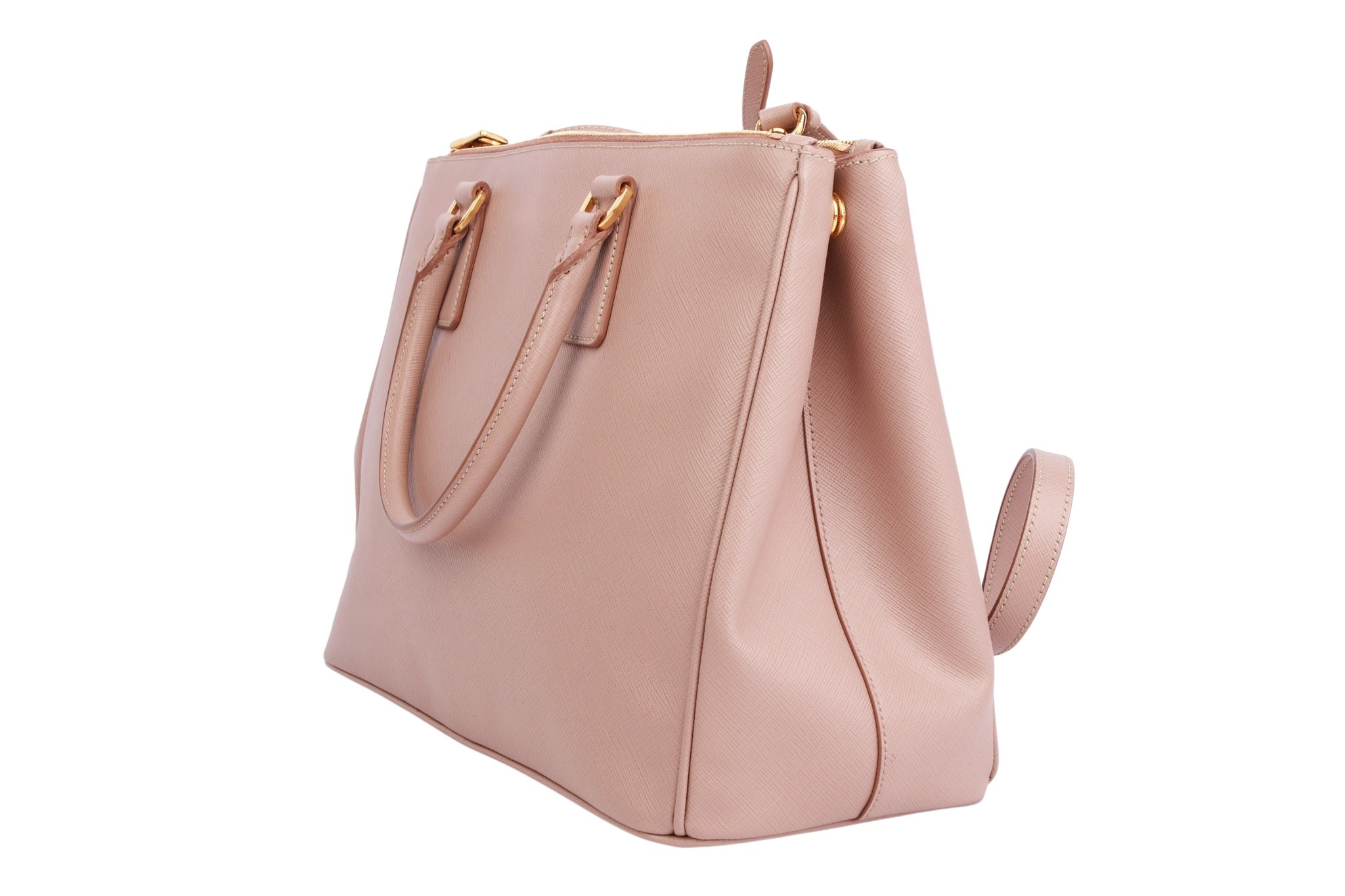 Die Prada Galleria Medium aus rosafarbenem Saffiano-Leder vereint zeitlose Eleganz mit praktischer Struktur: Das robuste, kreuzgehämmerte Saffiano-Leder wurde von Mario Prada patentiert und zeichnet sich durch hohe Kratz- und Wasserresistenz aus. Mit zwei Griffen oben sowie einem abnehm- und verstellbaren Schulterriemen lässt sich die Tasche sowohl in der Hand als auch über der Schulter tragen. Im Inneren bietet sie drei Hauptfächer – zwei mit Reißverschluss – sowie zusätzliche Innen- und Außenfächer für Organisation und Alltagstauglichkeit.  Abgerundet wird das Design durch das ikonische Metall-Dreiecksschild mit Prada-Logo auf der Vorderseite und goldfarbene Beschläge, die der Tasche eine luxuriöse Ausstrahlung verleihen.