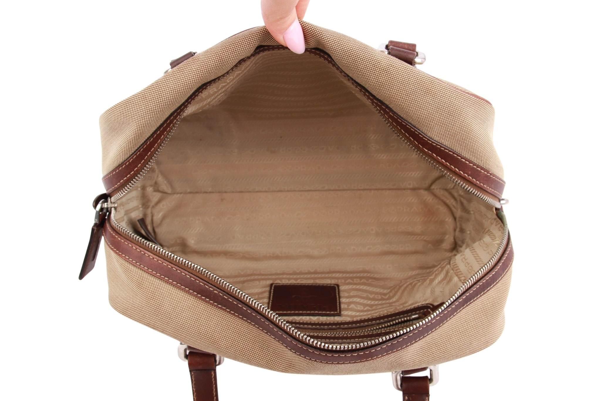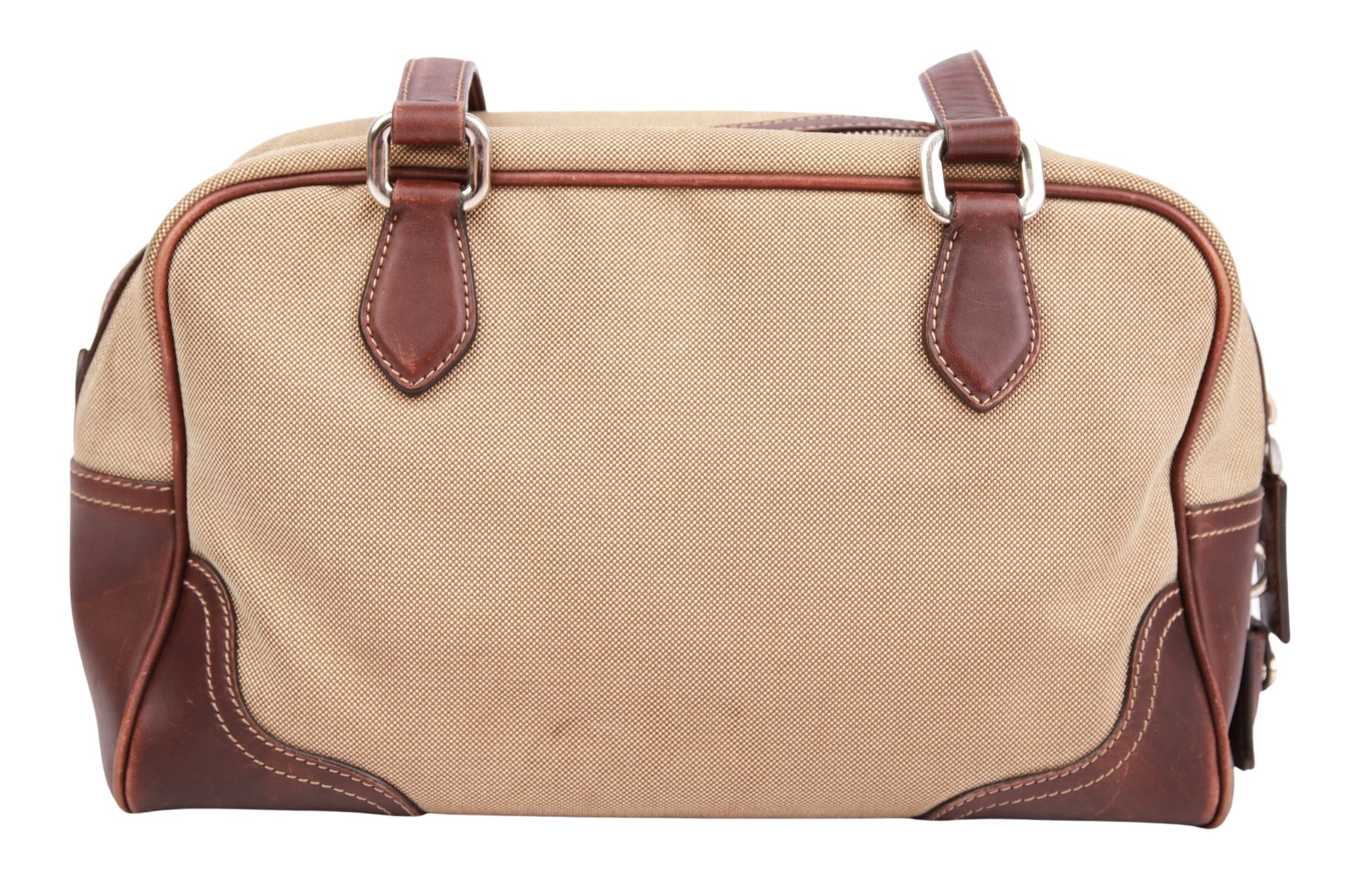 Der Prada Jacquard Bowling Bag in Beige und Braun vereint zeitlose Eleganz mit praktischer Alltagstauglichkeit. Der hochwertige Canvas in warmem Beigeton wird durch edle Lederdetails ergänzt, die dem Design Struktur, Langlebigkeit und einen klassischen Look verleihen. Das ikonische Prada-Logo setzt einen dezenten, aber prägnanten Akzent und unterstreicht die exklusive Ausstrahlung der Tasche.