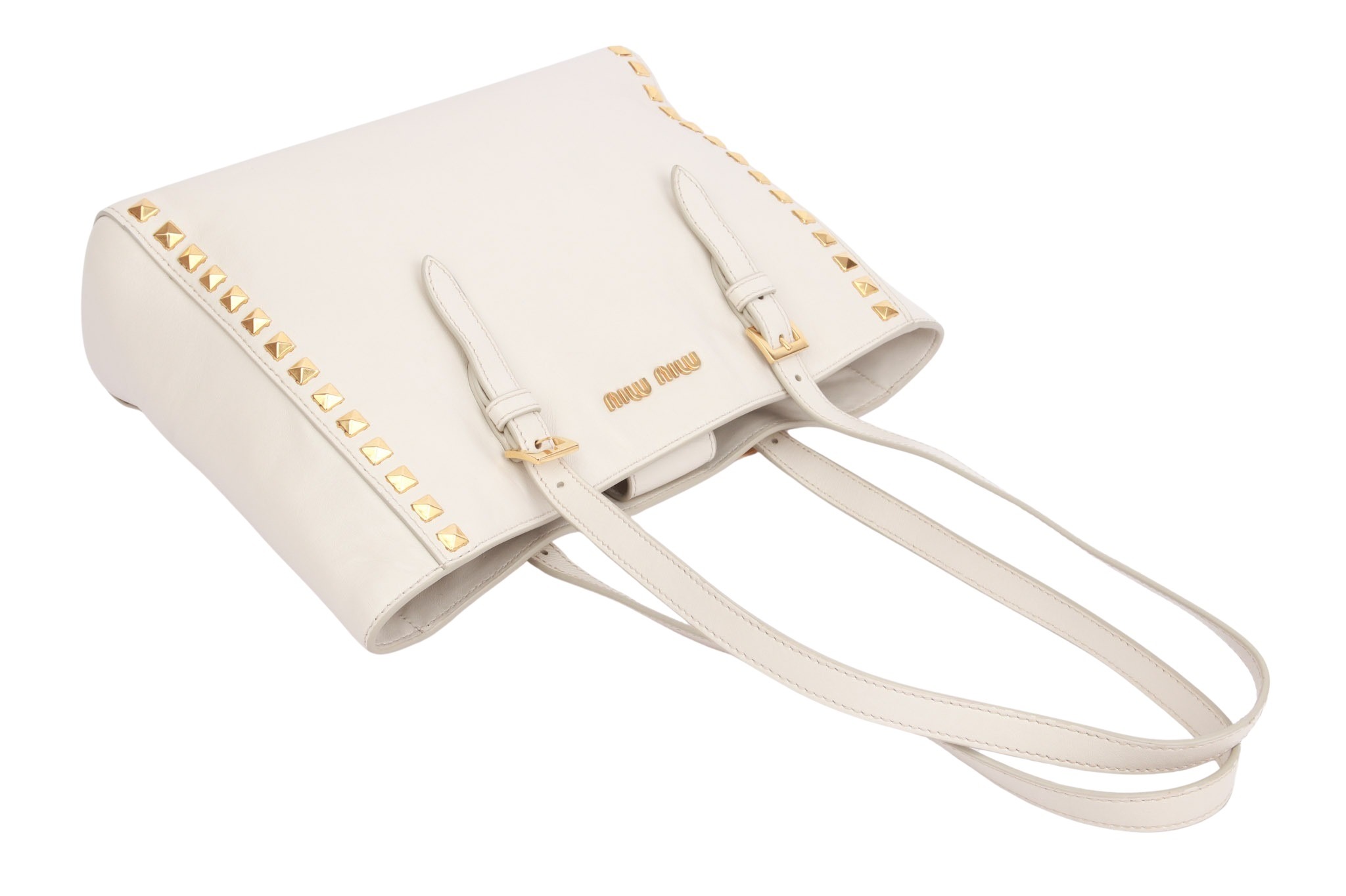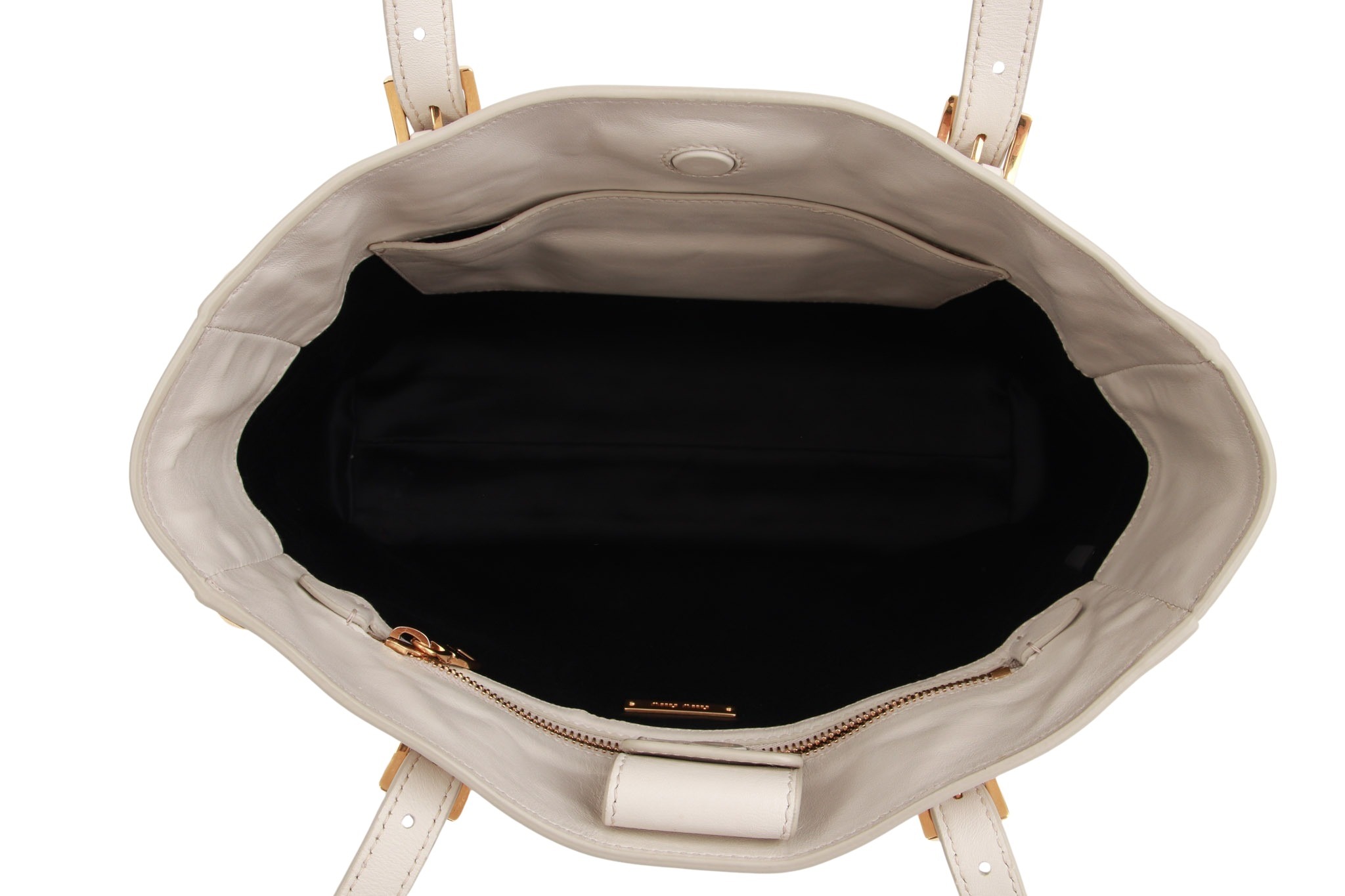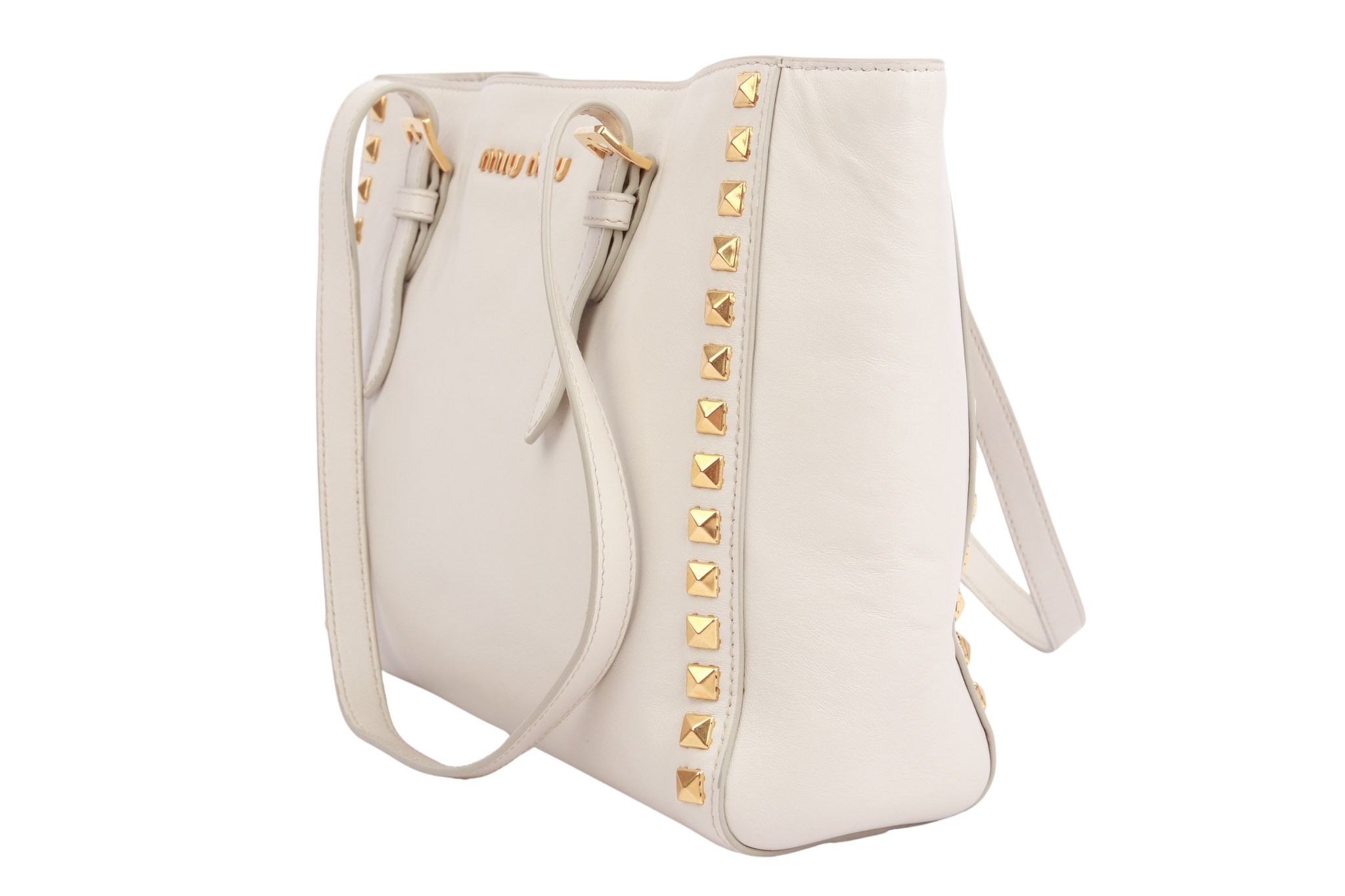 Sehr schöne Handtasche aus weißem Leder aus dem Hause Miu Miu mit goldfarbenen Metallelementen.
