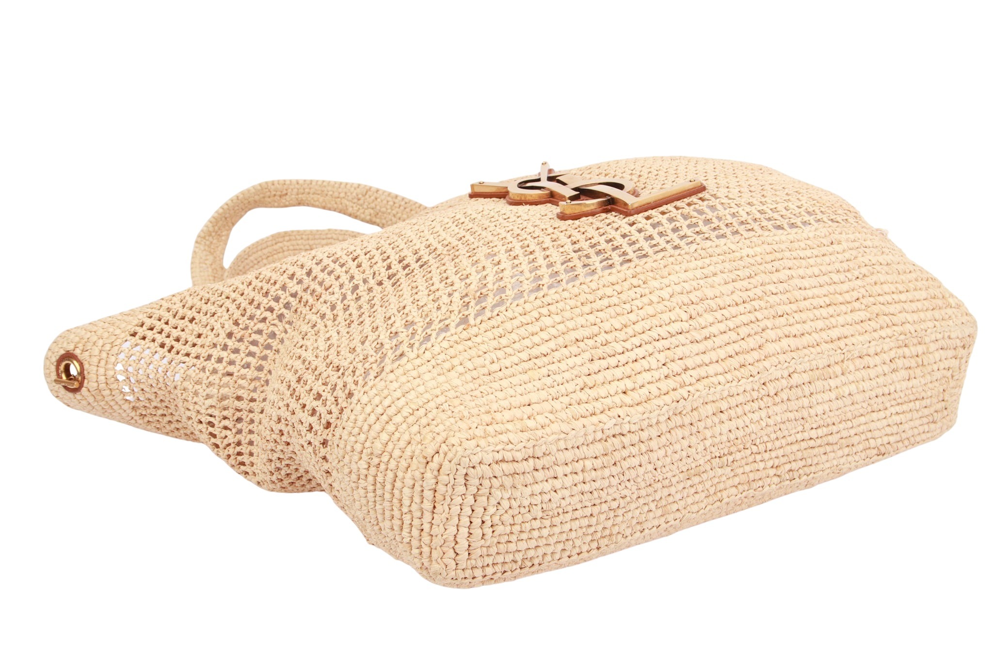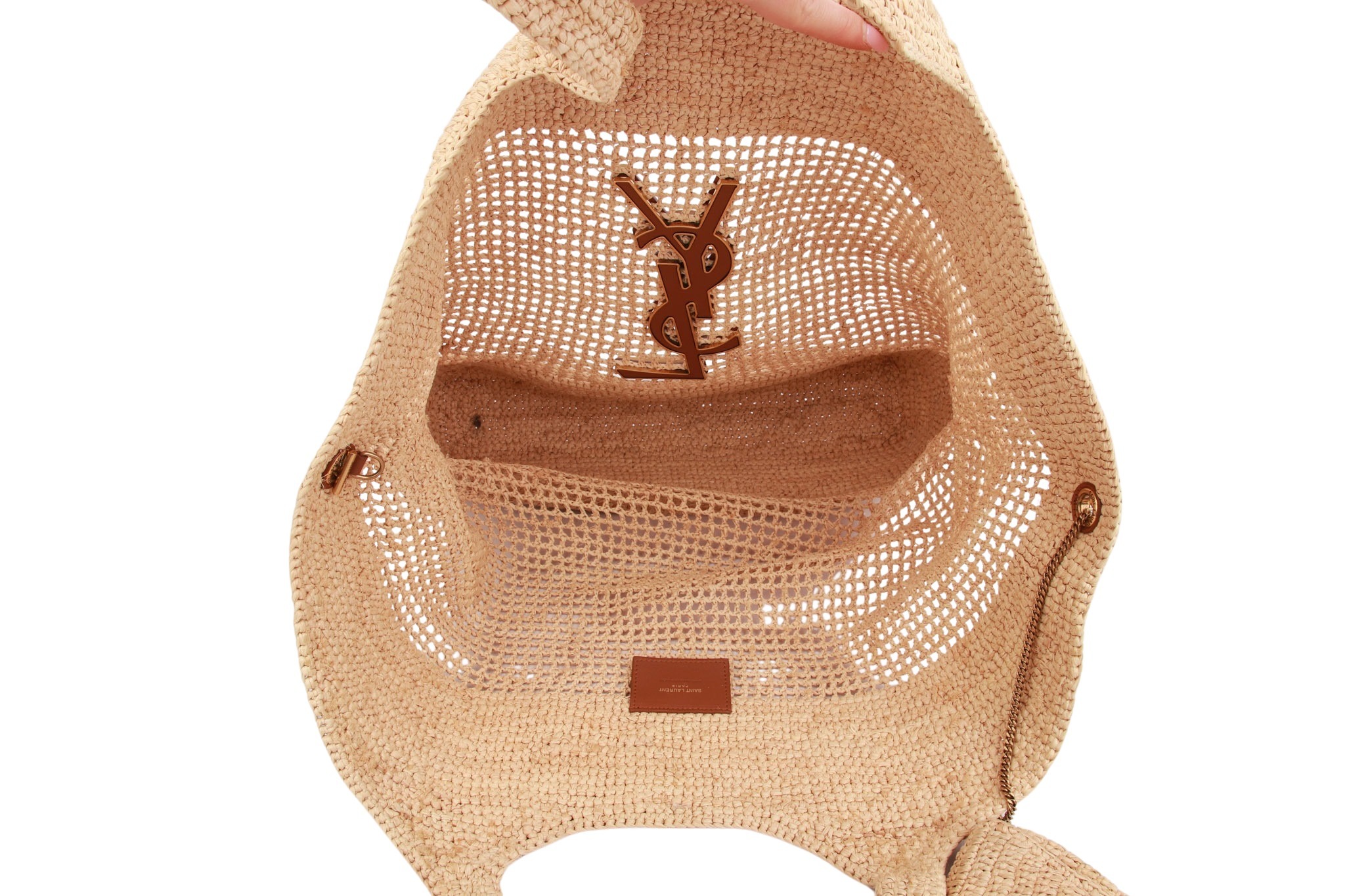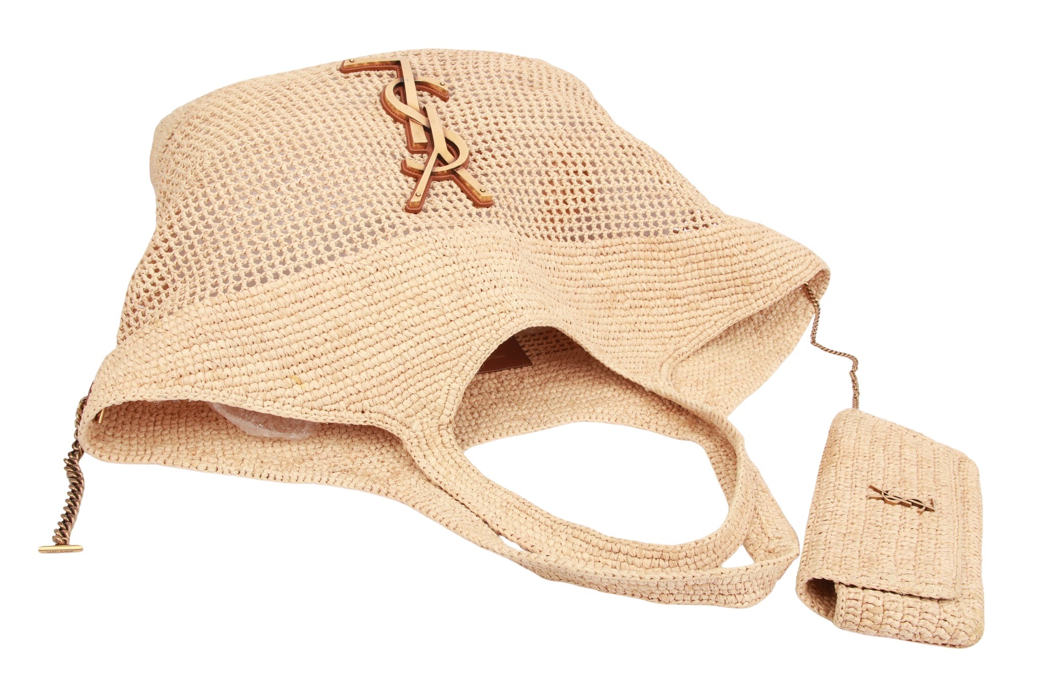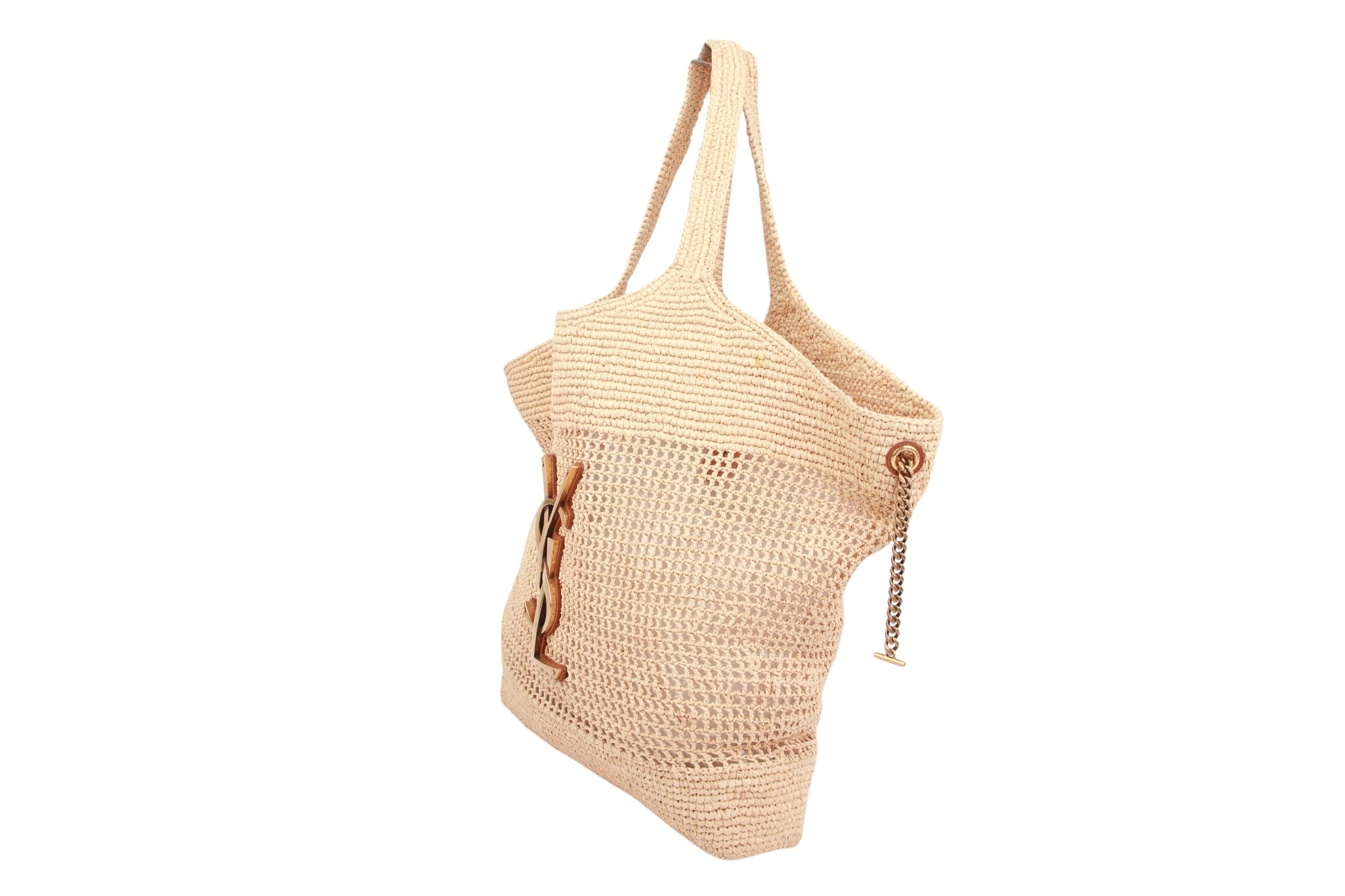 Maxi Shopper aus natürlichem gehäkelten Raffia aus Pflanzlich gegerbtem Leder in Vintage Optik, inclusive eines Brillenetuis aus dem gleichem Marterial. Mit übergrosser, handgearbeiteter Cassandre Verzierung. Mit den inneren Bändern könne die Seiten auf Wunsch vergrößert oder verkleinert werden. Ein toller Begleiter im Sommer für jede Frau.