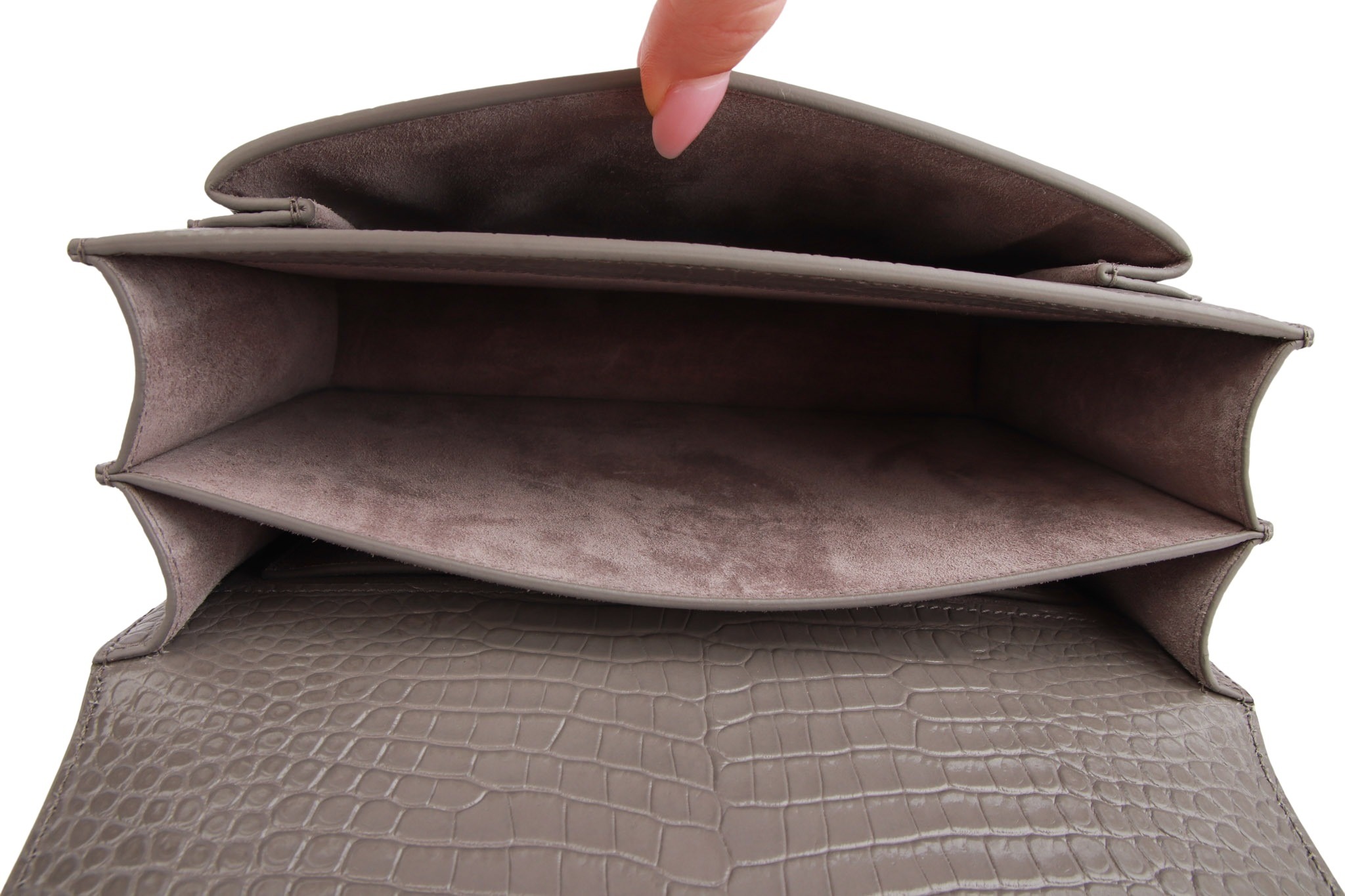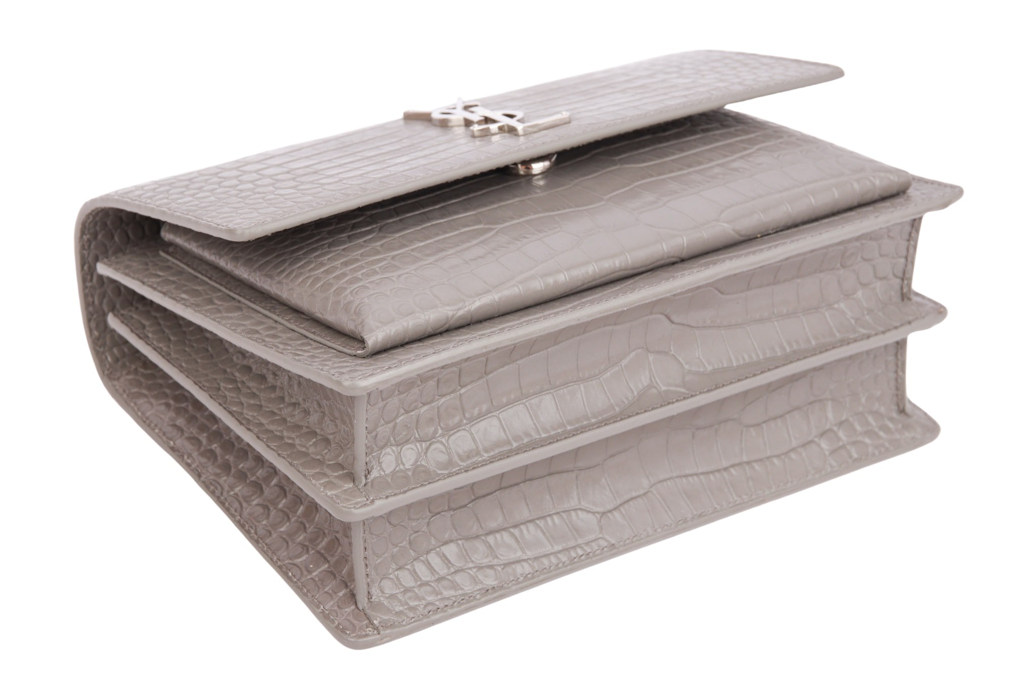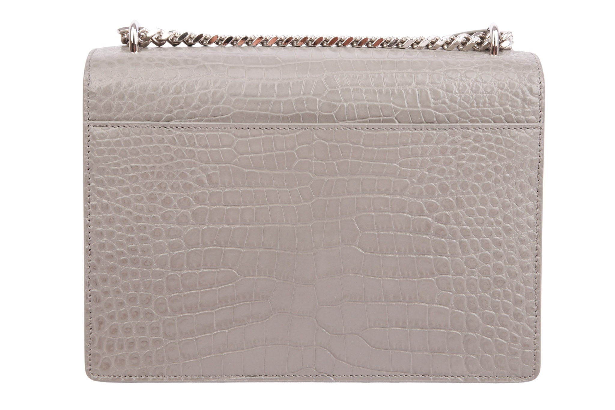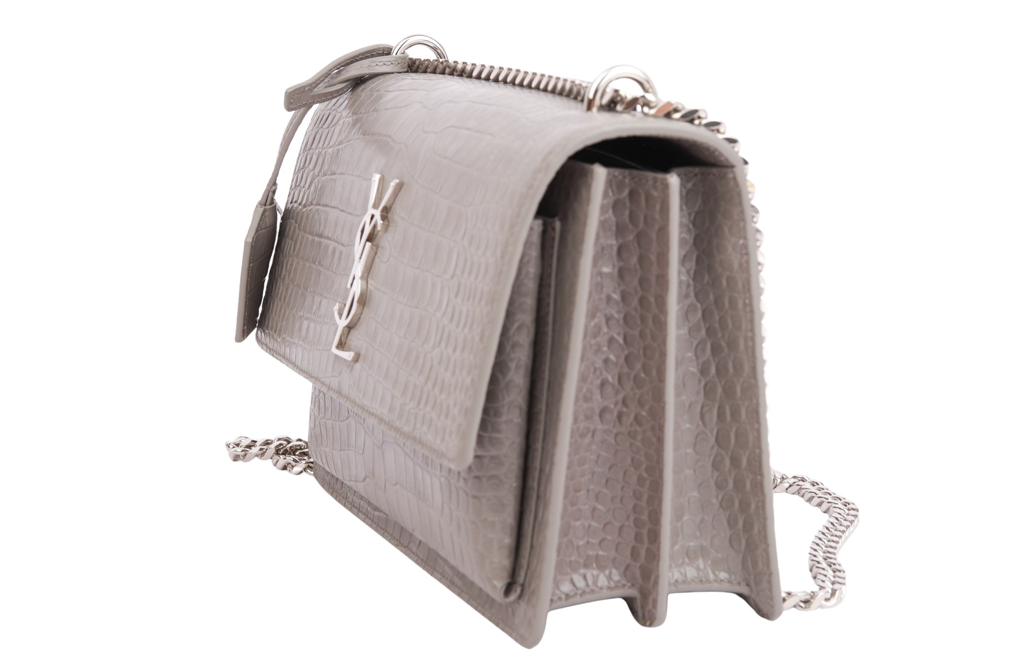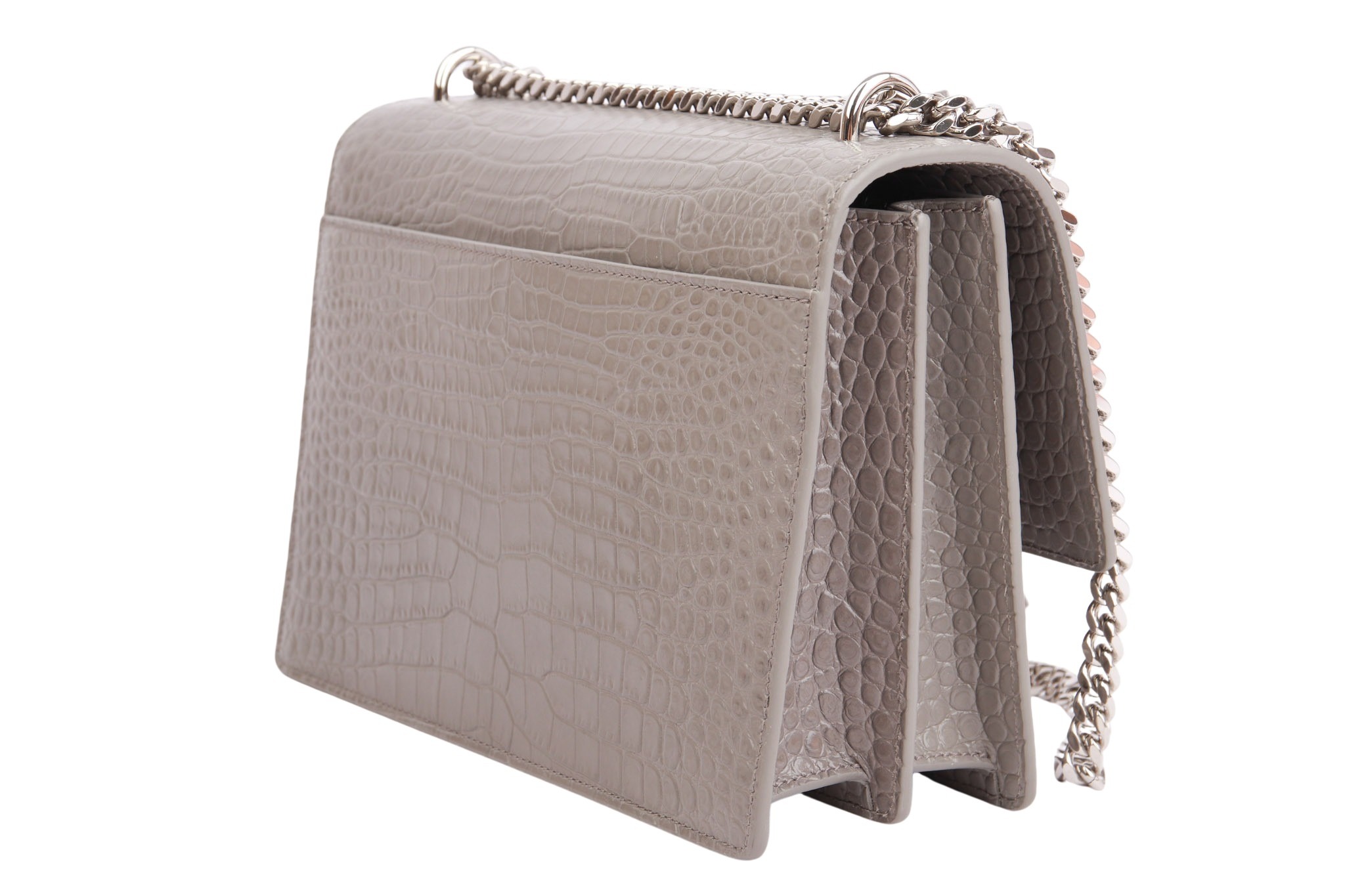 Die Saint Laurent Sunset in grauem Kroko-Look ist die perfekte Symbiose aus High-End-Ästhetik und Funktionalität: Während die strukturierte Form und das geprägte Glanzleder für ein luxuriöses, zeitloses Statement sorgen, macht das intelligente Akkordeon-Design mit mehreren Fächern sie zu einem echten Organisationstalent. Dank des variablen Kettenriemens verwandelt sie sich mühelos von einer lässigen Crossbody-Bag für den Tag in eine elegante Schultertasche für den Abend.