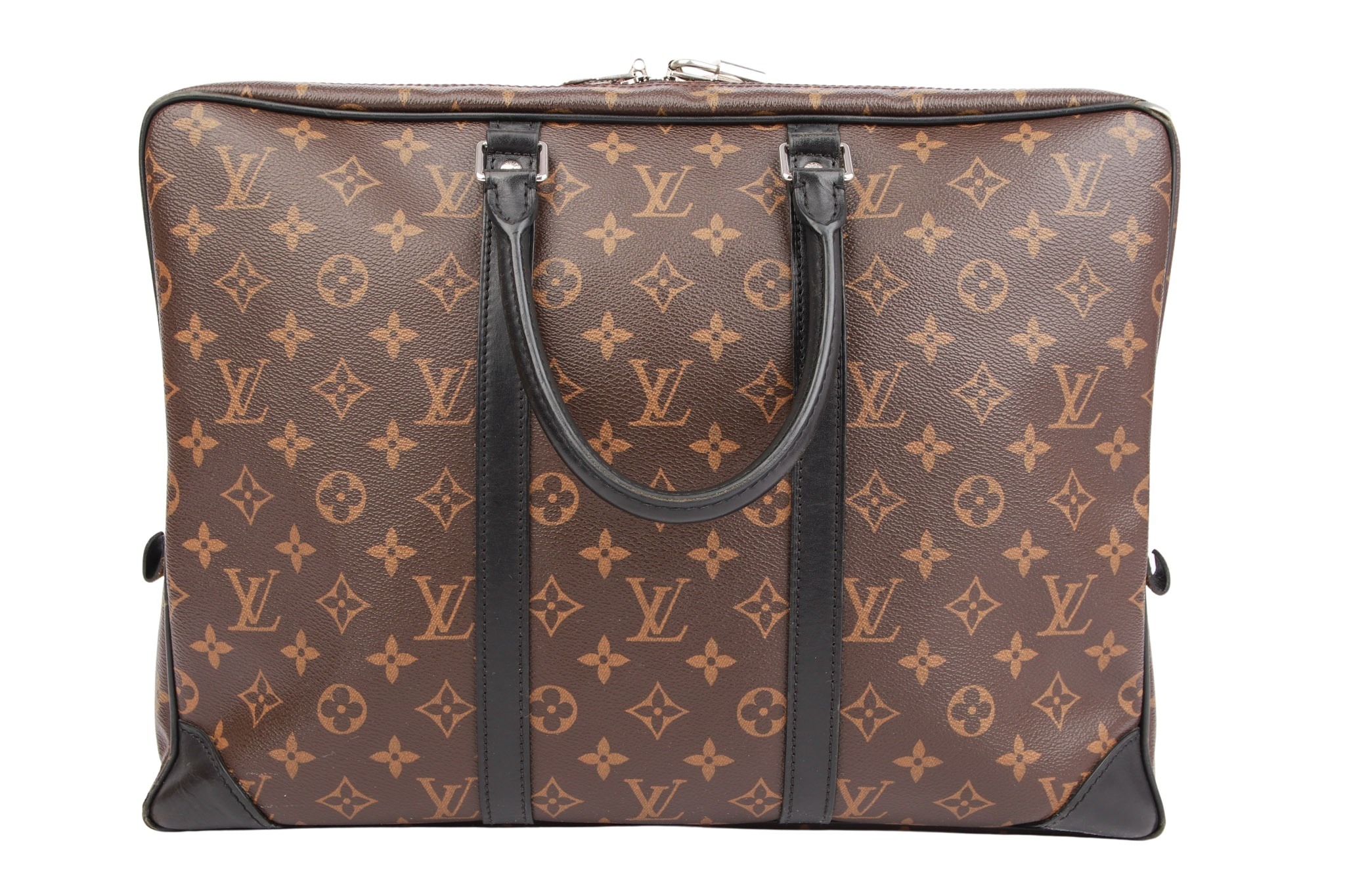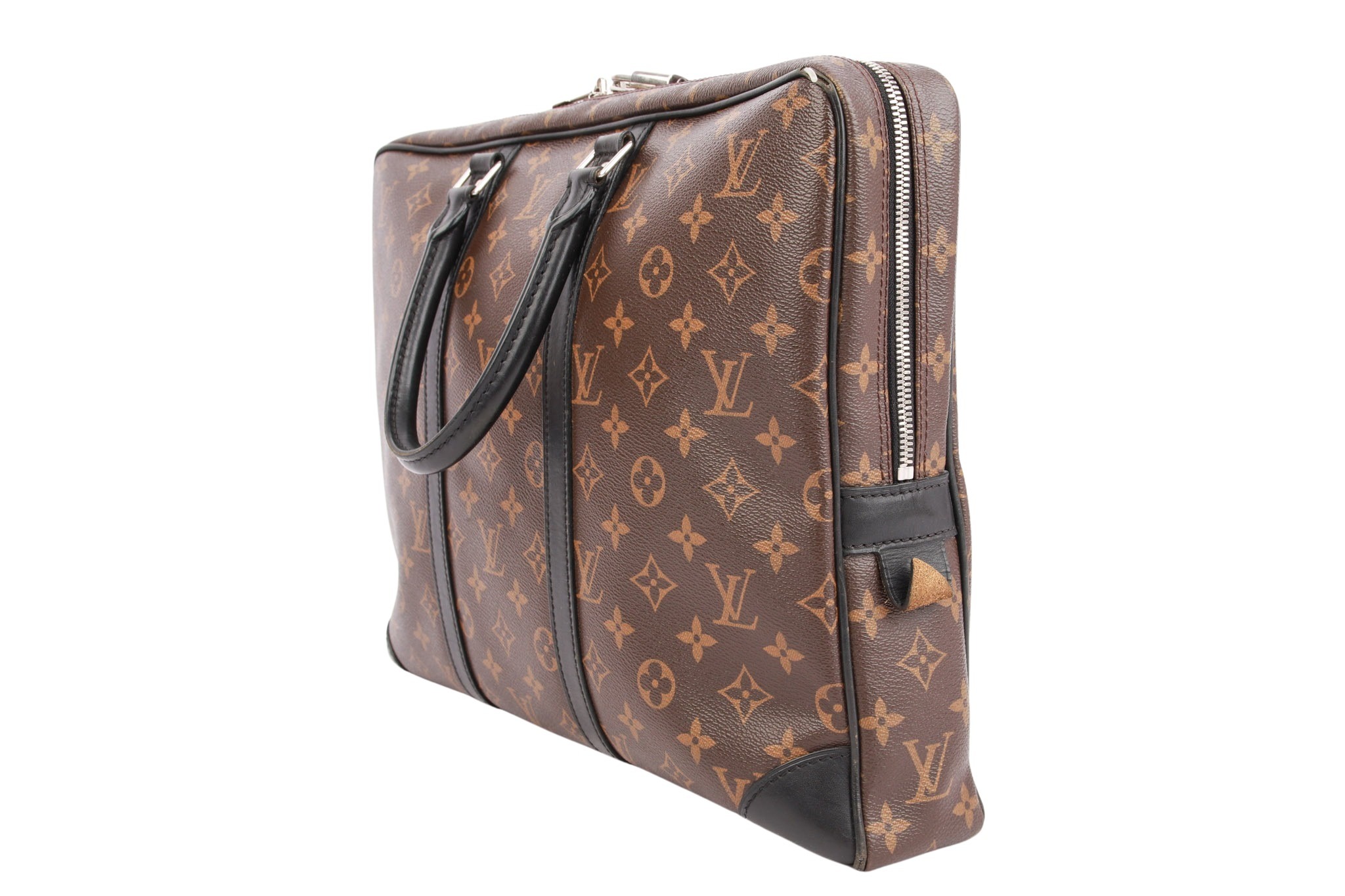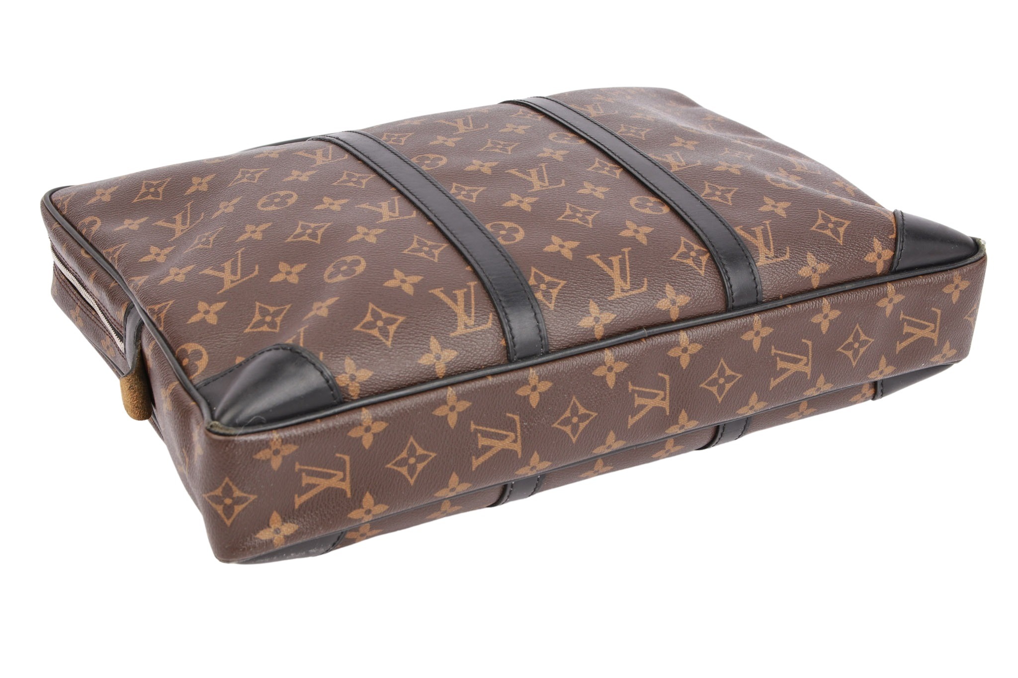 Diese stilvolle Aktentasche vereint das klassische LV-Monogram mit modernem, schwarzem Rindsleder und silberfarbenen Beschlägen. Dank des strapazierfähigen Canvas und des kompakten Designs ist sie der ideale Begleiter für den Business-Alltag. Das Innenfach bietet Platz für Dokumente und einen 13-Zoll-Laptop. Ein zeitloses Essential, das Funktionalität mit maskuliner Eleganz verbindet.