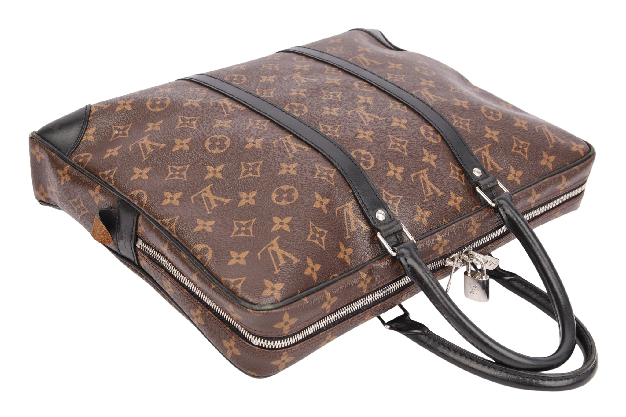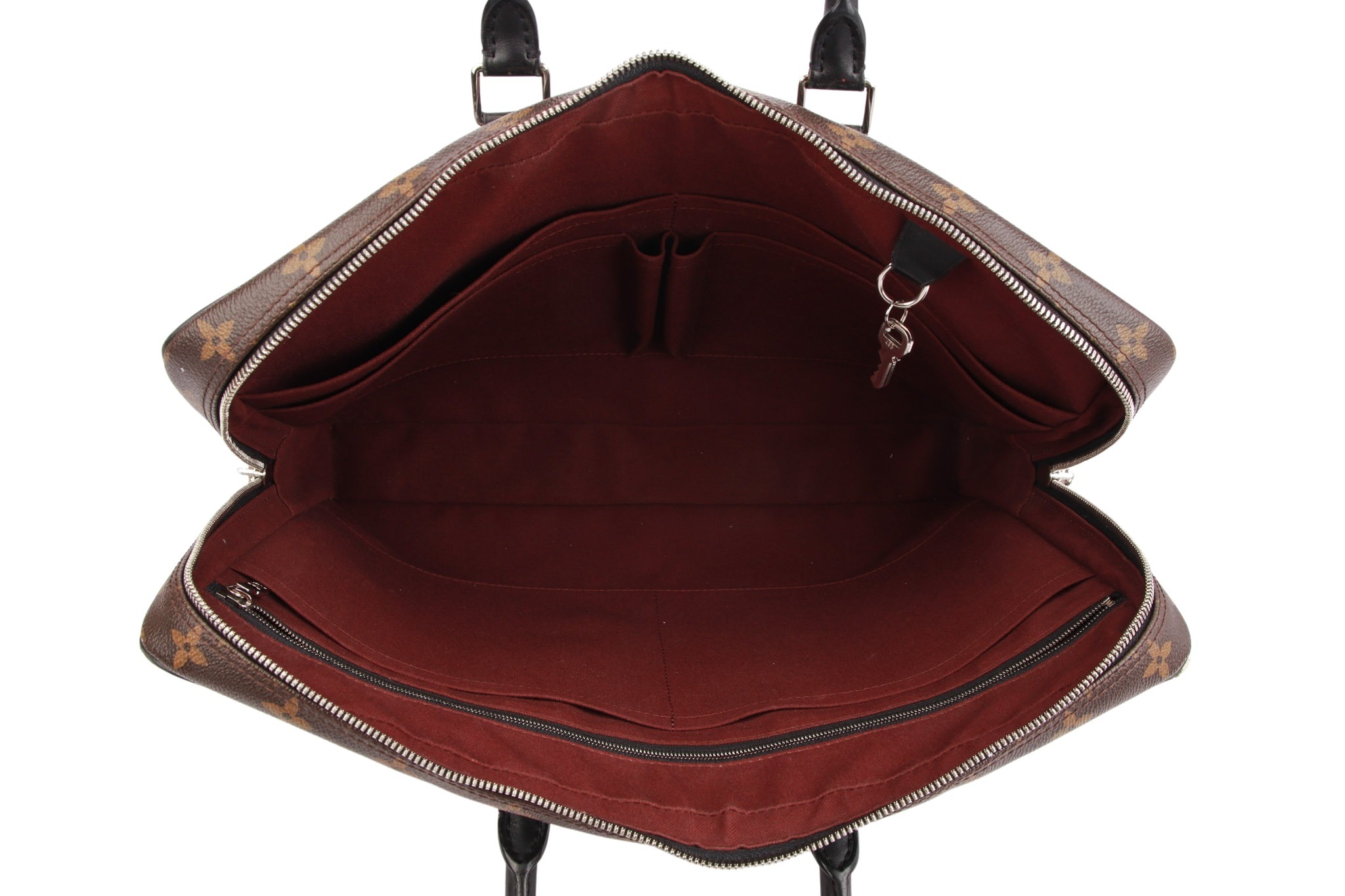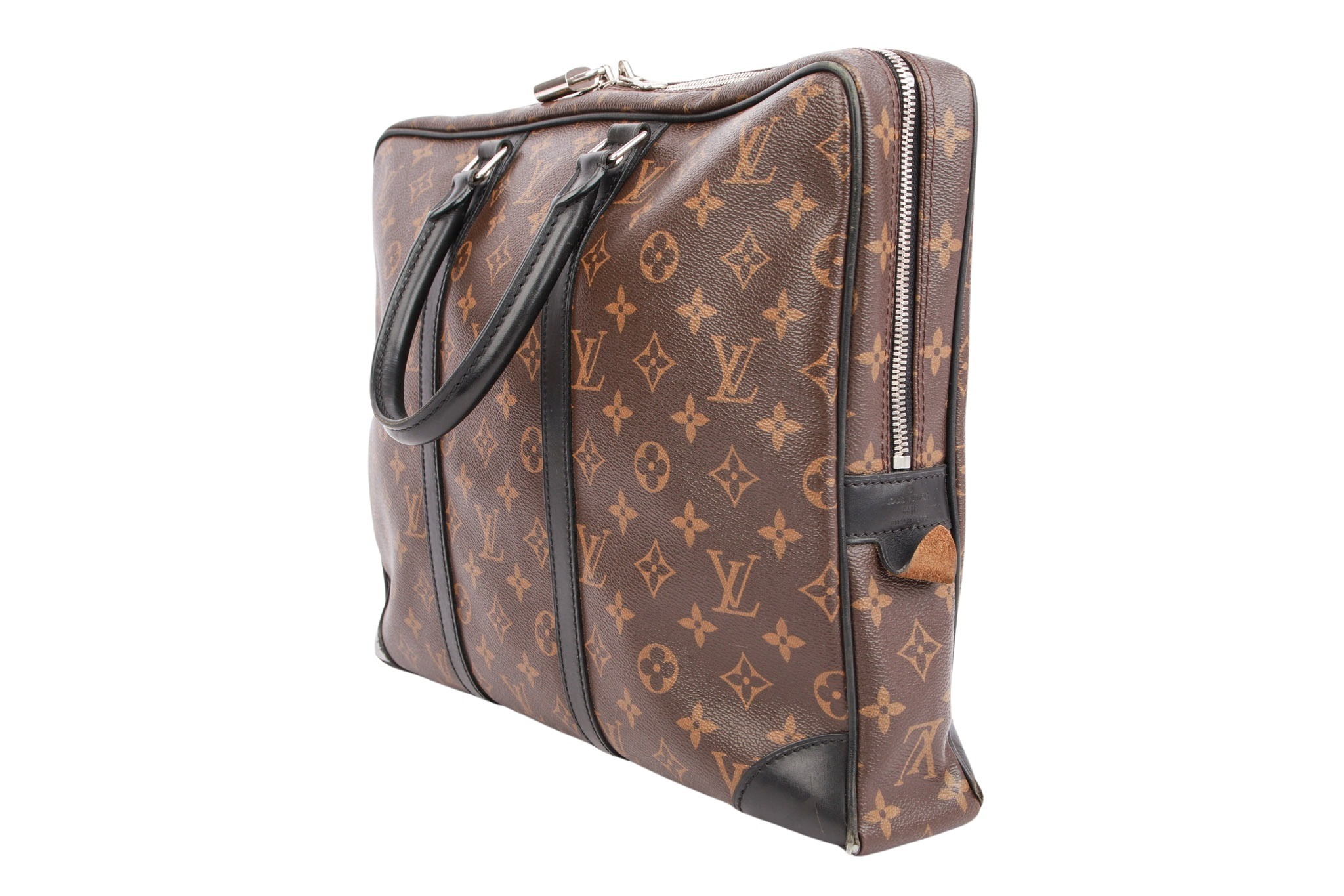 Diese stilvolle Aktentasche vereint das klassische LV-Monogram mit modernem, schwarzem Rindsleder und silberfarbenen Beschlägen. Dank des strapazierfähigen Canvas und des kompakten Designs ist sie der ideale Begleiter für den Business-Alltag. Das Innenfach bietet Platz für Dokumente und einen 13-Zoll-Laptop. Ein zeitloses Essential, das Funktionalität mit maskuliner Eleganz verbindet.