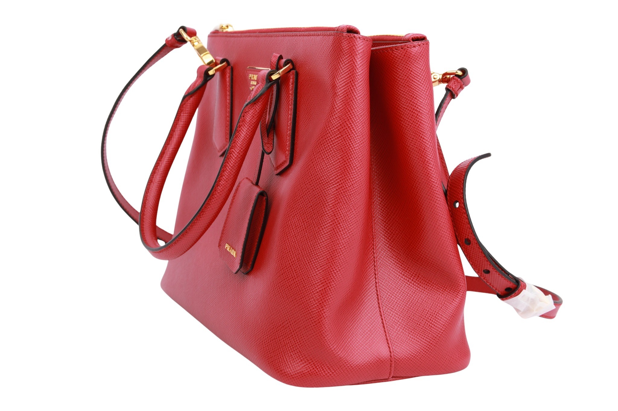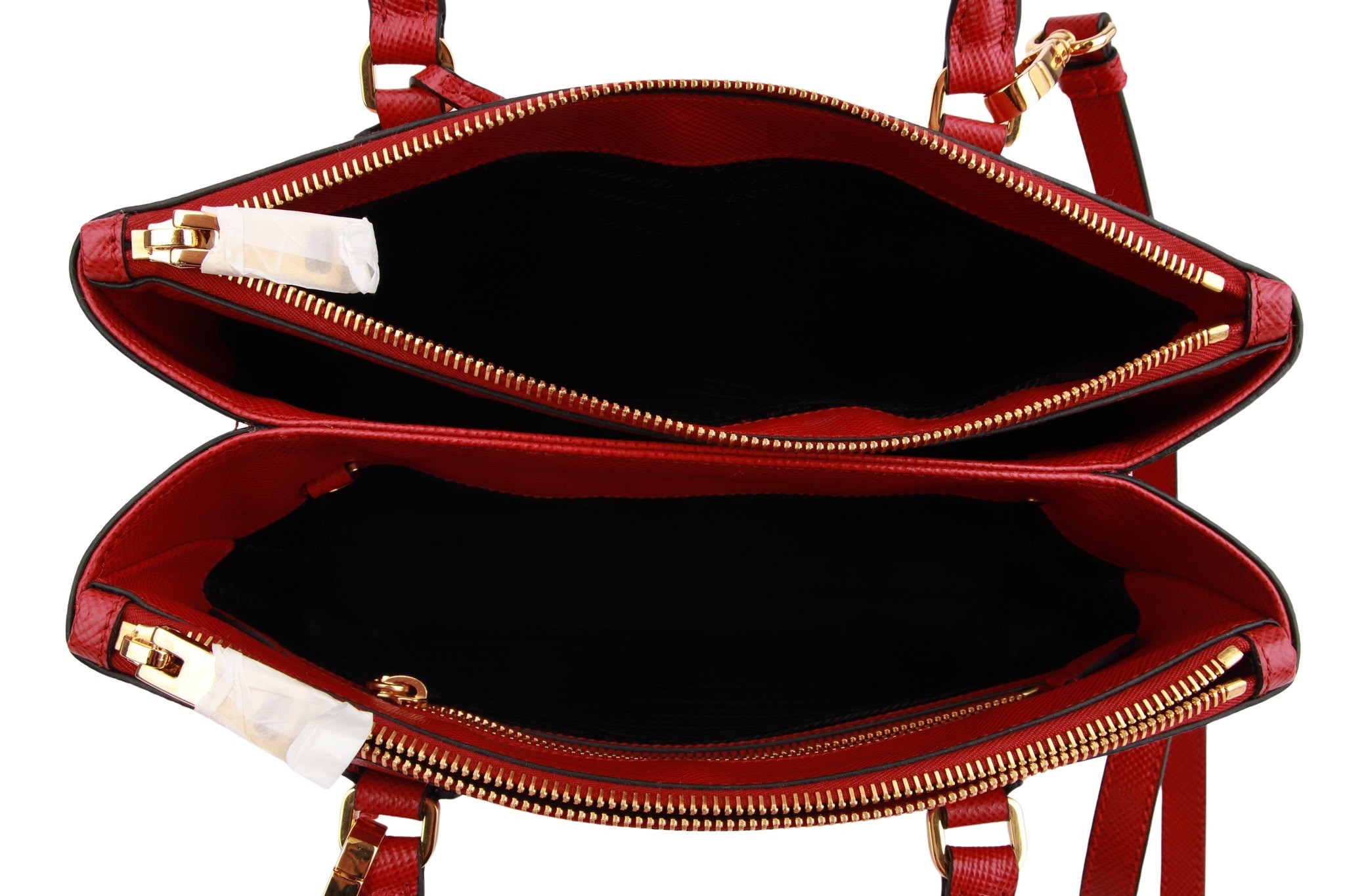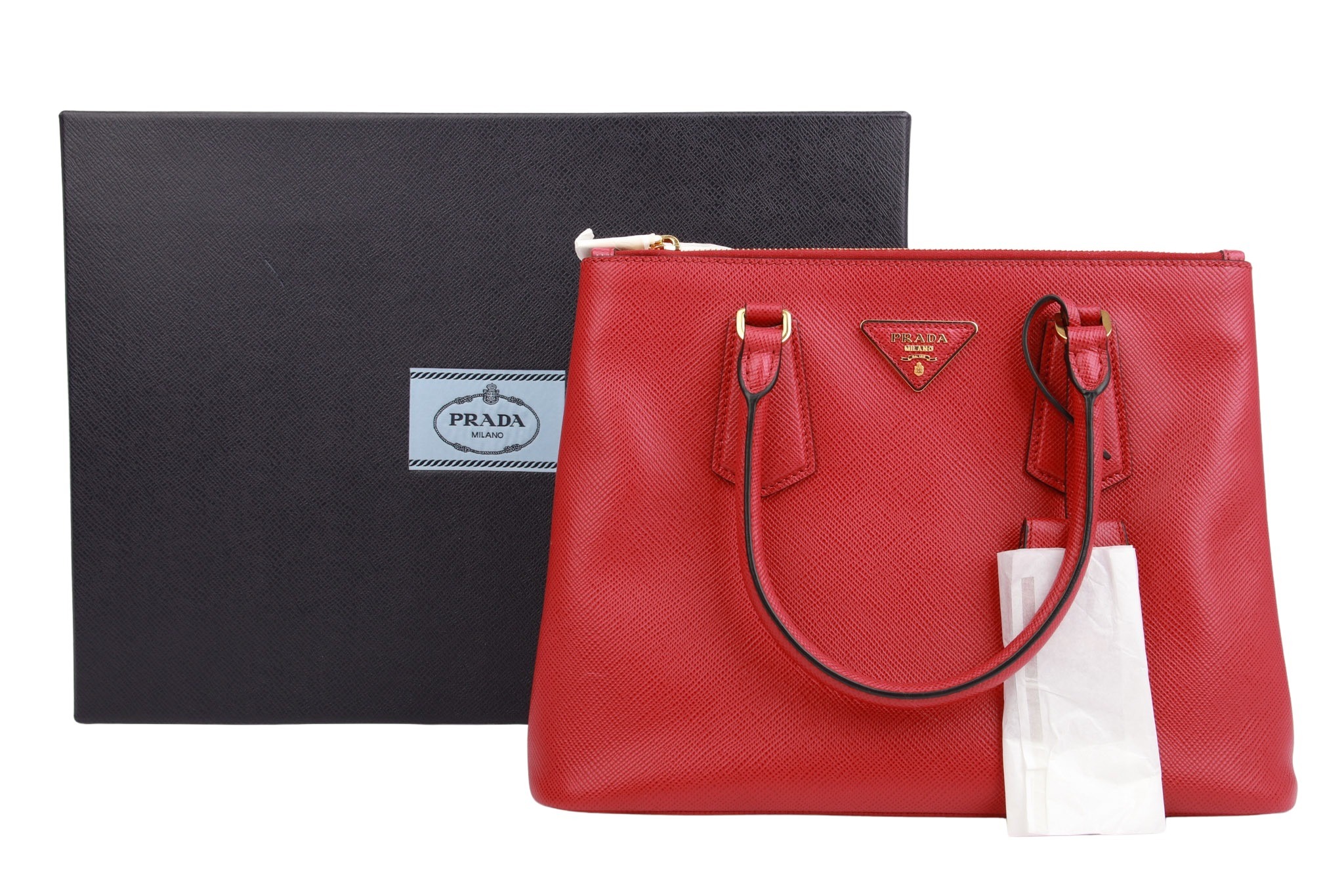 Elegante Handtasche aus hochwertigem Saffiano-Leder in einem kräftigen Rot. Die Tasche besticht durch ihr zeitloses Design, goldfarbene Details und das ikonische Prada-Logo. Perfekt für stilbewusste Auftritte – ob im Alltag oder zu besonderen Anlässen.