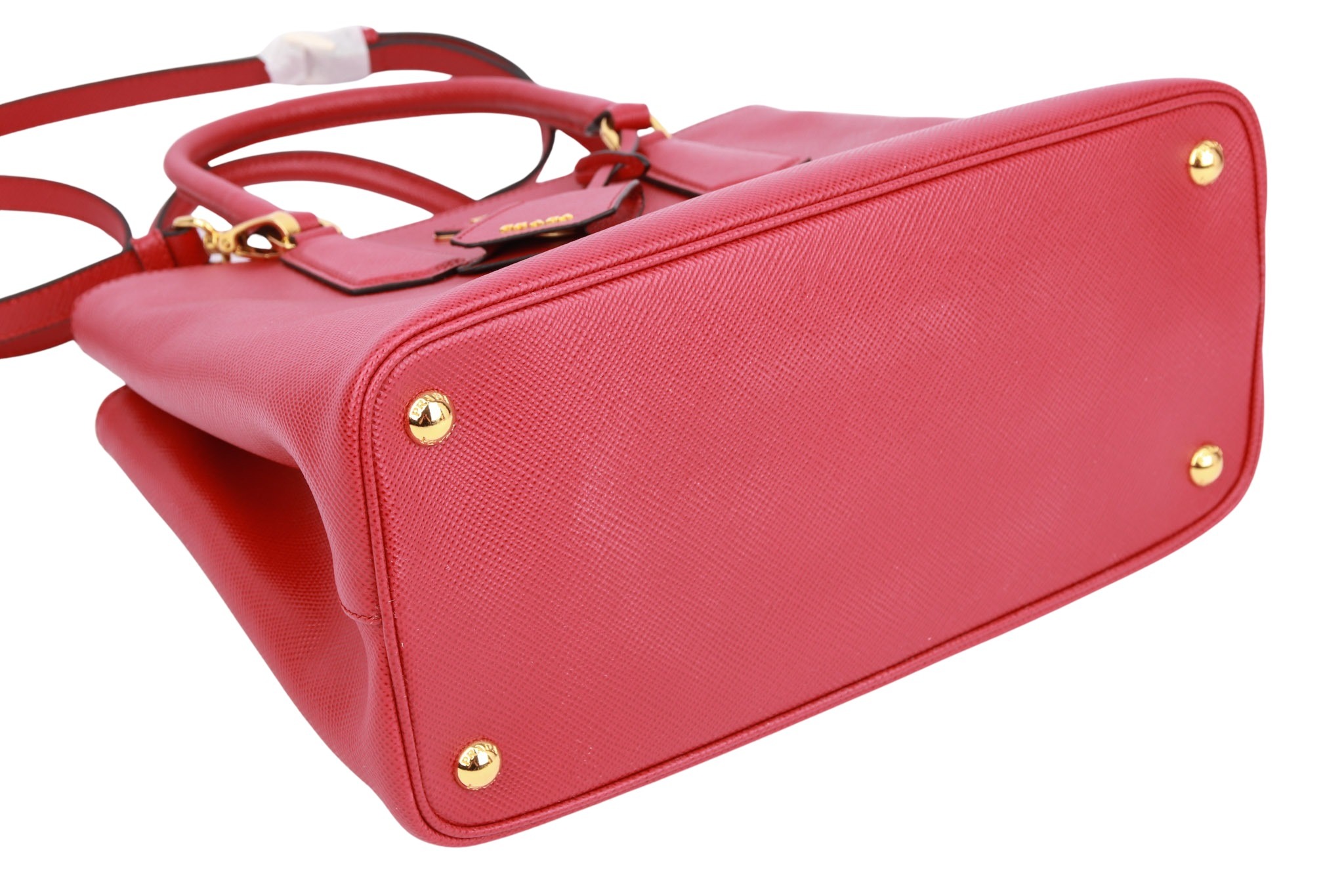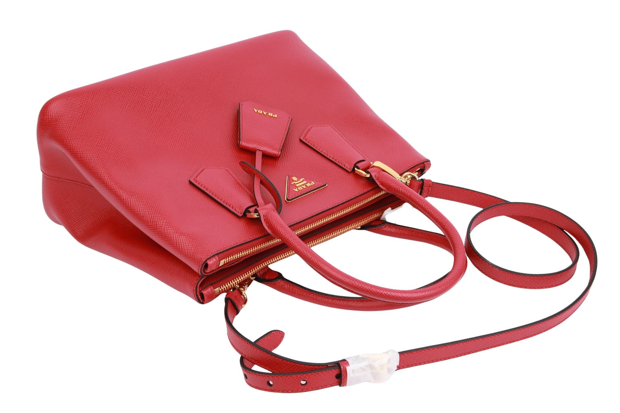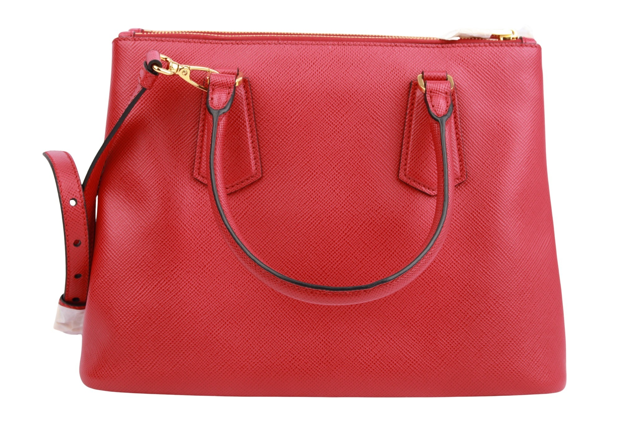 Elegante Handtasche aus hochwertigem Saffiano-Leder in einem kräftigen Rot. Die Tasche besticht durch ihr zeitloses Design, goldfarbene Details und das ikonische Prada-Logo. Perfekt für stilbewusste Auftritte – ob im Alltag oder zu besonderen Anlässen.