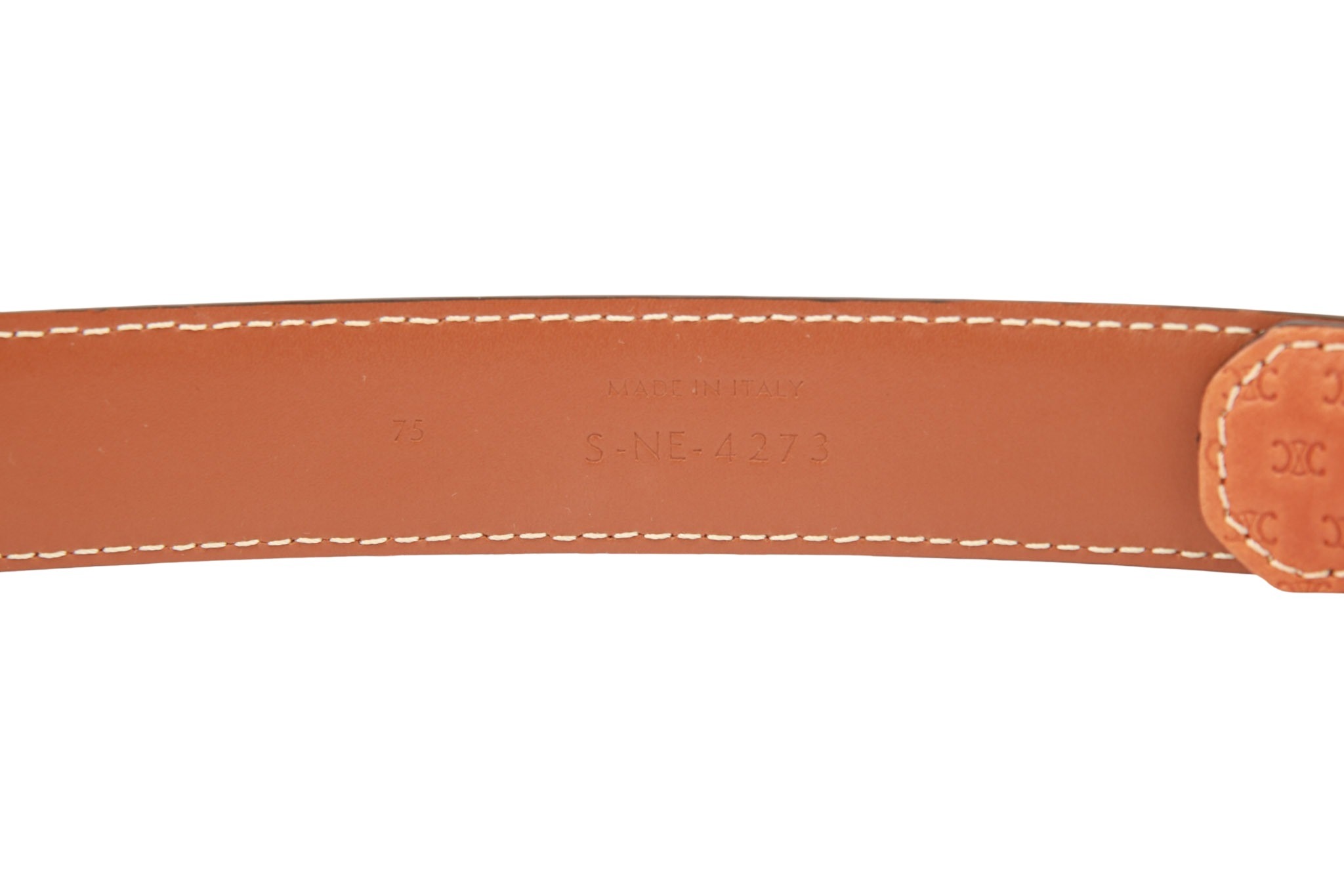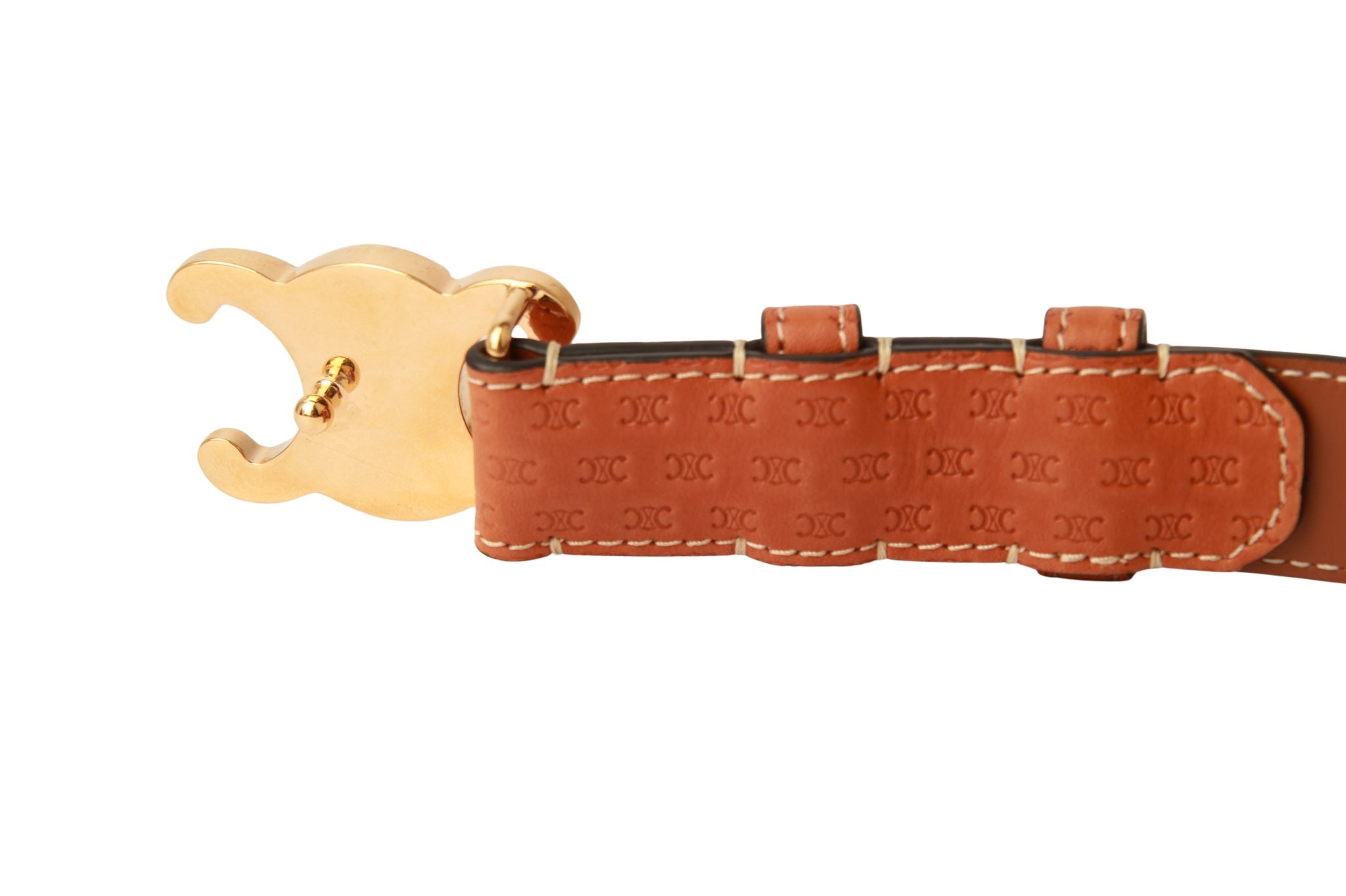 The CÉLINE Triomphe belt in size 75 is made of high-quality, smooth calfskin in a classic brown shade. The elegant, gold-tone Triomphe buckle gives the belt a timeless and sophisticated look, typical of the clean, luxurious design of the House of Céline.